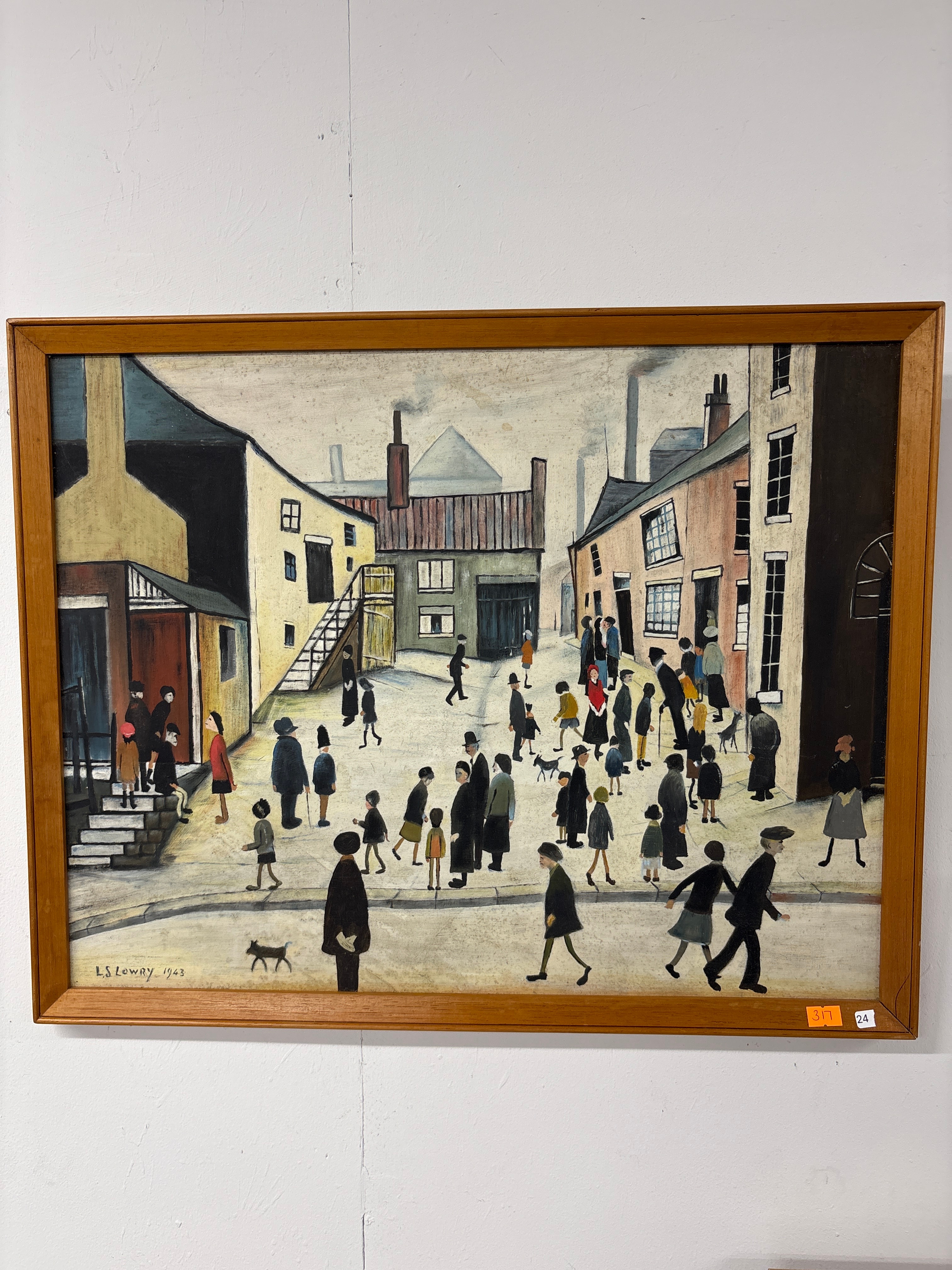 L.S. Lowry (1887-1976), A Village Square, oil on canvas or board, dated 1943. The artwork depicts a bustling industrial street scene populated by numerous stylized, elongated human figures, often referred to as ‘matchstick figures, ‘ set amidst an urban landscape with factories and buildings under a pale sky. The predominant color palette is muted, featuring greys, browns, yellows, and limited accents of red and blue. The painting is presented in a simple wooden frame. In the lower left corner, the signature and date ‘L.S. LOWRY 1943’ are clearly visible. On the lower right of the frame, there are two labels with numbers, an orange one displaying ‘317’ and a white one with ’24’, likely representing auction or inventory identifiers.