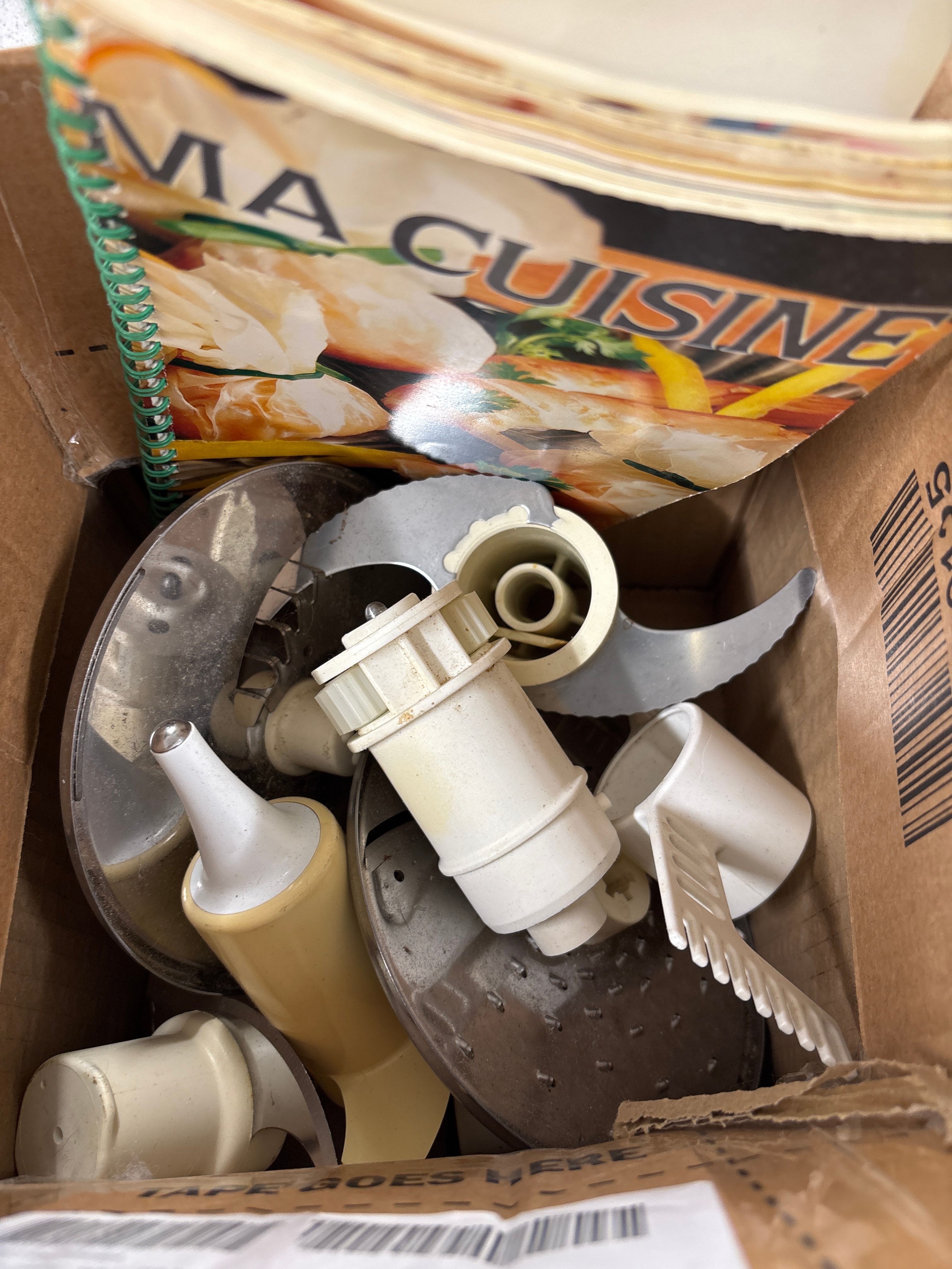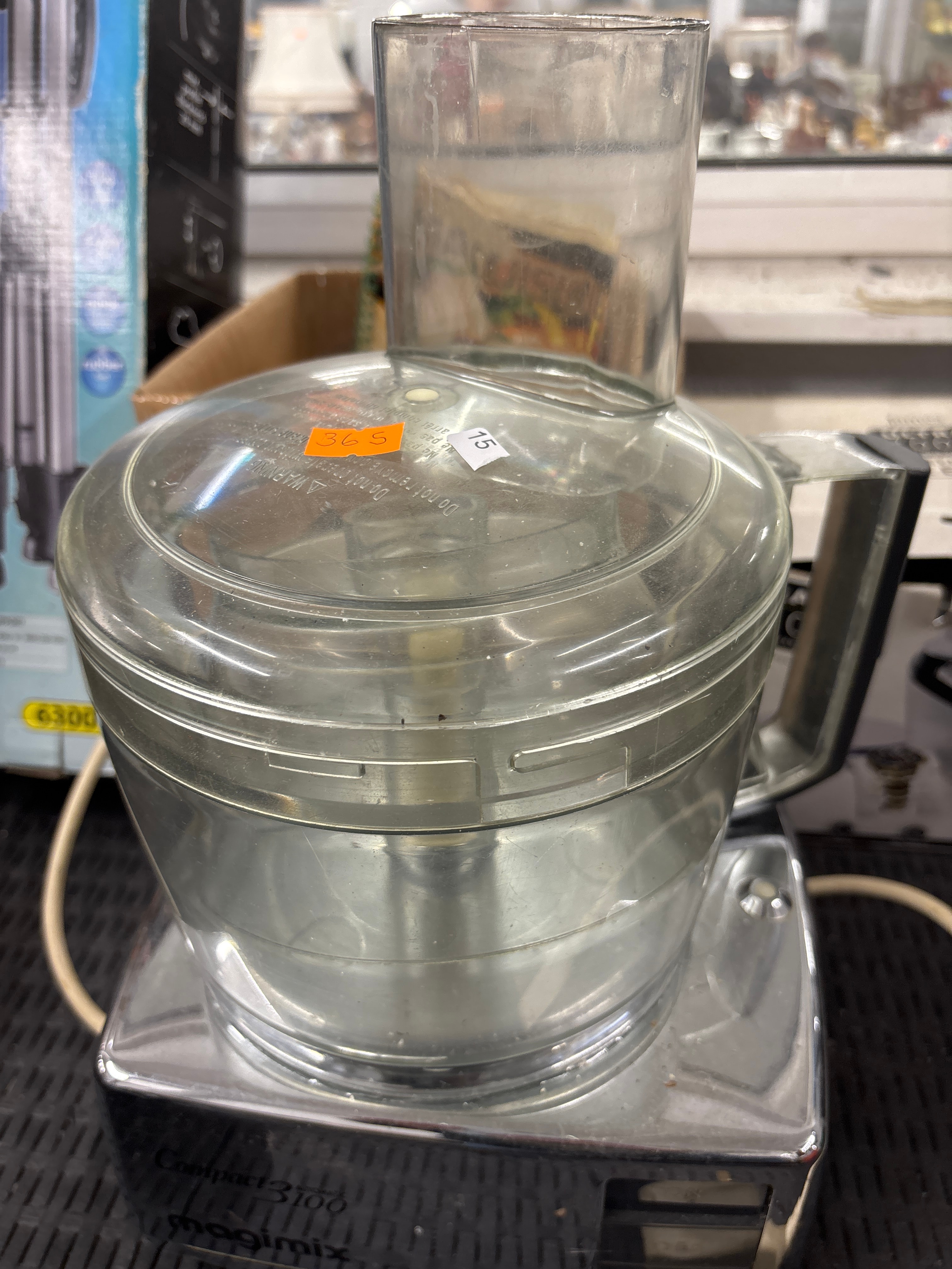 A vintage Magimix Compact 3100 food processor, featuring a chrome-plated metal base and clear plastic bowl, lid, and pusher. The lid bears the marking “MADE IN FRANCE.” A mid-to-late 20th-century model, it is accompanied by a collection of various stainless steel blades and white/cream plastic attachments, alongside a spiral-bound cookbook titled “MA CUISINE.”