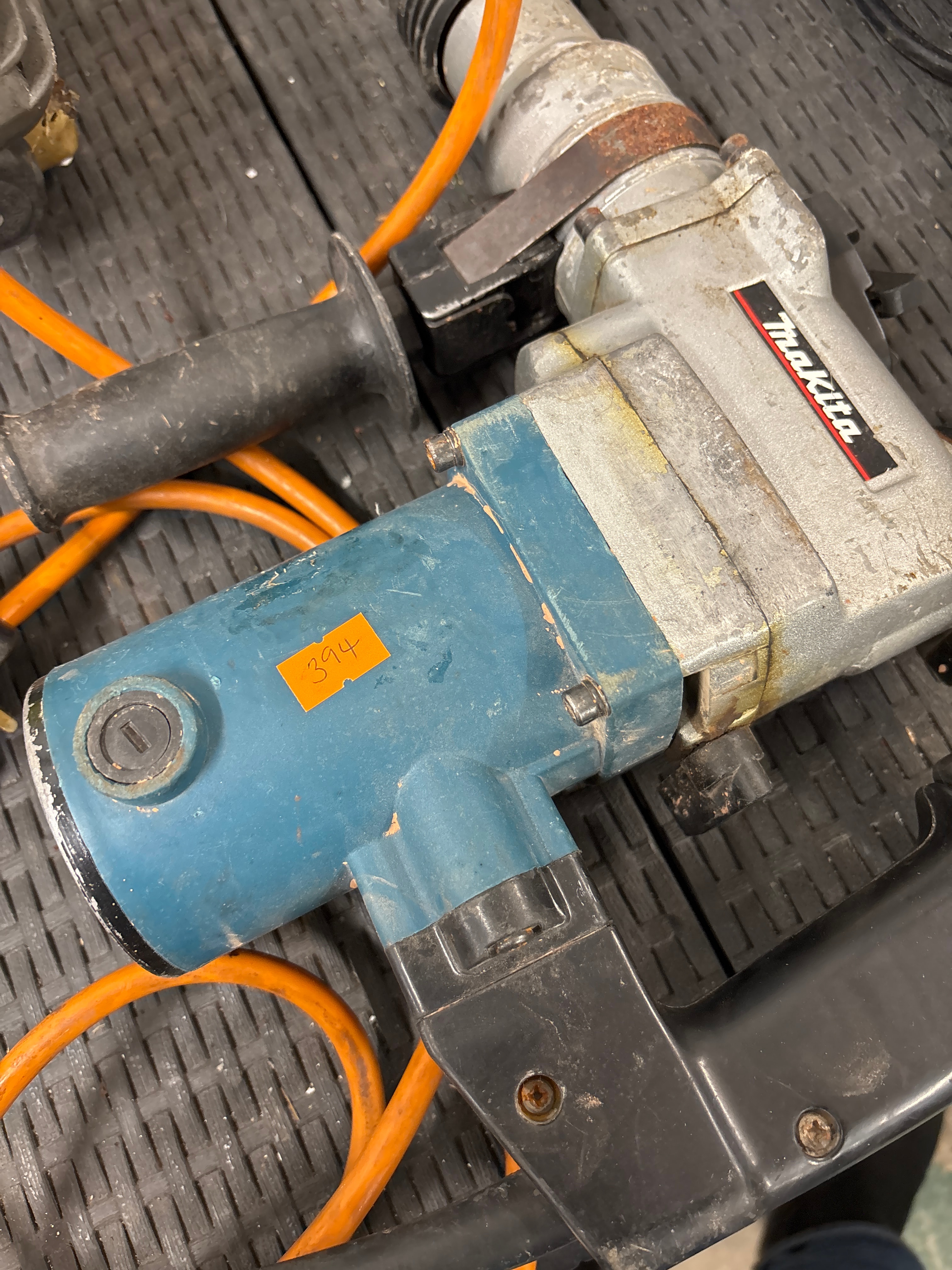 A Makita HK1810 Power Scraper. This electric power tool features a silver-toned metal housing and a two-tone body predominantly composed of blue plastic and black plastic handle components, connected by an orange insulated power cord. The brand “Makita” is prominently displayed on the silver housing, underscored by a red stripe. An orange rectangular sticker with the handwritten numbers “394” is affixed to the blue plastic body. This model is also referred to as a chipping hammer.