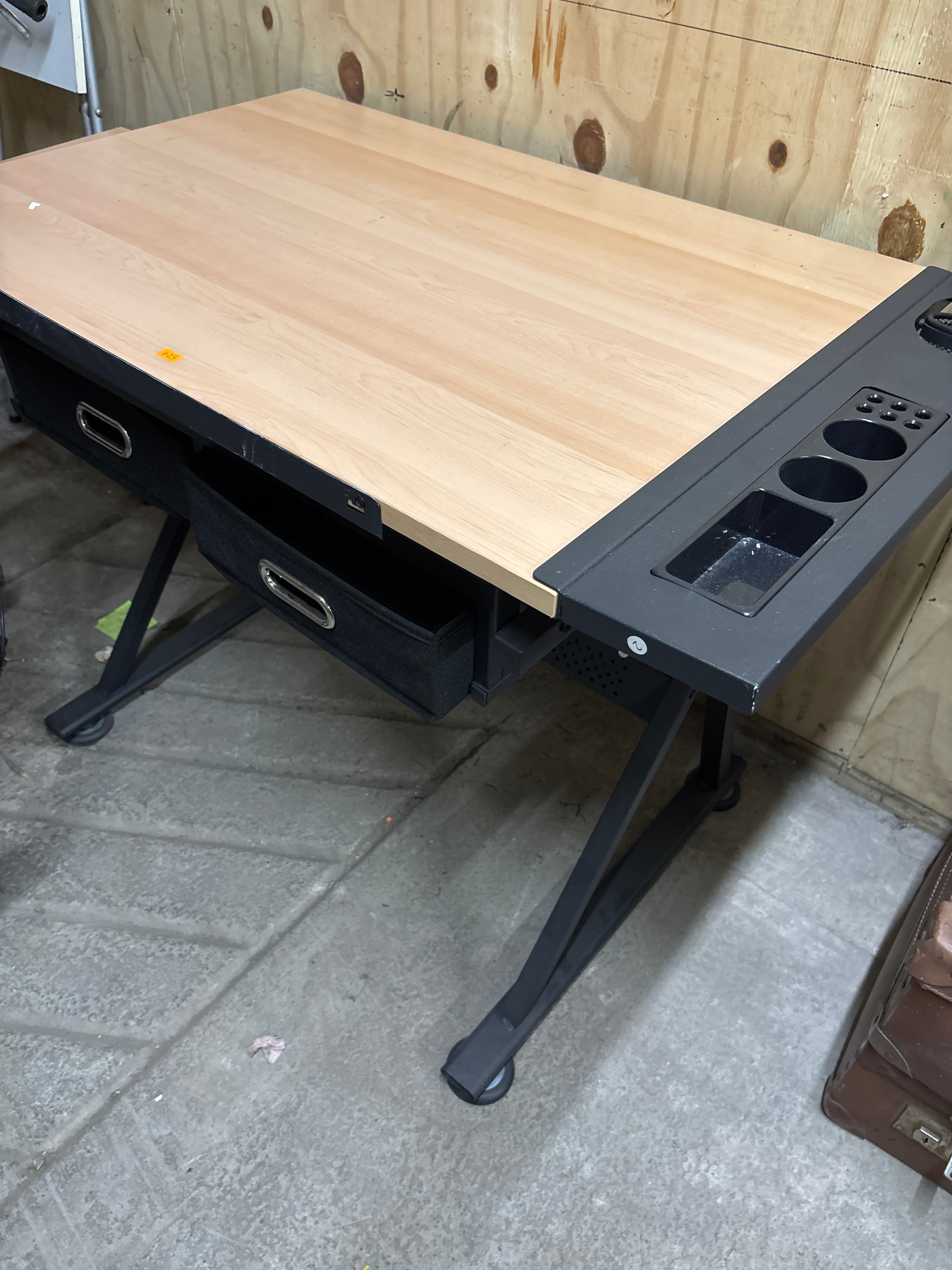 A modern drafting or craft desk featuring a light-toned, wood-look laminate main tabletop segment. The desk includes a fixed black plastic side panel with integrated organizational compartments, comprising two cup holders, a rectangular tray, and smaller circular indentations. It is supported by a black painted metal X-frame base equipped with adjustable feet/glides. Two black fabric drawer-style storage bins, each fitted with an oval-shaped metal pull handle, are suspended beneath the main tabletop. The design suggests a potentially adjustable main tabletop section, though it is currently presented in a flat position. An orange sticker marked “4-23” is visible on the tabletop.