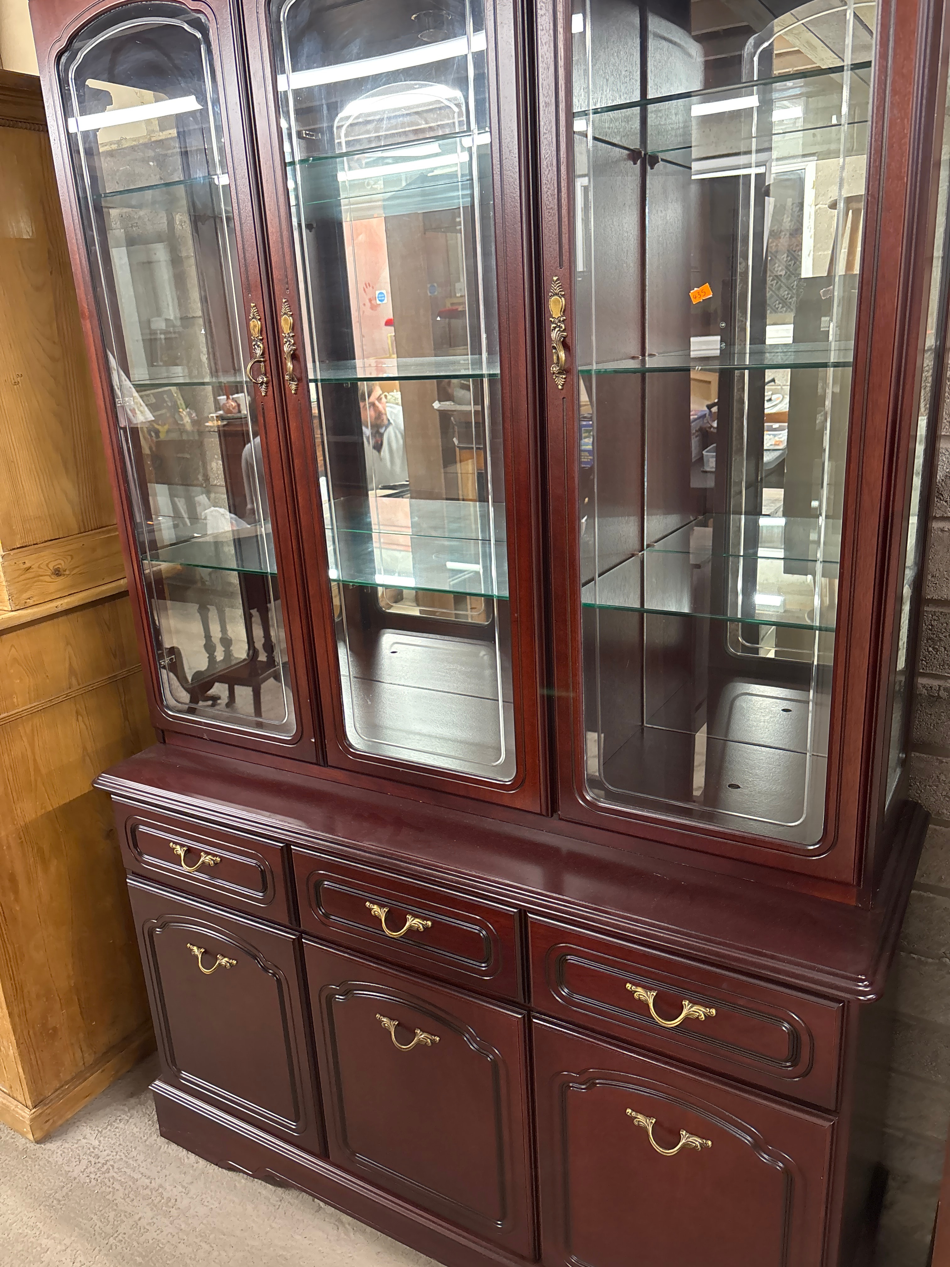 A Drexel Heritage China Cabinet and Hutch, presented in a two-piece traditional style. Constructed from wood or wood composite with a dark reddish-brown finish. The upper hutch features three separate compartments, each with an arched glass-front door, multiple adjustable glass shelves, and a mirrored interior. The lower section functions as a credenza, fitted with three drawers centrally positioned above three cabinet doors. All drawers and doors are adorned with ornate brass-toned bail pull hardware. An orange sticker marked ‘435’ is visible on an interior shelf in the upper right compartment.