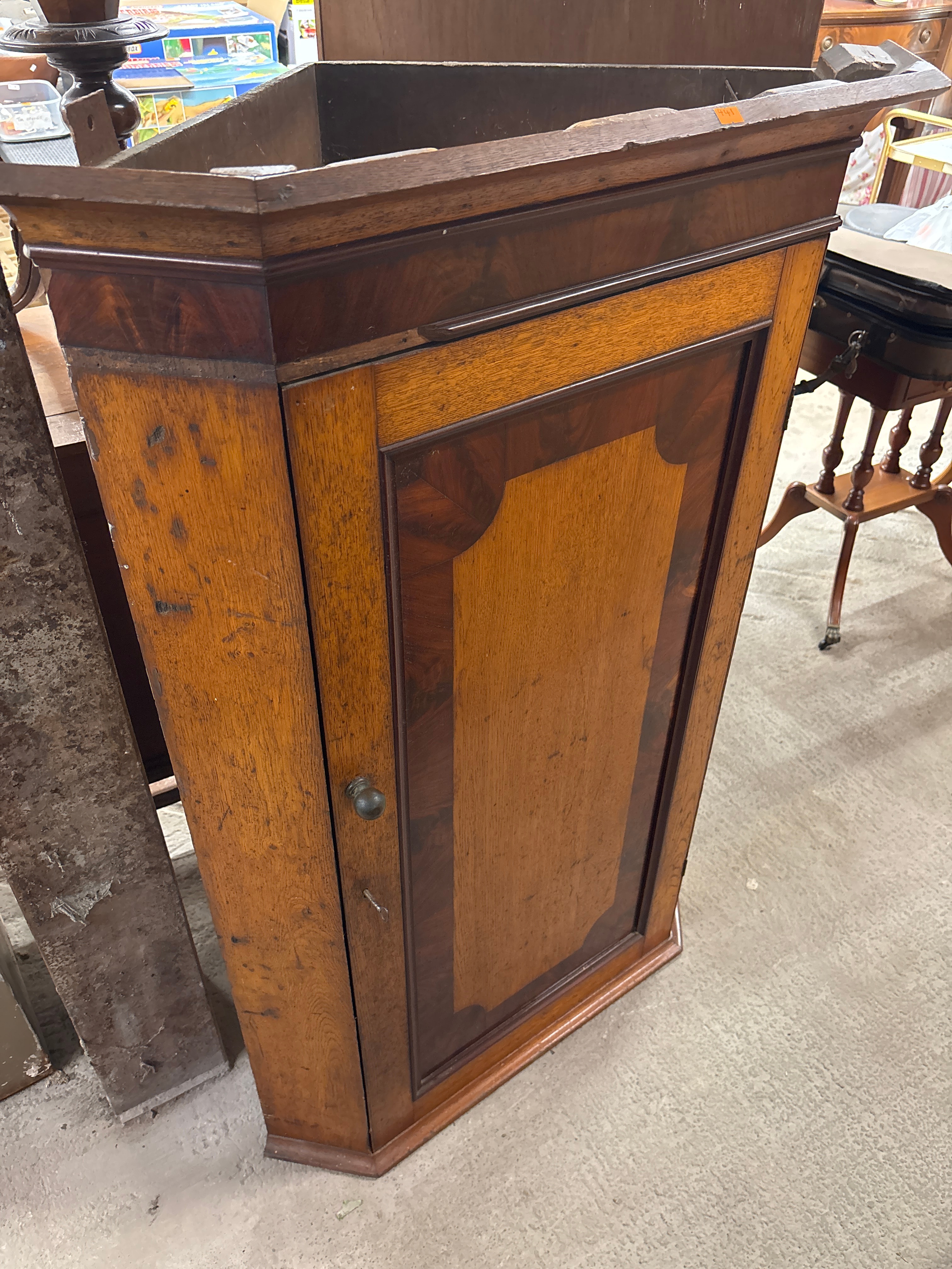 A traditional wooden corner cupboard or cabinet, dating to the 19th century. The piece features a single, front-opening door with a prominent central panel of lighter-toned wood, likely oak, framed by a contrasting, darker-toned banding, likely mahogany or rosewood veneer. The top section is open, forming a deep recess with a molded cornice, and the lower portion rests on a plinth base. Constructed primarily from wood, exhibiting varying grains and finishes, the cupboard includes a simple spherical metal knob and a key in the lock. An orange sticker with the number “441” is affixed to the interior upper edge.