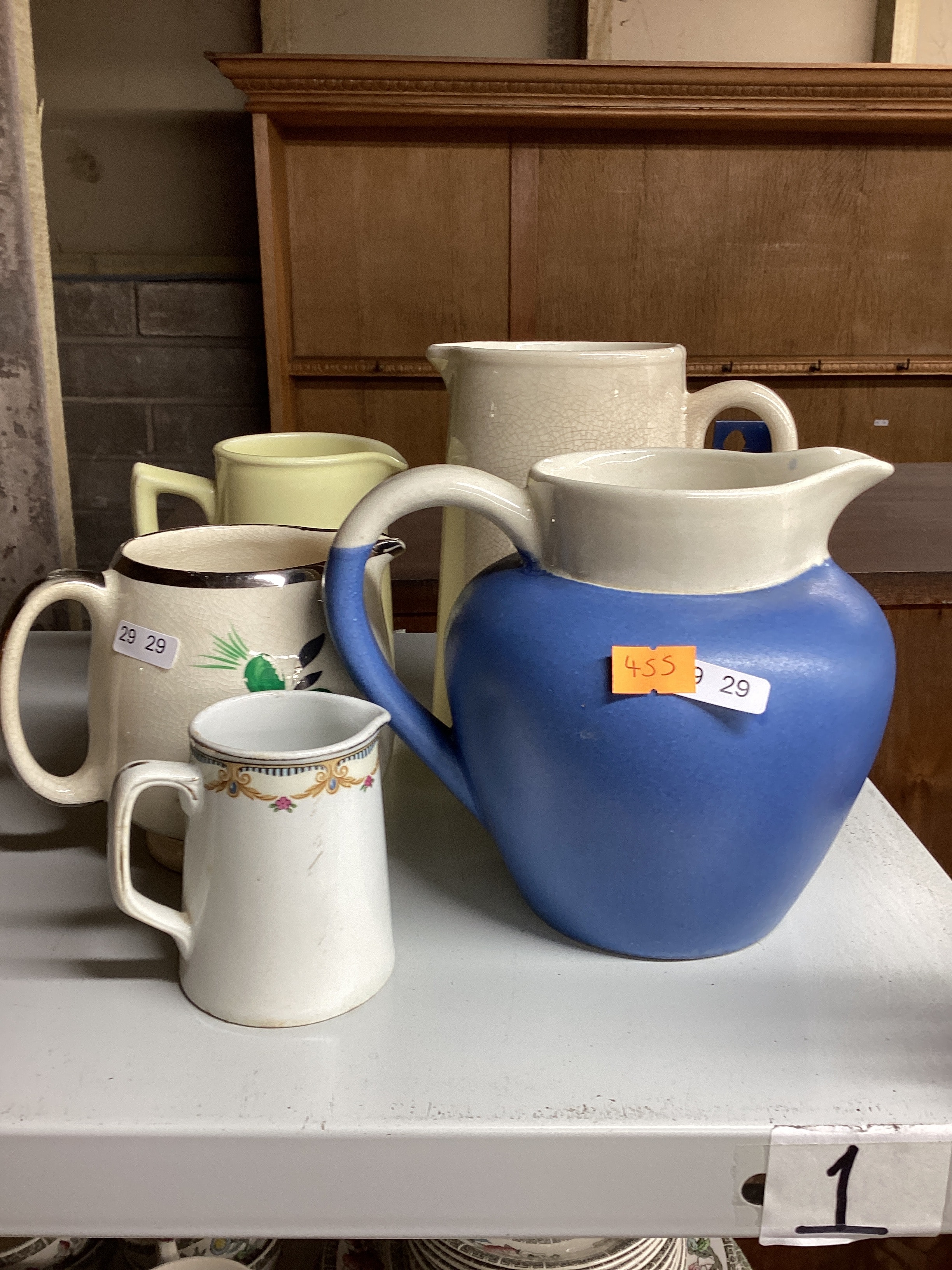 A collection of five vintage ceramic jugs, several examples attributed to Devonmoor Pottery. The group includes a prominent two-tone blue and white pitcher with a matte lower body and glossy upper half, characteristic of mid-century Devonmoor design, bearing numerical labels ‘455’ and ’29’. Also present are simpler cream and pale yellow utilitarian forms, one of which is a smaller white pitcher adorned with a decorative gilt band featuring floral and blue jewel motifs. A cream-colored jug displays a distinct green and black abstract pattern and evident surface crazing, marked ’29 29′. A taller, cream-colored pitcher also exhibits surface crazing. All pieces are crafted from glazed earthenware or stoneware.