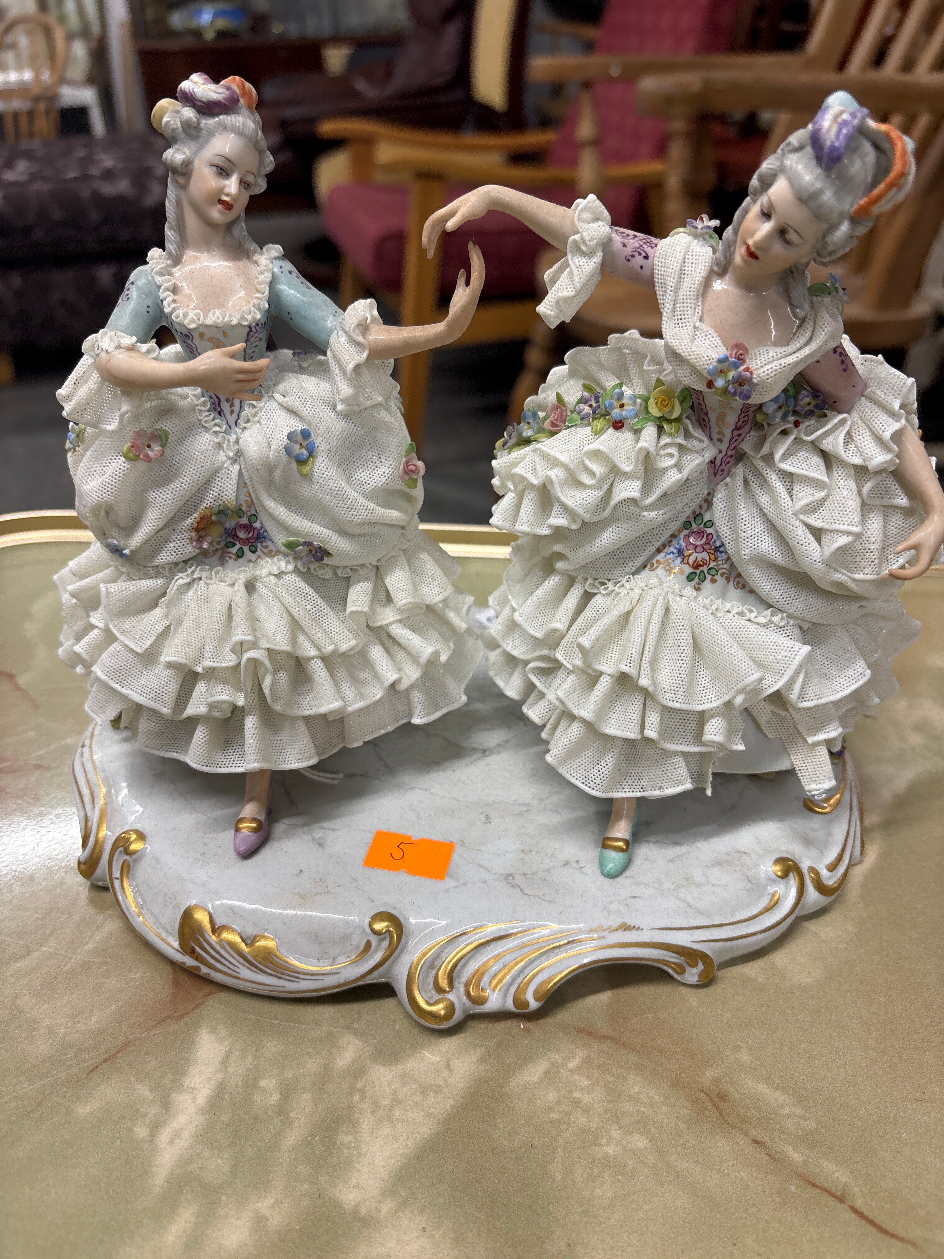 A Dresden Lace porcelain figural group depicting two female dancers, executed in a Rococo Revival style. The figures are characterized by their elaborate 18th-century-inspired costumes, powdered wigs, and ruffled dresses featuring extensive applied “Dresden lace” porcelain work and floral accents. The figures stand on an ornate, white porcelain base with gilded scrollwork. The material combines glazed and unglazed (bisque) porcelain, exhibiting fine detail.
