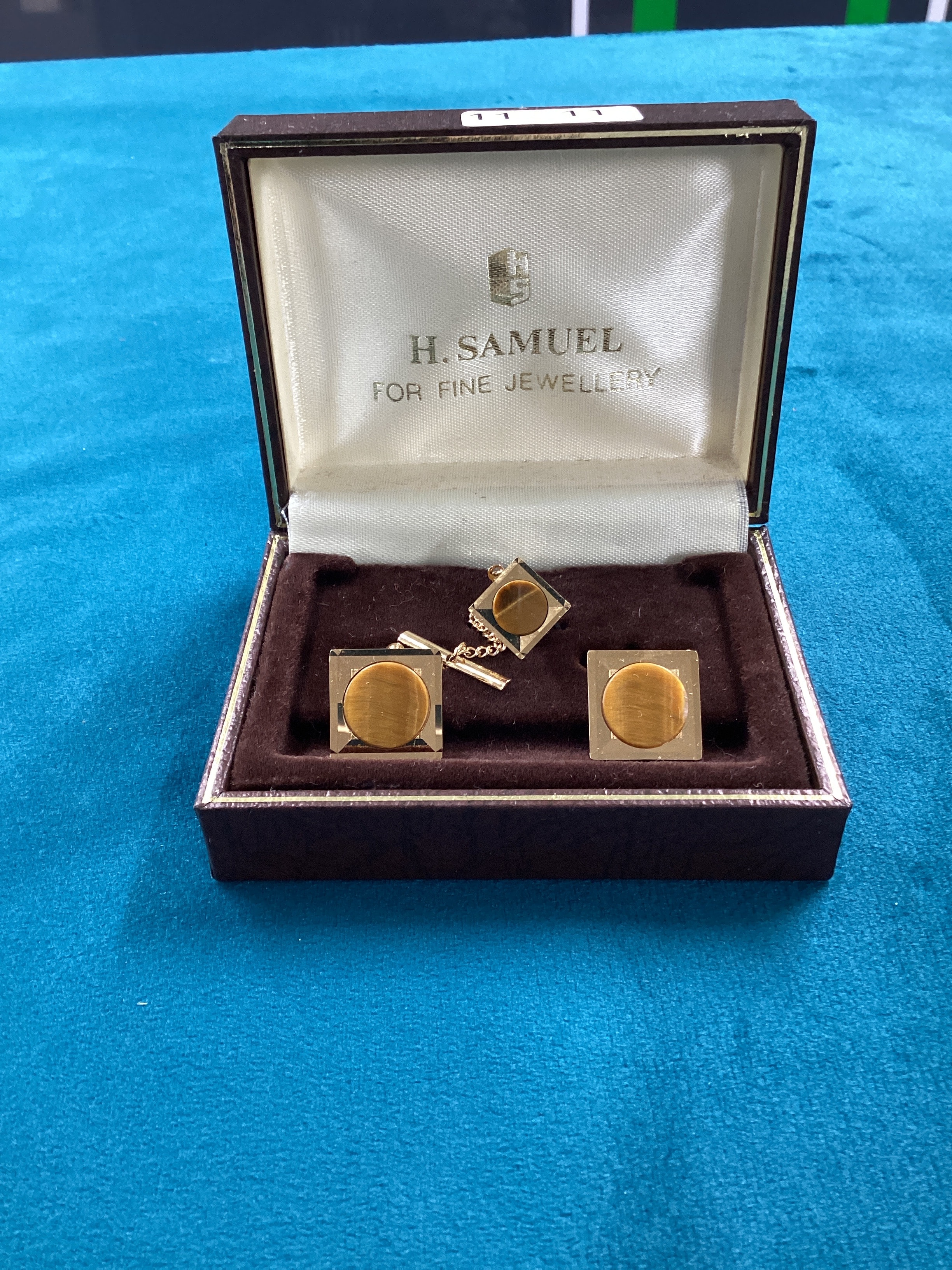 A pair of cufflinks and a matching tie tack, retailed by H. Samuel. Presented in its original dark brown hinged case with gold-toned trim. The set comprises two cufflinks and one tie tack, all featuring square, gold-toned metal frames with central round cabochons exhibiting chatoyancy, consistent with tiger’s eye. The interior of the box lid is lined with off-white satin or silk, printed with ‘H. SAMUEL’ and ‘FOR FINE JEWELLERY,’ beneath a small emblem. The base interior is a fitted dark brown velvet.