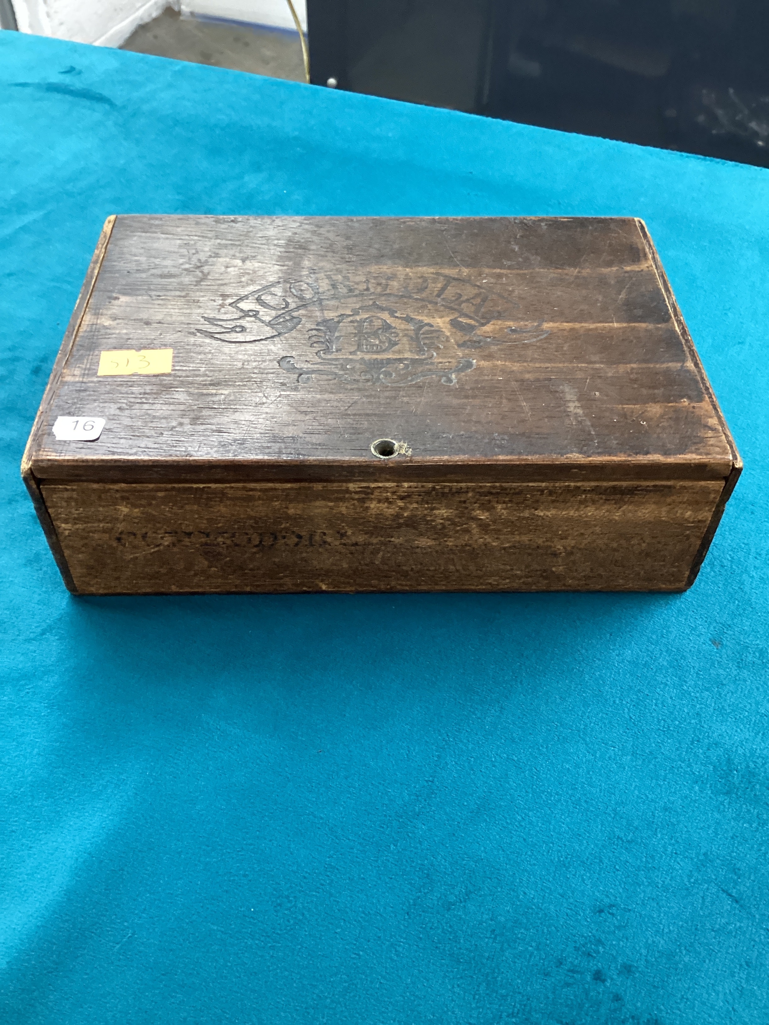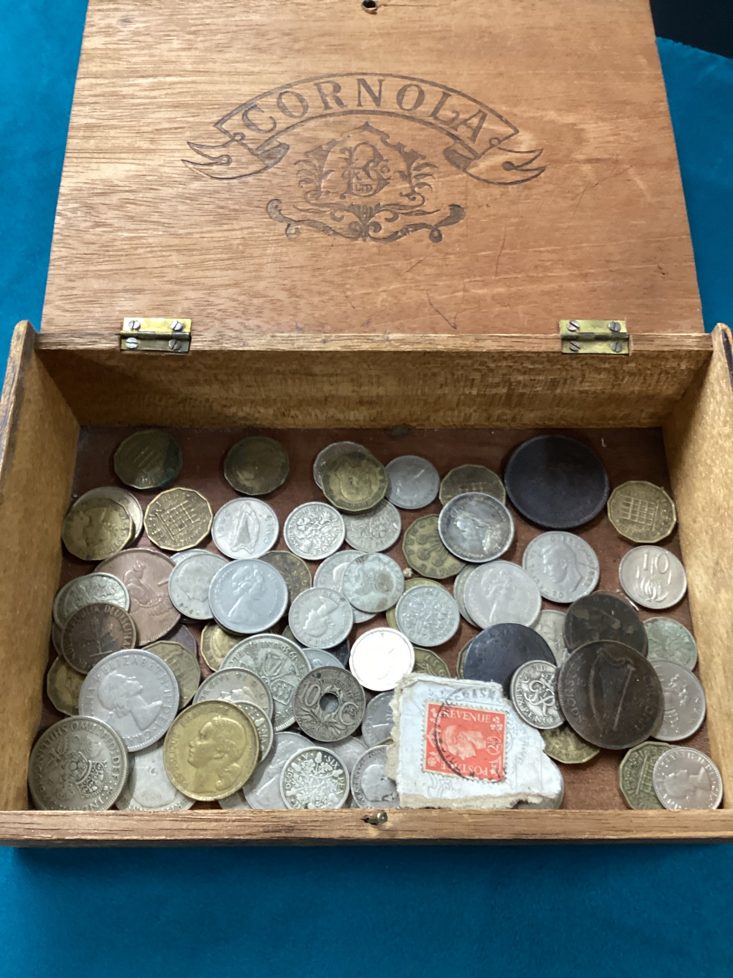 A vintage rectangular wooden cigar box, constructed from a light to medium brown wood. The hinged lid is decoratively stenciled or branded with the name “CORNOLA” in an ornate banner, flanked by scrollwork and a central emblem, below which the word “HABANA” is faintly visible. Inside, the box contains a mixed assortment of numerous coins from various countries and periods, including several older British or Commonwealth issues, alongside a fragment of paper featuring a reddish-orange postage stamp marked “REVENUE POSTAGE 2d.” Small white adhesive labels on the exterior bear the marks “JLS” and “16.”