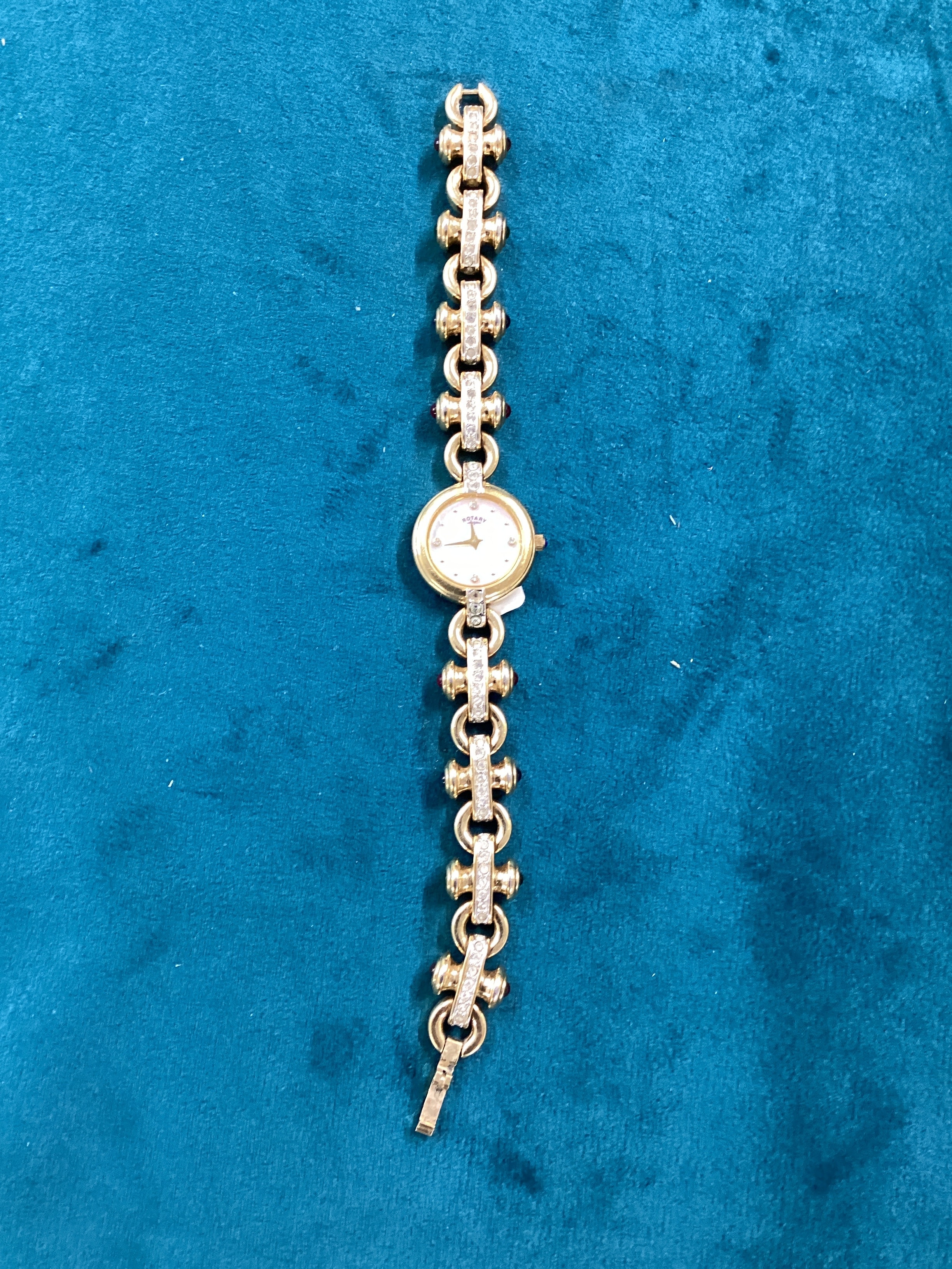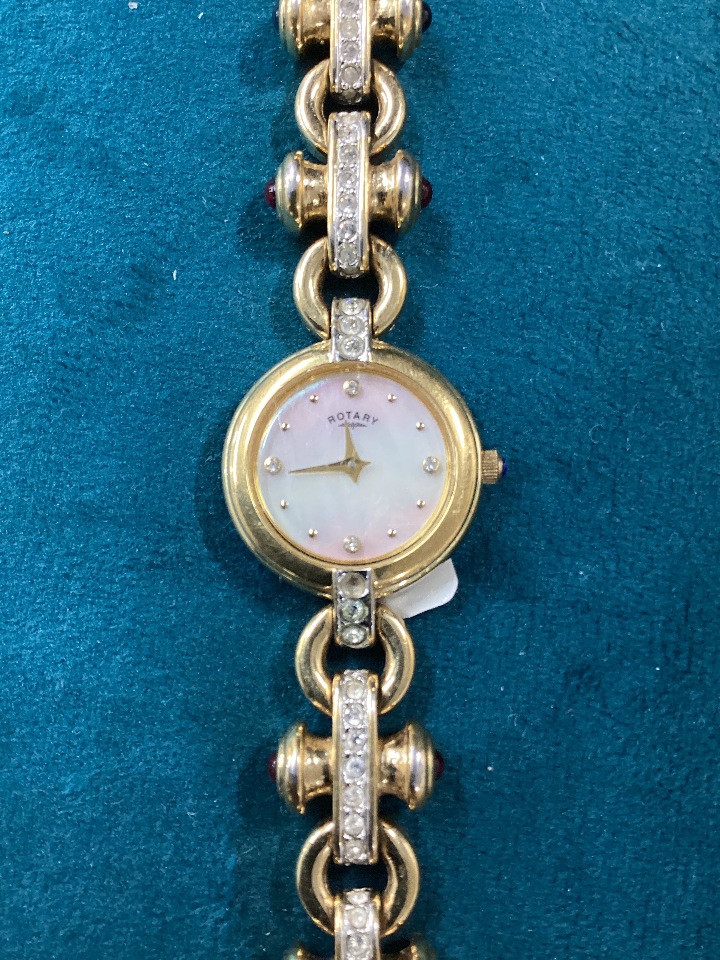 A ladies’ gold-tone bracelet watch by Rotary, featuring a round case and a pearlescent white dial with twelve clear, round faceted stones serving as hour markers. The dial is visibly marked “ROTARY” at the 12 o’clock position, with an indistinct logo beneath. The articulated link bracelet is designed with rectangular elements set with multiple small clear faceted stones, interspersed with cylindrical sections, some of which are adorned with small, round, red stones. The watch is fitted with a folding clasp.