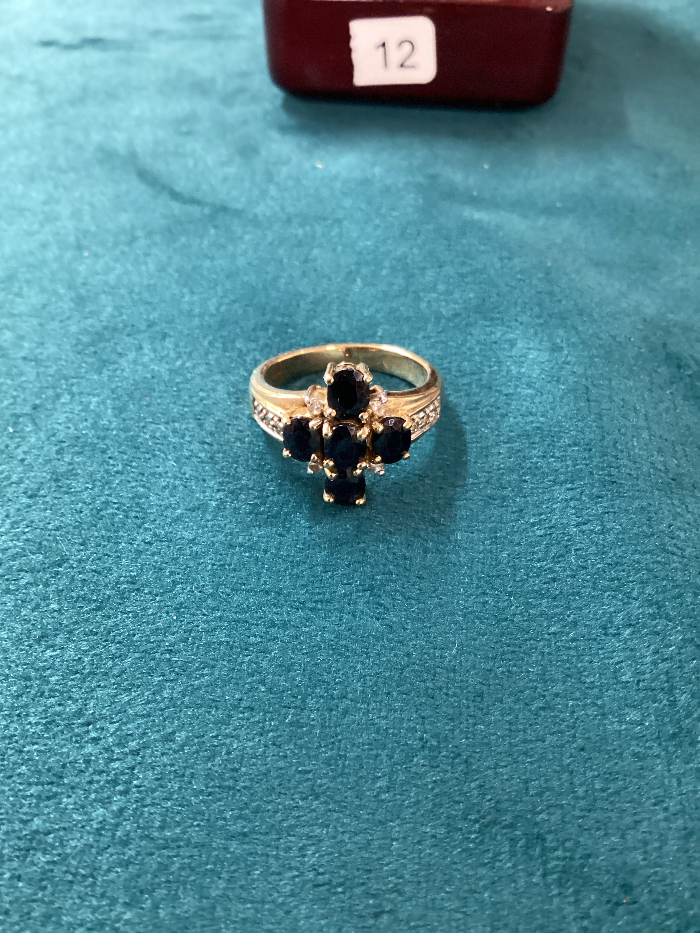 A 9k yellow gold finger ring featuring a prominent central cluster design composed of five oval-cut dark blue sapphires, arranged in a quatrefoil or cross pattern. Weight 5.24g. The ring’s shoulders are further embellished with multiple small, round, colorless accent diamonds set into the band.