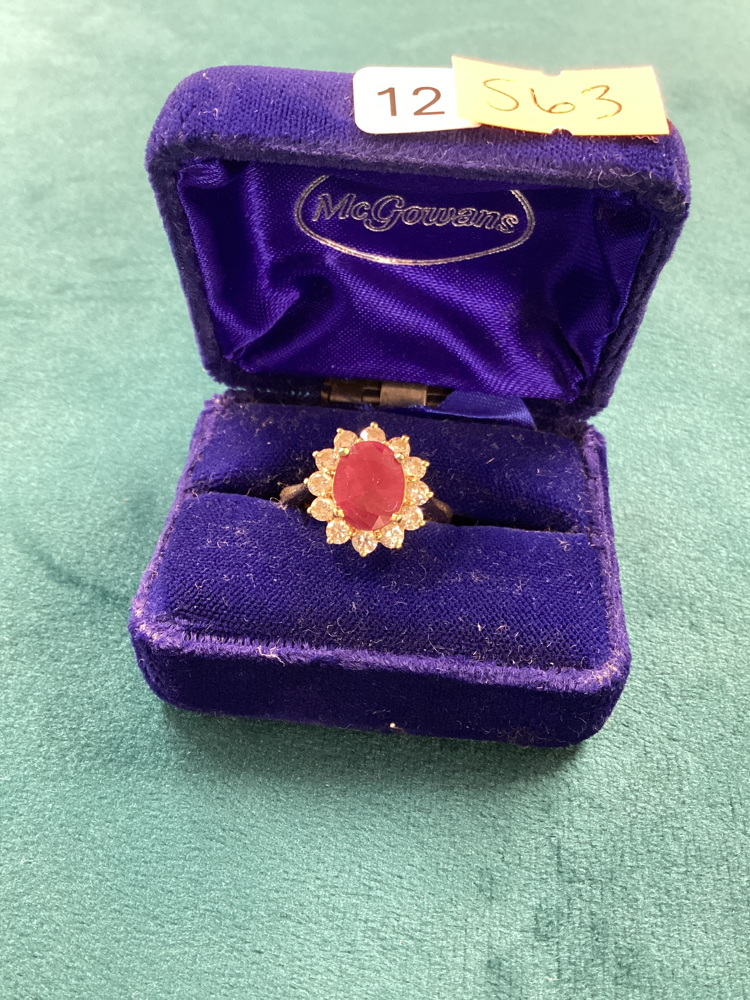 A 18k yellow gold ring featuring an oval-cut ruby, encircled by a halo of round brilliant-cut diamonds. The yellow-tone metal setting is likely gold. The central ruby is oval-cut, and the surrounding diamonds are small and round, arranged in a halo style. The ring is presented in an open, hinged jewelry box, upholstered in royal blue or purple velvet, displaying the name ‘McGowans’ in white script on the interior lid.