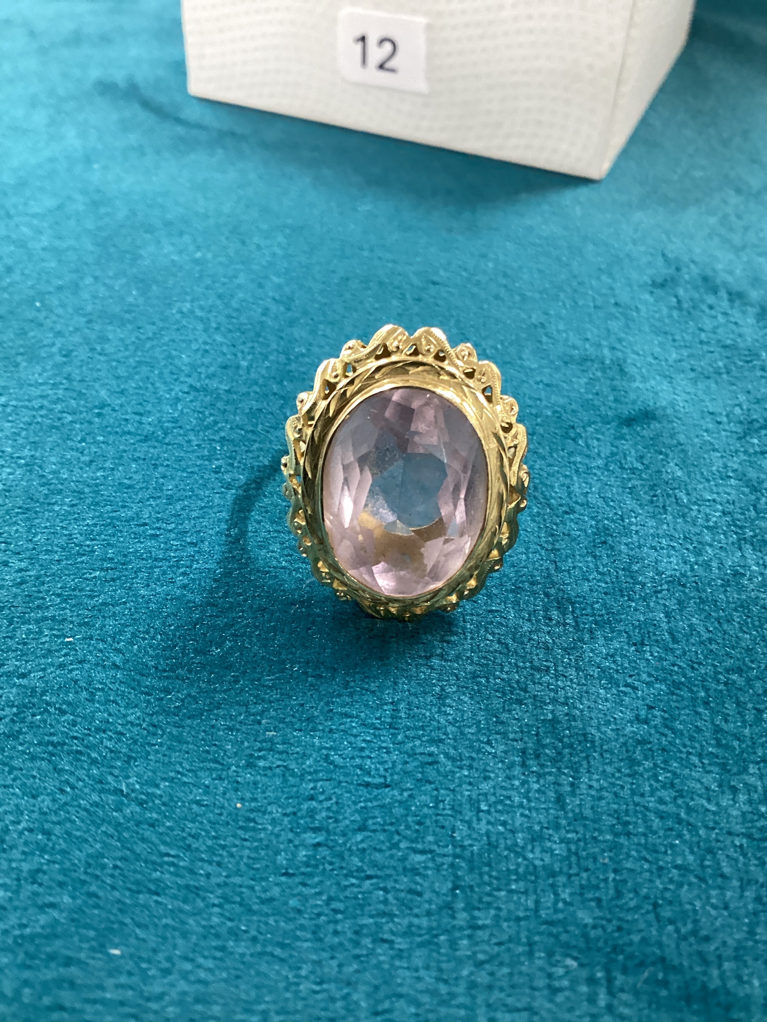 An Art Deco style ring, crafted in 18k yellow gold and set with an amethyst. The prominent oval-cut transparent gemstone exhibits a pale pink to light purple hue. It is set within an ornate yellow metal mounting, characterized by a decorative scalloped or openwork surround resembling a crown or halo. The ring’s shoulders transition to a simple, plain band. No specific maker’s marks, hallmarks, or inscriptions are visible. Comparable examples in the market are frequently attributed as 18K gold. Weight 6.13g
