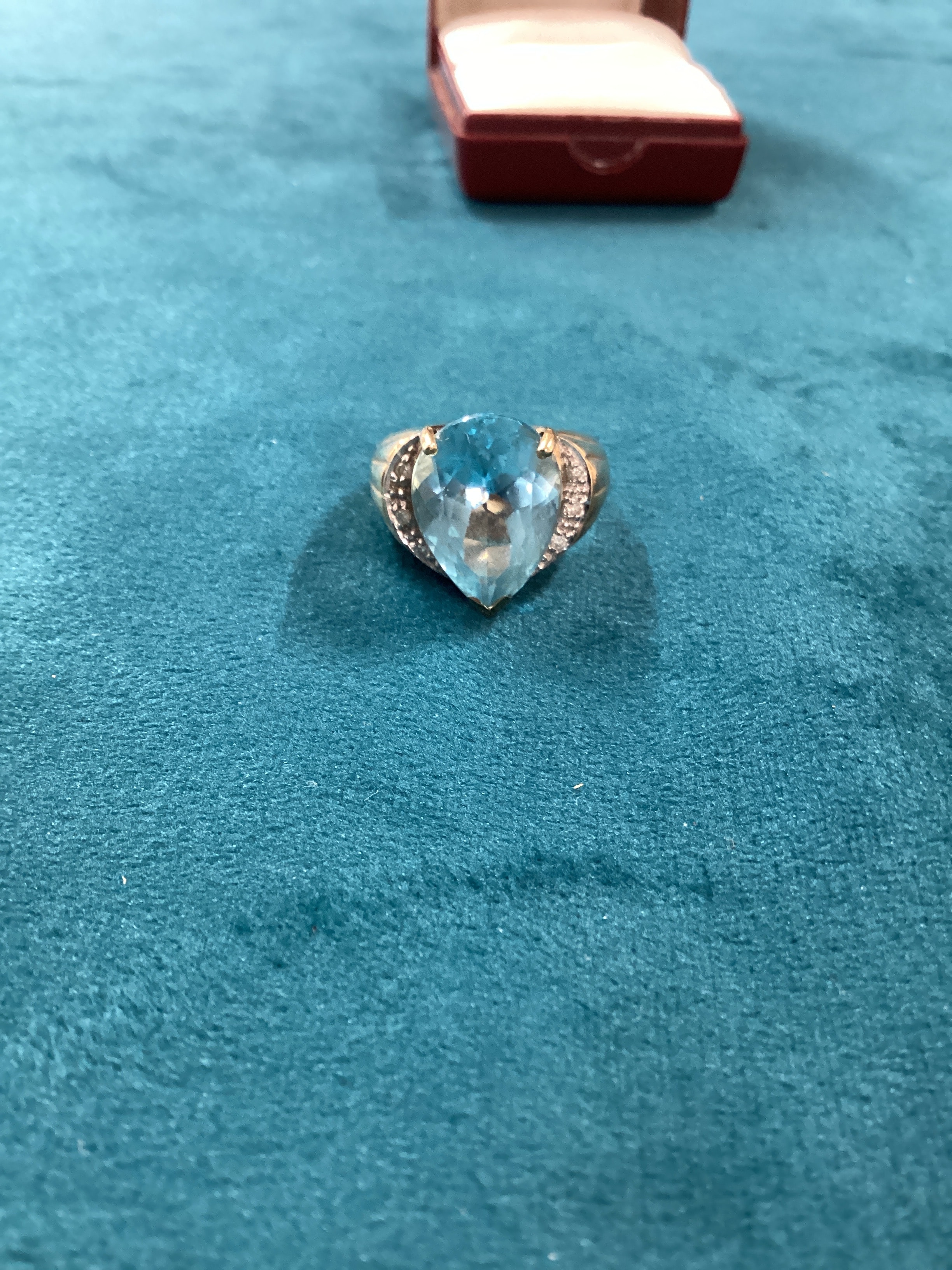 A 9k yellow-toned metal finger ring featuring a large, pear-shaped, Weight 9g