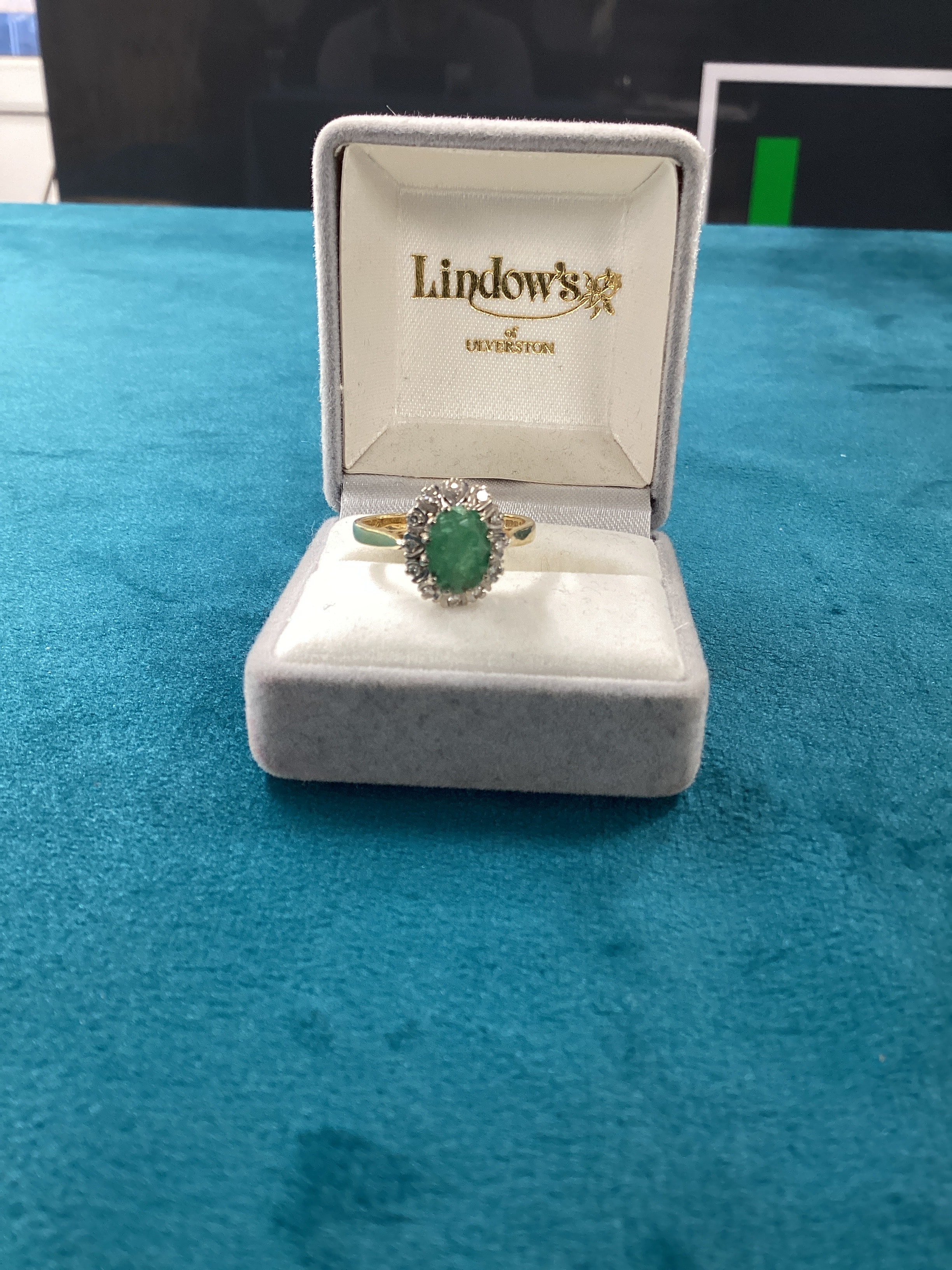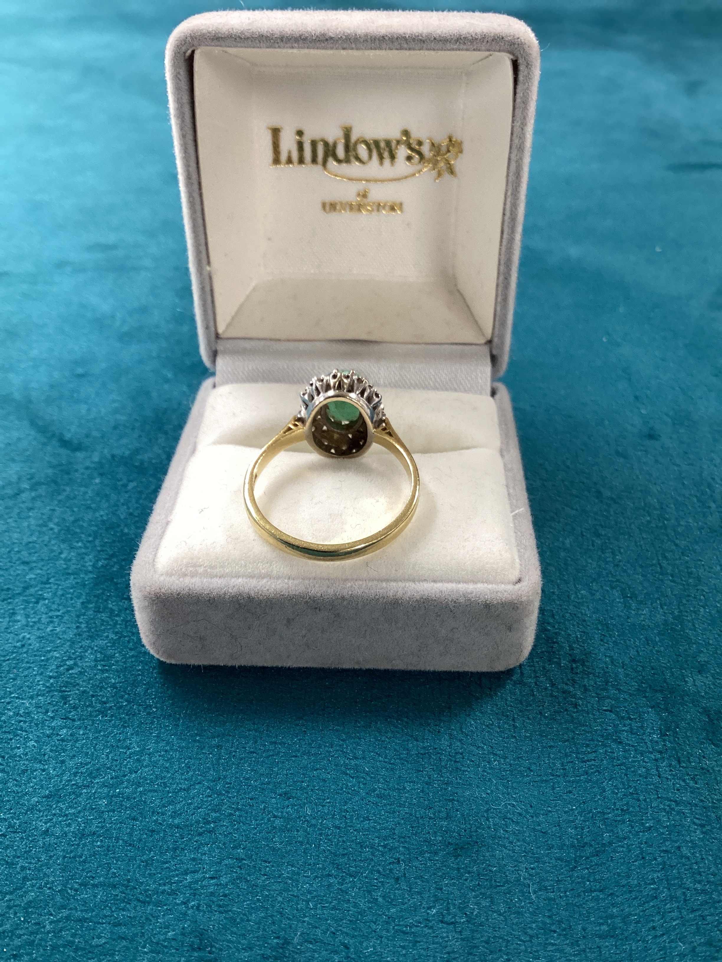 A 18K Yellow Gold Natural Emerald and Diamond Halo Ring. The ring features an oval-cut central natural emerald, encircled by a halo of smaller clear gemstones, consistent with diamonds. The ring’s band is yellow gold, with the setting for the halo in a white metal. The ring is presented in a grey velvet-covered presentation box with a white satin interior, imprinted with “Lindow’s” (featuring a floral motif) and “ULVERSTON” in gold script. Weight 4.11g