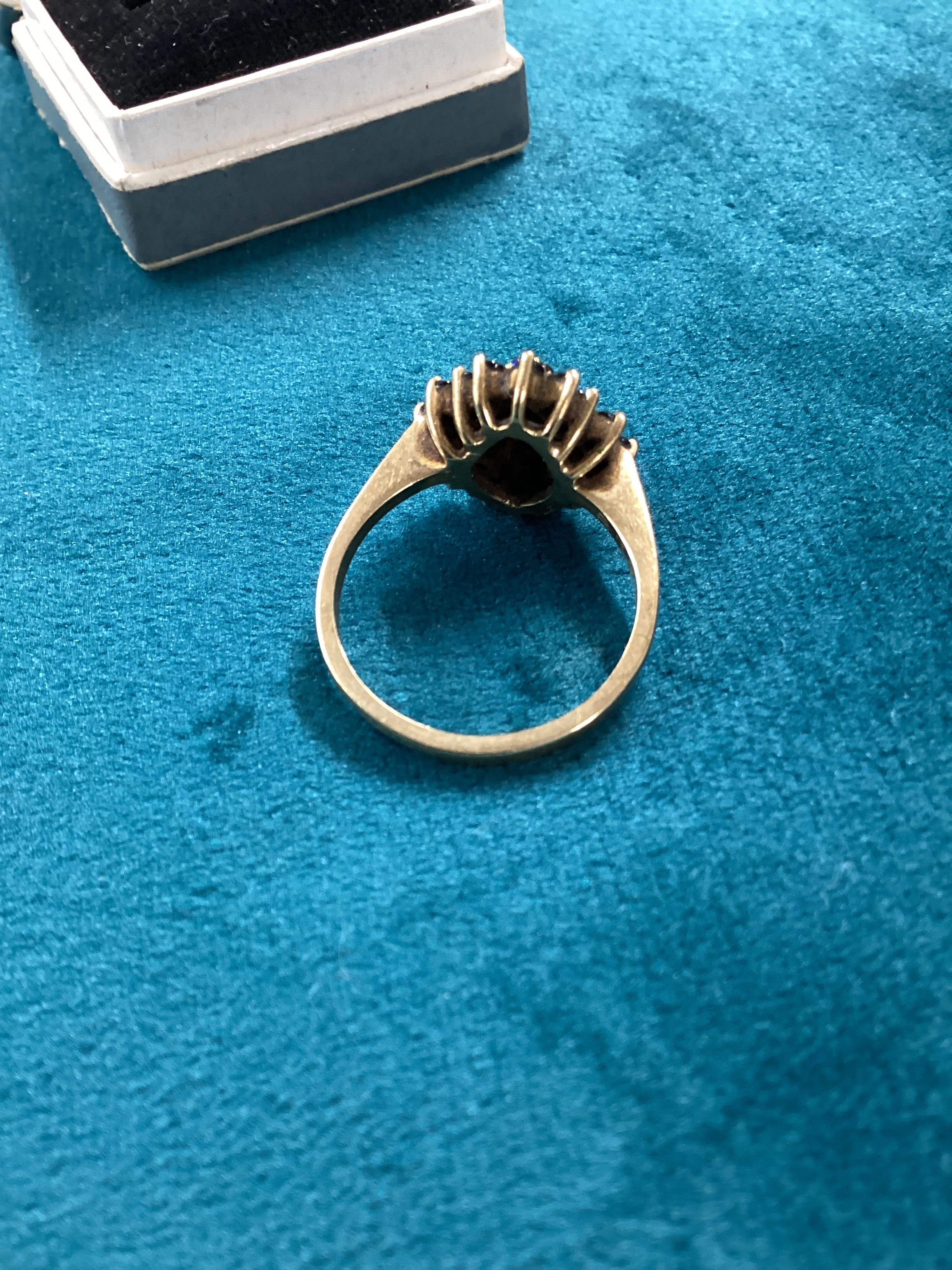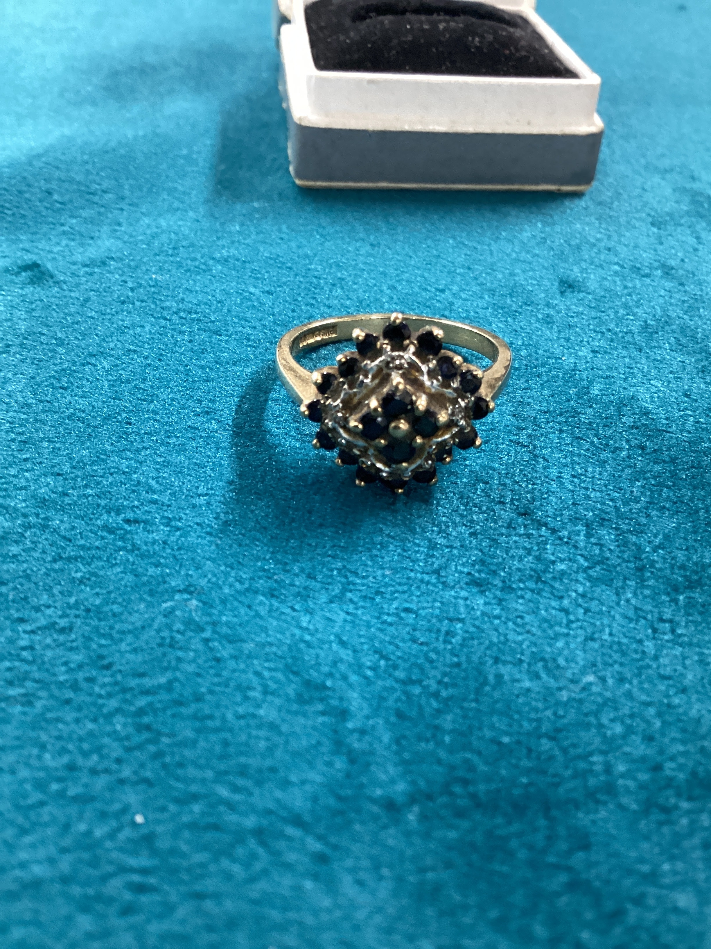 A 9K yellow gold ring, featuring a cluster design set with multiple dark faceted stones identified as sapphires and diamonds. The ring’s head is raised and somewhat square-shaped. The band is plain and polished. A faint, illegible marking is visible on the interior of the band. Weight 4.17g
