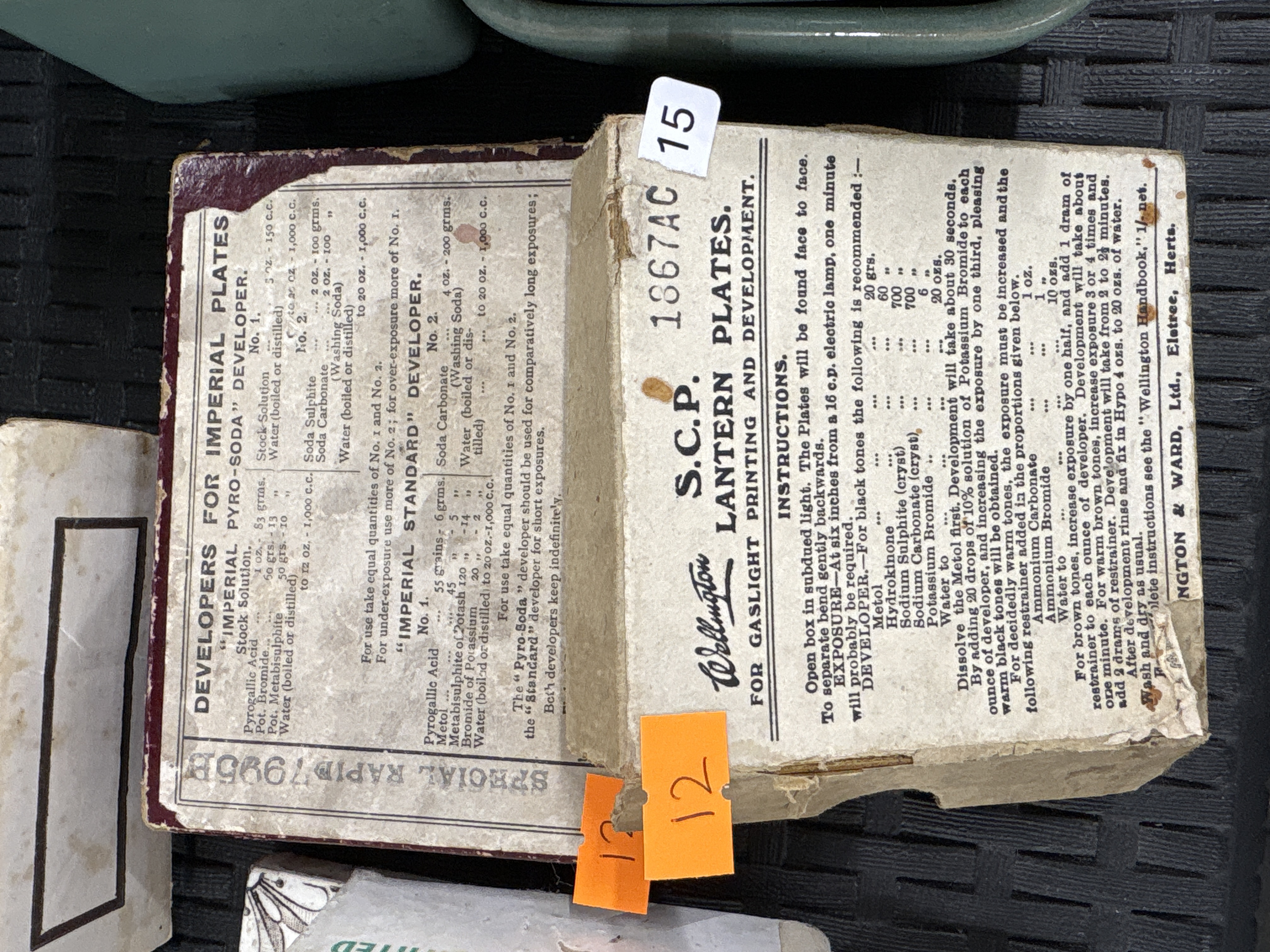 A collection of vintage photography supply packaging and ephemera. The group includes a box for Developers for Imperial Plates, featuring printed chemical formulas for Pyro-Soda and Standard developers and marked Special Rapid 7995B. Also present is a Wellington S.C.P. Lantern Plates box for gaslight printing and development, manufactured by Wellington and Ward, Ltd. of Elstree, Herts. The Wellington packaging provides detailed instructions and exposure guidelines for lantern plates. The items are constructed of printed cardboard and paper.