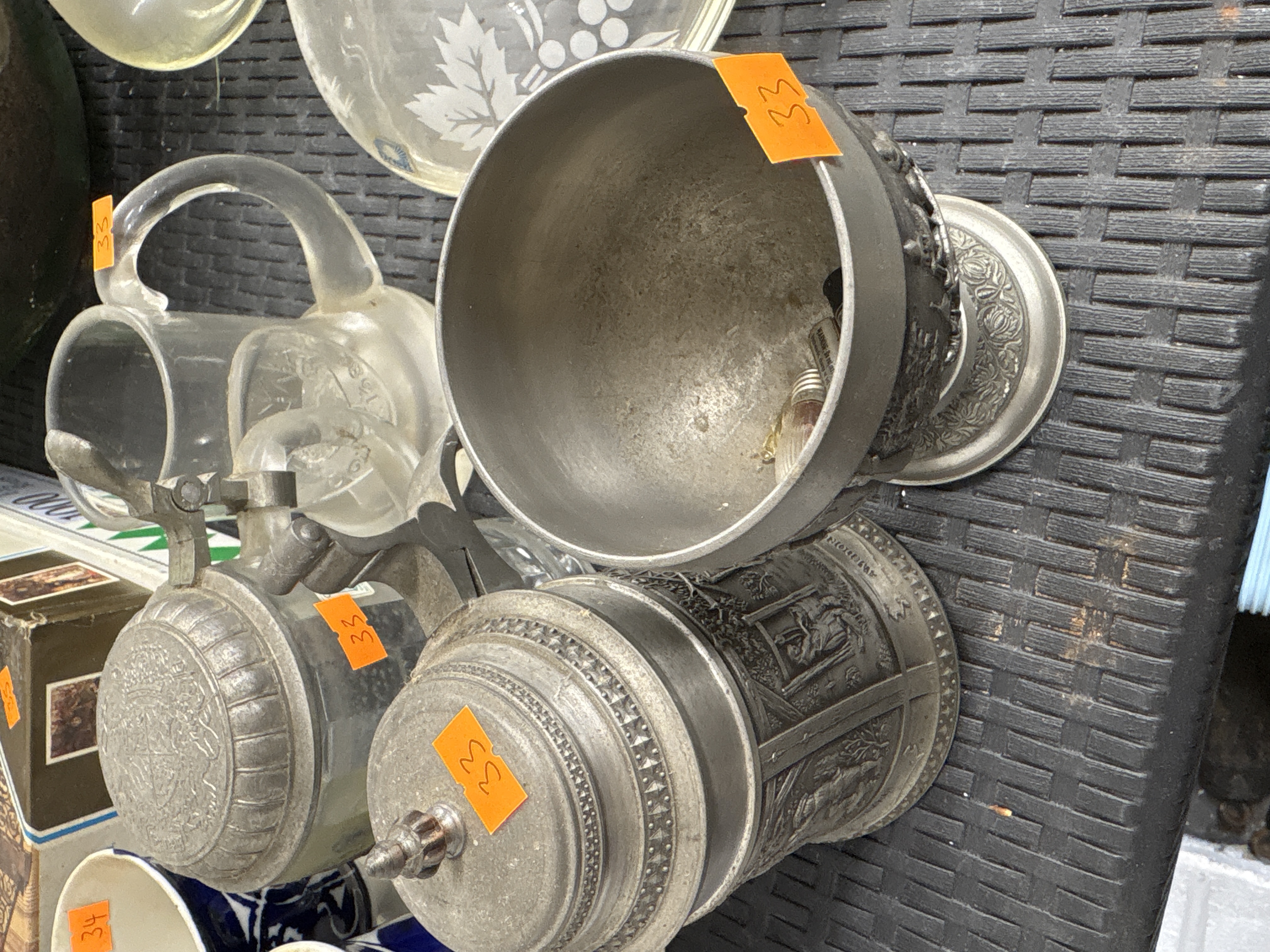 A collection of traditional German-style drinkware comprising various vessels constructed from glass and pewter-toned metal. The group includes a glass stein with a hinged metal lid featuring a decorative relief crest, a solid metal stein with embossed panels depicting historical or folk scenes and a finial-topped lid, and a large metal goblet with an ornate floral relief band around the base. The items feature traditional motifs consistent with European metalwork. Several pieces bear orange inventory tags numbered 33.