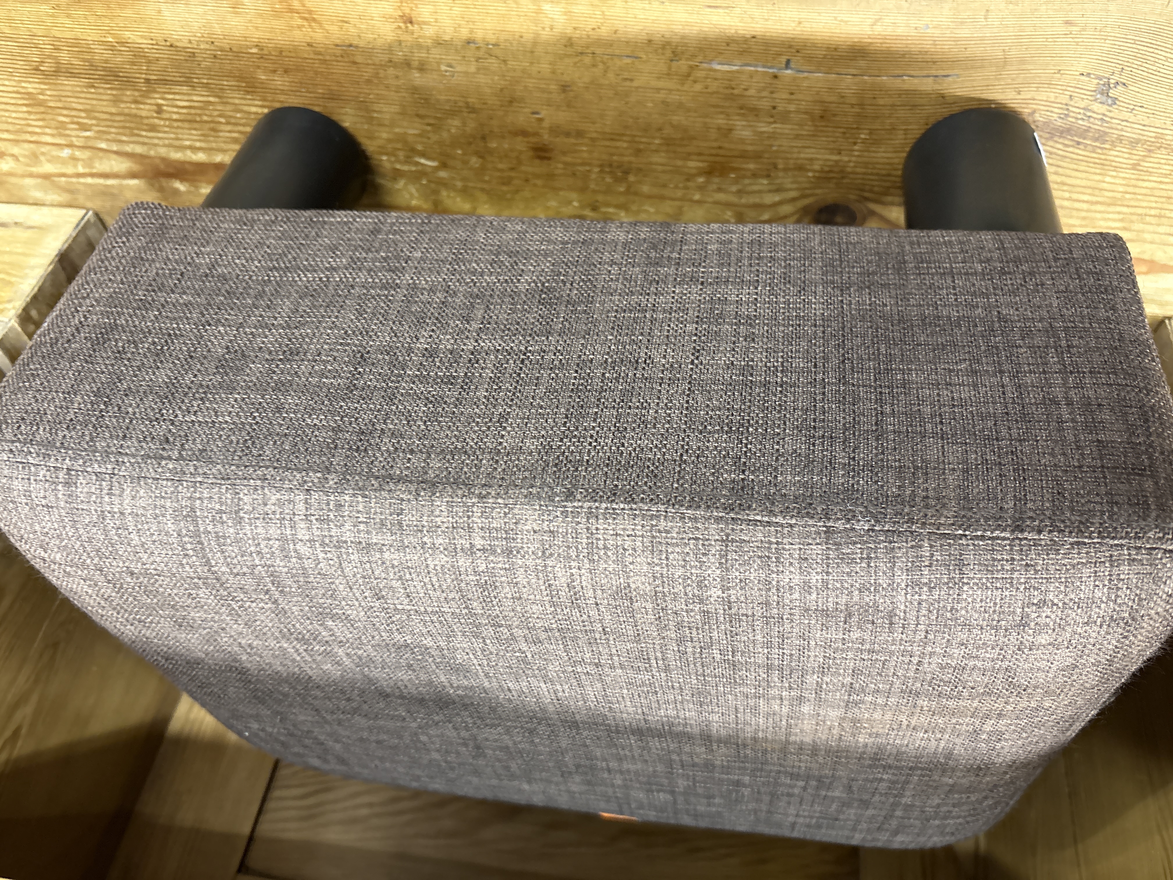 A contemporary upholstered ottoman of rectangular form with rounded corners. The piece is covered in a grey textured woven fabric and is raised on black cylindrical legs. A small orange label is present at the lower edge, though the text is not legible.