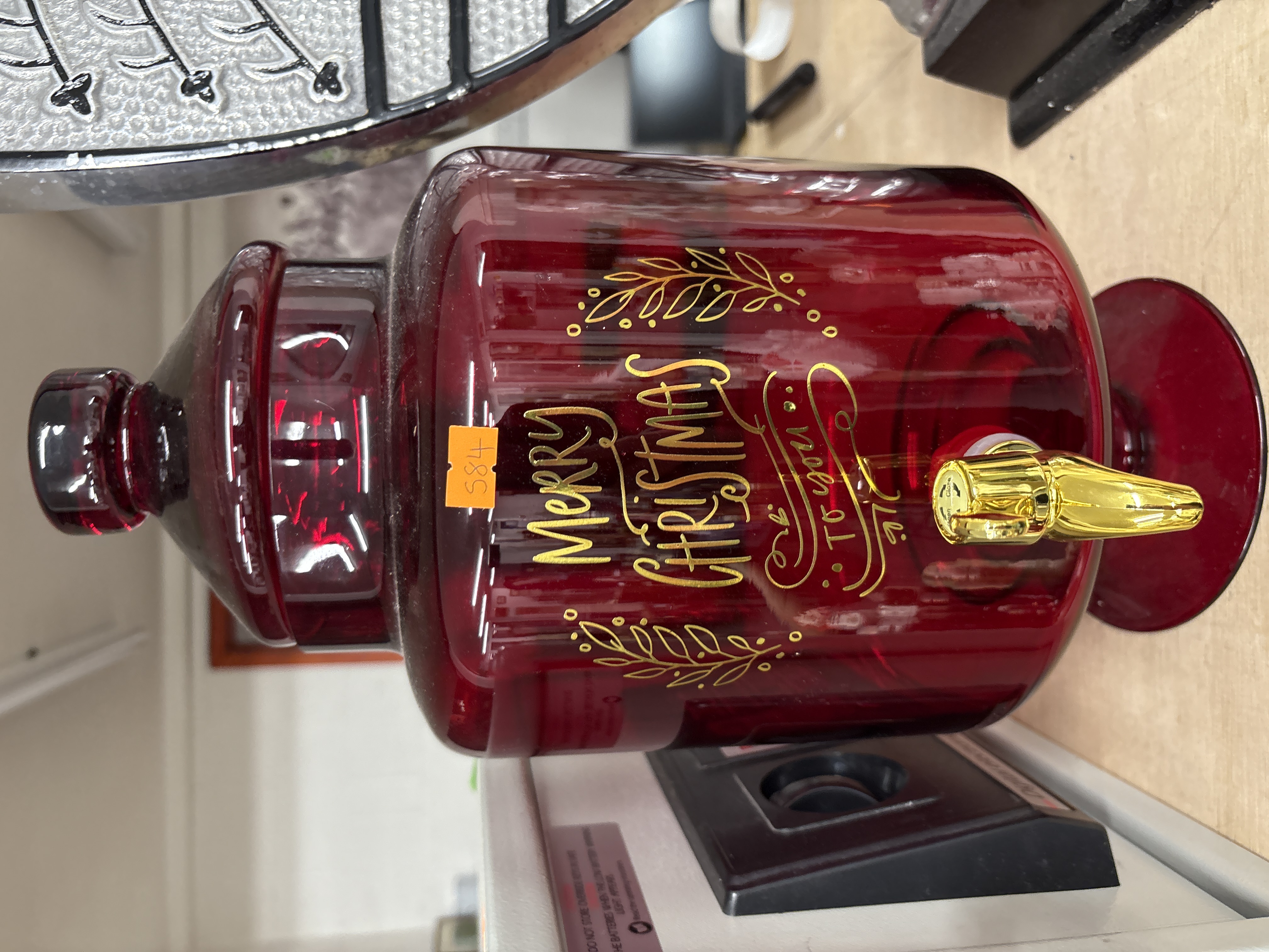 A contemporary holiday-themed beverage dispenser crafted from deep red glass. The item features a cylindrical body, a matching glass lid with a round finial, and a circular pedestal base. The front of the vessel is decorated with gold-toned script lettering that reads Merry Christmas To You, flanked by stylized foliage motifs. It is equipped with a gold-finished spigot near the base for liquid dispensing. Market data suggests a capacity of approximately 4.9 litres.