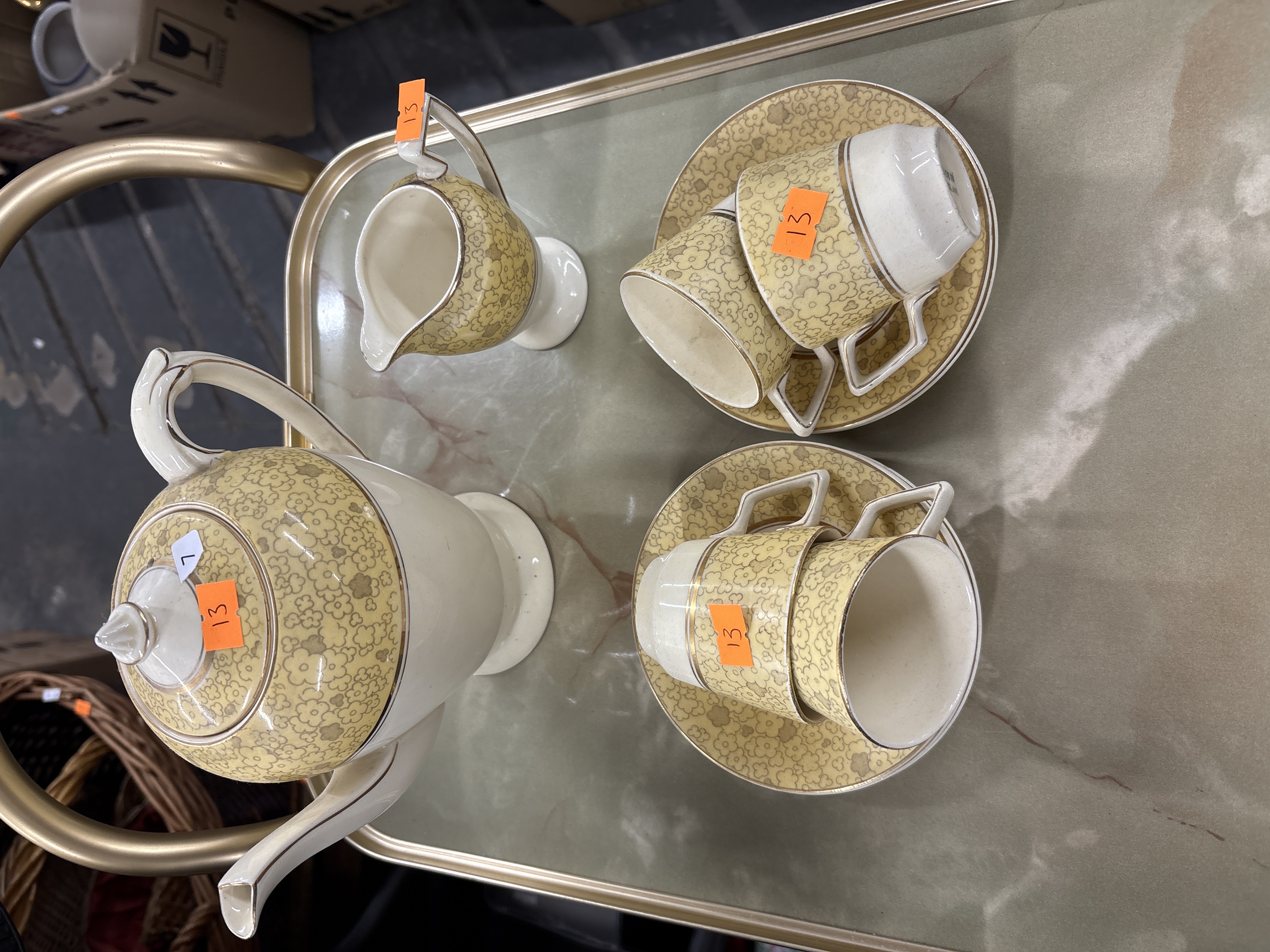 The items appear to be in good overall condition with light surface wear consistent with age and use. Several pieces bear orange adhesive inventory stickers.