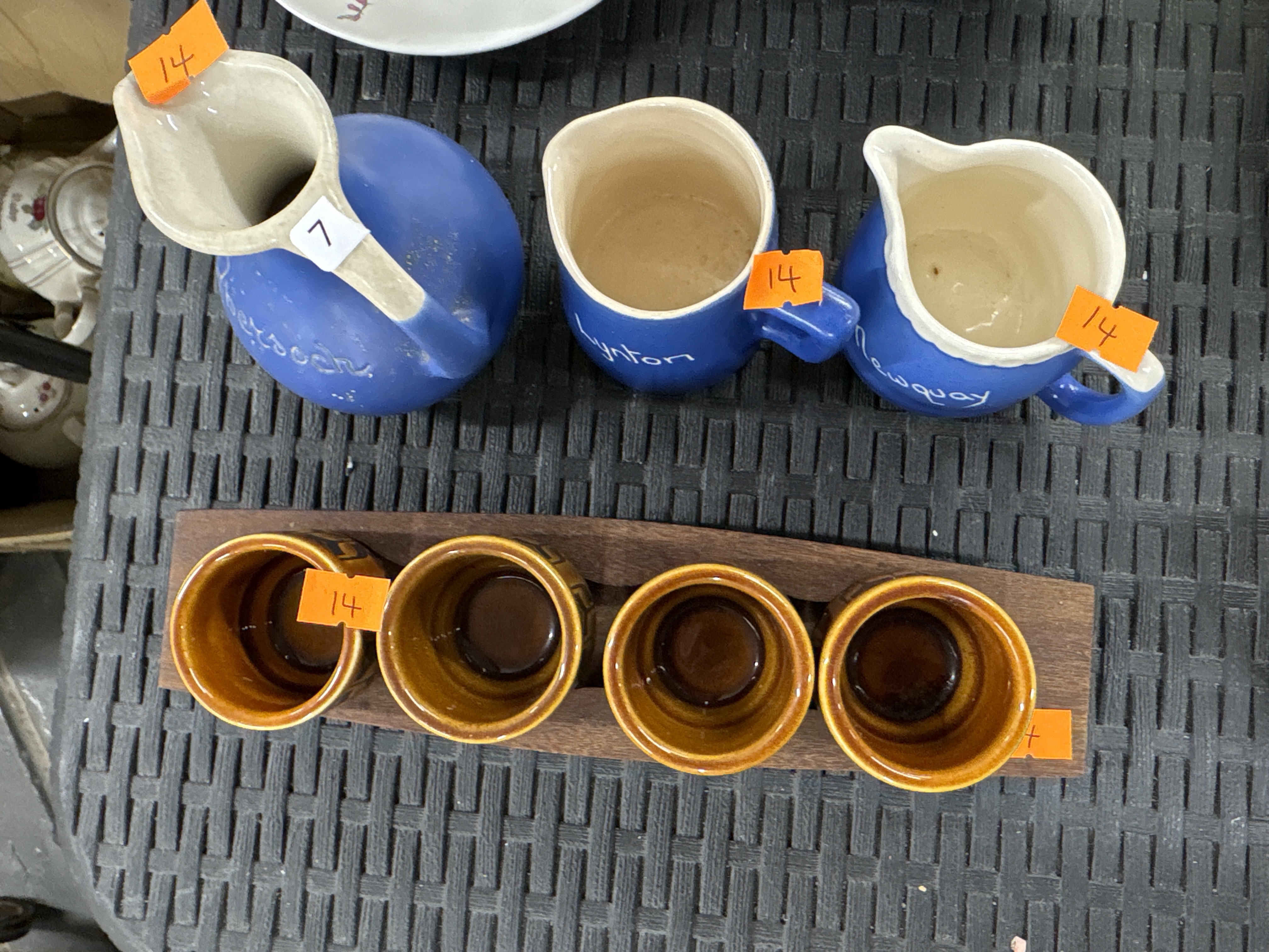 A collection of glazed ceramic items comprising several souvenir jugs and a coffee or liqueur set. The souvenir jugs feature a matte blue exterior finish with cream-coloured interiors and are decorated with white script lettering identifying British coastal locations including Lynton and Newquay. The second group consists of a set of small cylindrical cups featuring a two-tone brown drip glaze, housed within a dark-toned wooden caddy or serving tray. The construction and finish of the cups are consistent with mid-century drip glaze pottery produced by makers such as Winart Pottery.