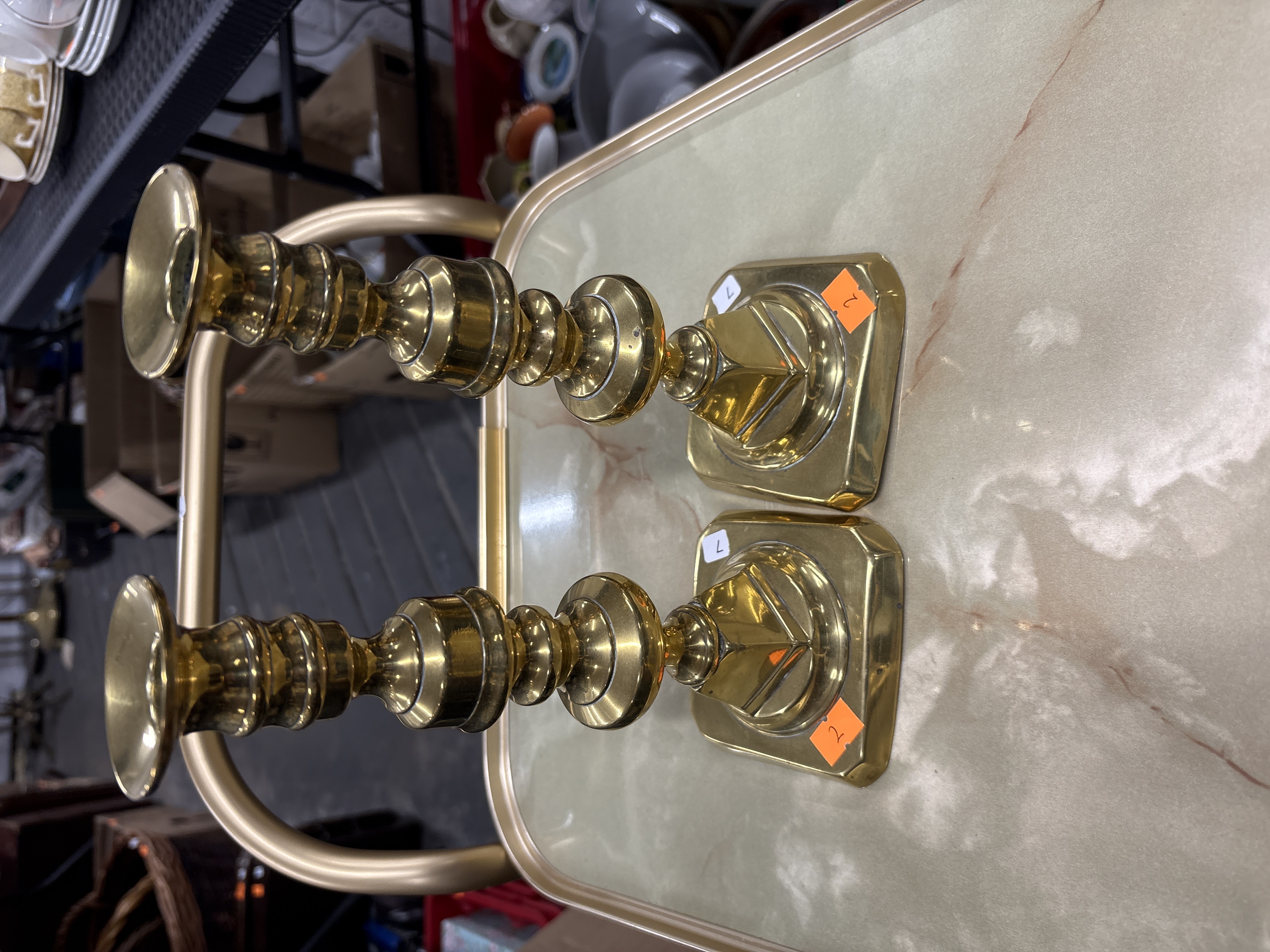The candlesticks exhibit a bright gold-tone finish with visible surface tarnish and light wear consistent with age and handling. Adhesive labels and price tags are present on the bases.