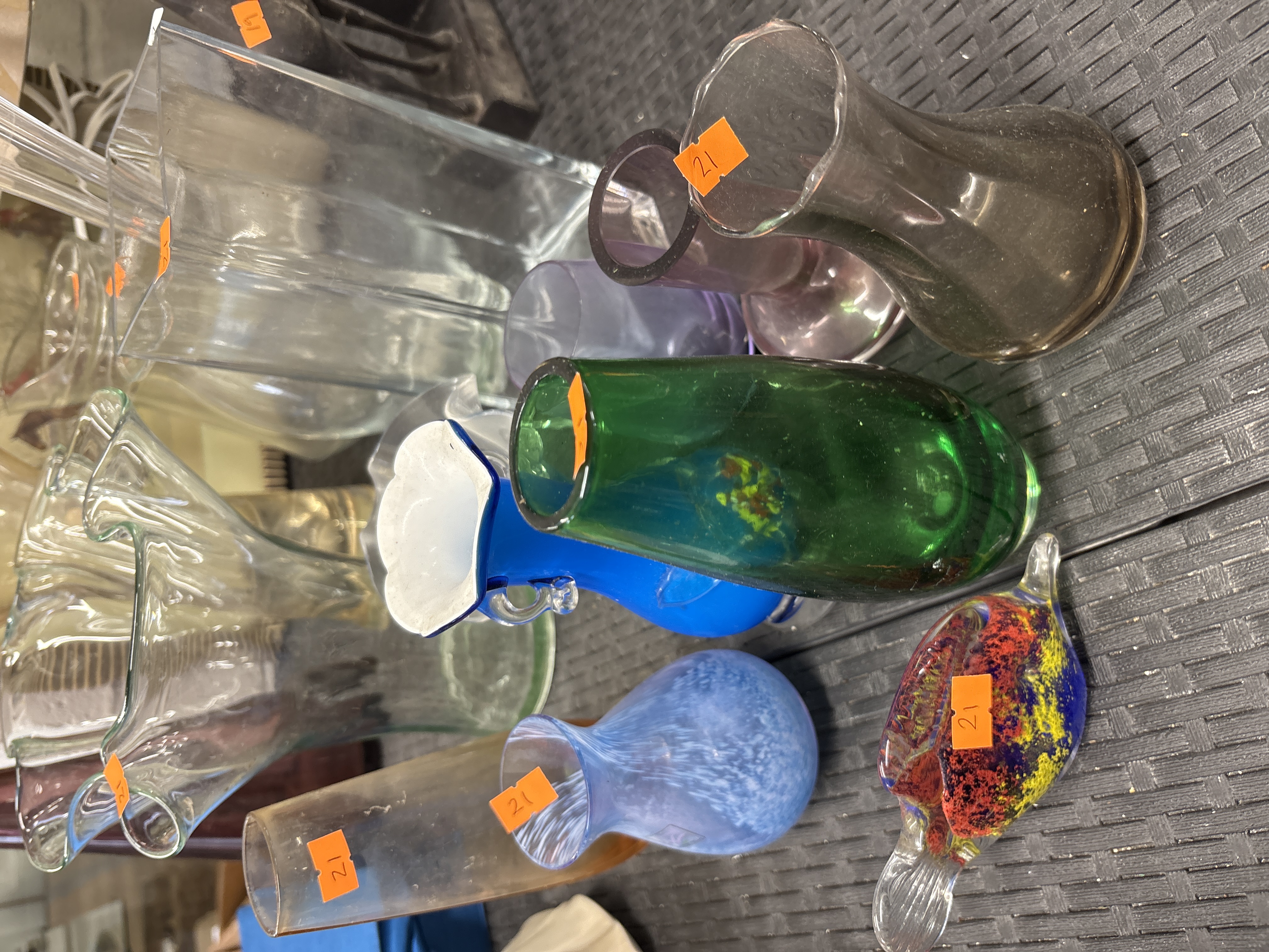 A collection of various art glass vases and decorative objects in a range of styles and colours. The assortment includes a speckled light blue glass vase consistent with Mt. St. Helens Ash glass, a blue glass vase featuring a white ruffled rim in the Murano style, and a multi-coloured glass bird figurine. Other pieces include a tall purple glass vase, a clear rectangular vase, a green tapered vase, and an iridescent amber-coloured vase. The objects are fashioned from clear, coloured, and iridescent glass, showcasing various forms from geometric to organic and ruffled. Several items bear small orange labels numbered 21.