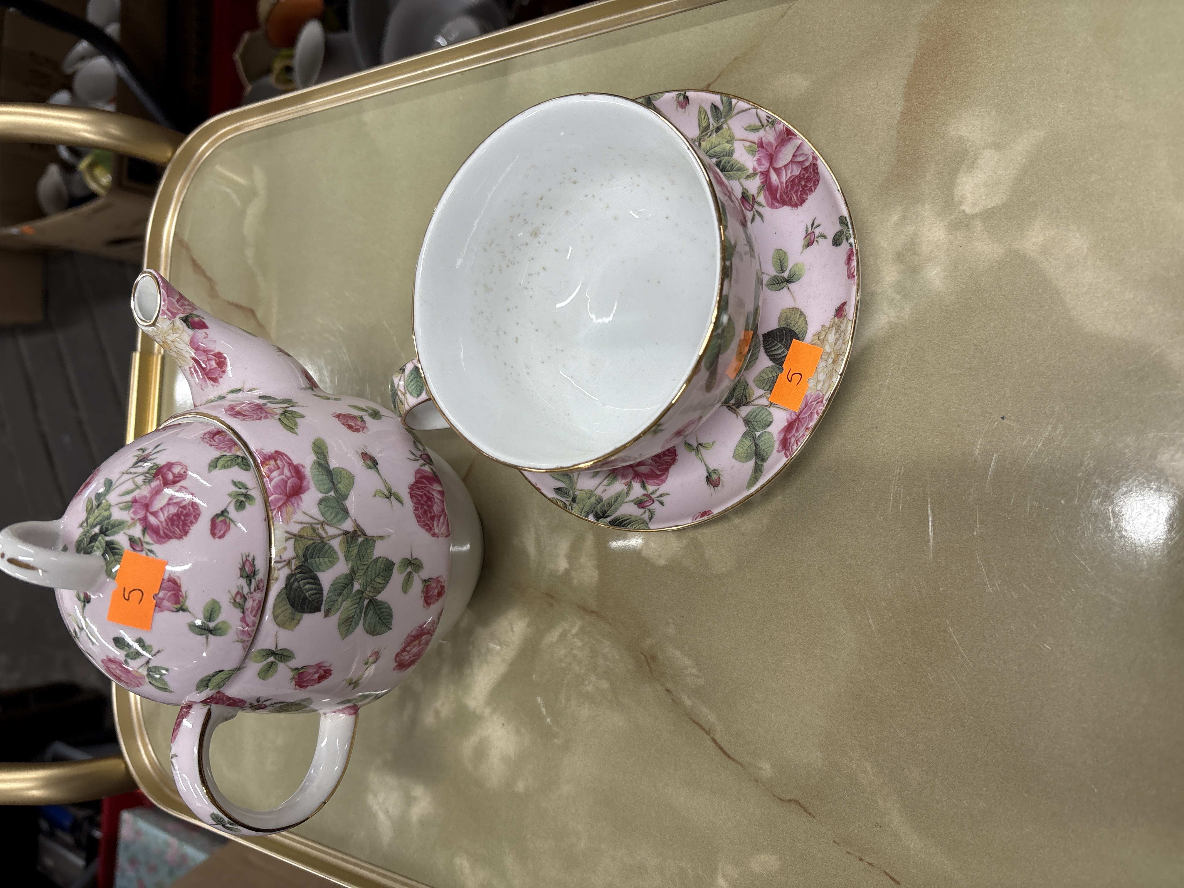 A trio of porcelain tea wares by Gracie China in the Rose Chintz pattern, comprising a lidded teapot, a teacup, and a matching saucer. The pieces are decorated with an all-over transferware motif of pink roses and green foliage set against a pale pink ground. The set is finished with gilded accents to the rims, handles, and spout. The teapot is fitted with a matching lid featuring a loop handle. Each piece currently bears an orange adhesive label with the numeral 5.