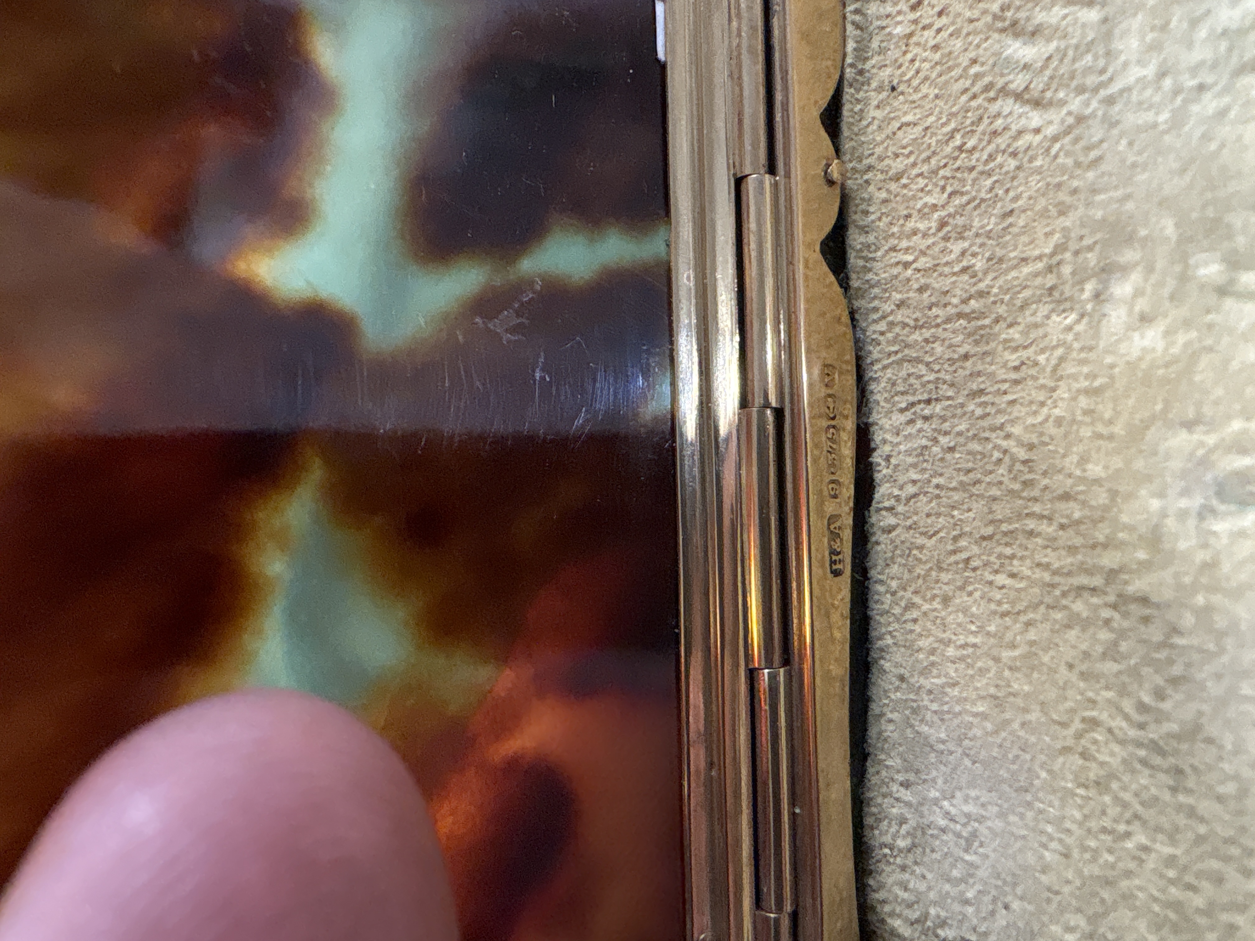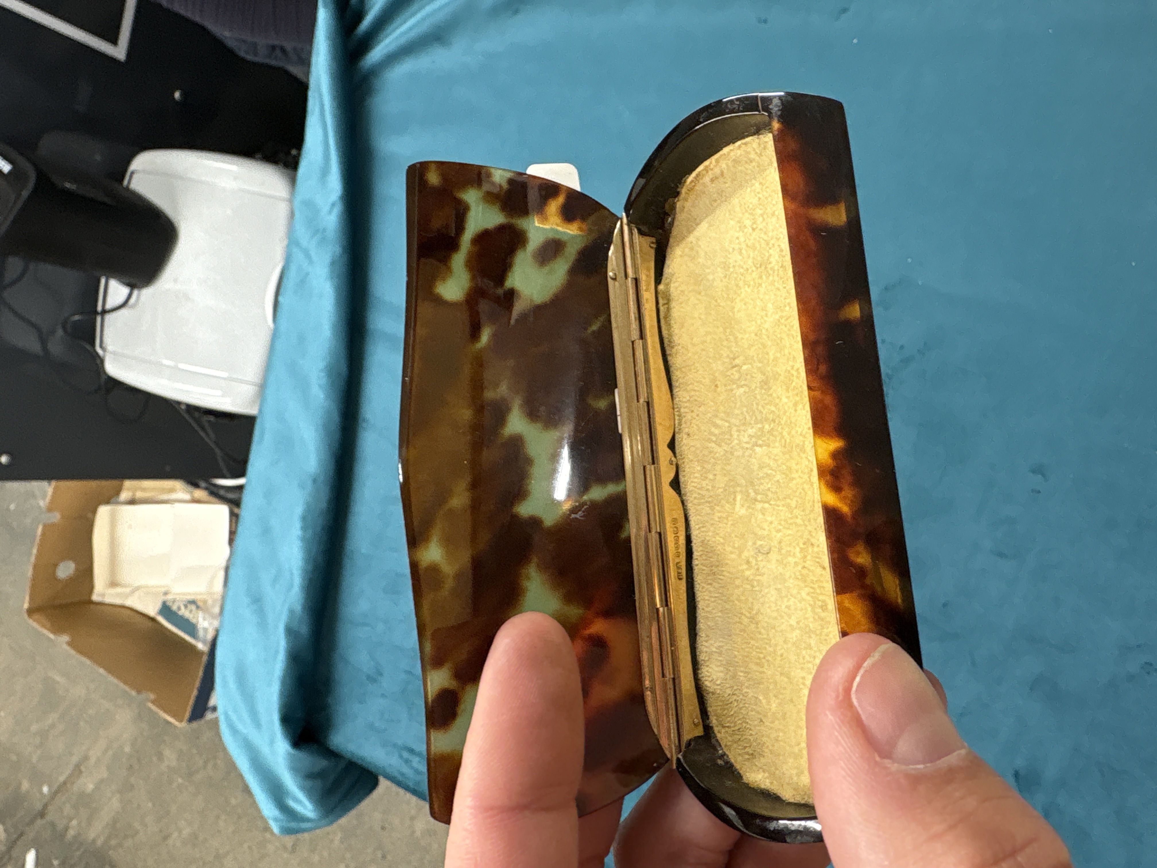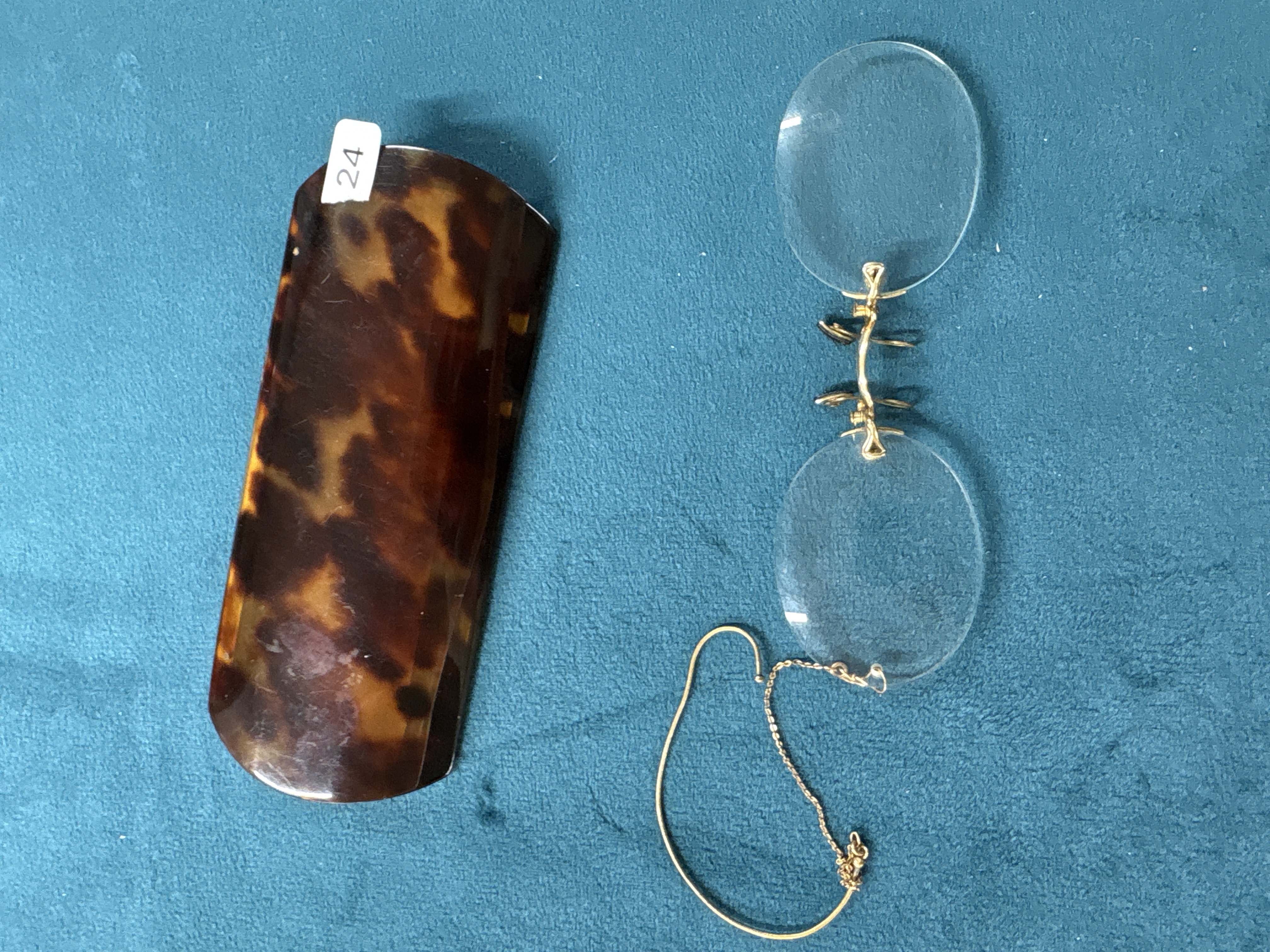 A set comprising a pair of vintage rimless pince-nez eyeglasses and a coordinating tortoiseshell-patterned case. The pince-nez are constructed with a gold-toned bridge and spring mechanism, featuring an attached fine-link chain terminating in a hook. The case is lined with a buff-coloured textile and is fitted with a 9-carat gold hinge. The interior hinge is struck with hallmarks including the maker mark H&A for Horton & Allday, the 9 . 375 gold standard mark, and the Birmingham anchor assay mark.