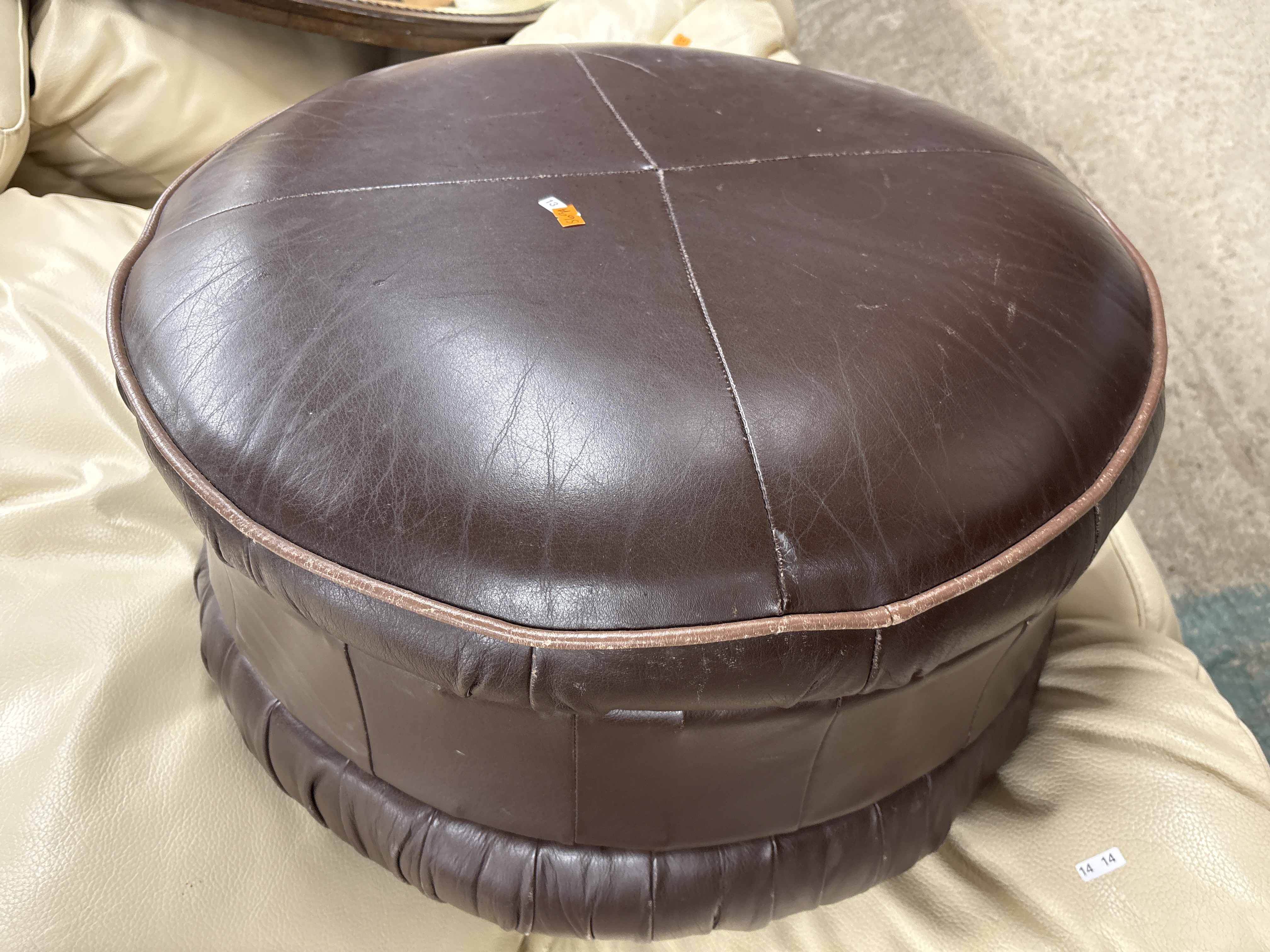 The item exhibits signs of age and use consistent with its period. Visible surface creasing, scuffing, and minor abrasions are present throughout the vinyl. There is notable wear and some discoloration to the light-tan piping. A small orange adhesive lot tag is present on the top surface.