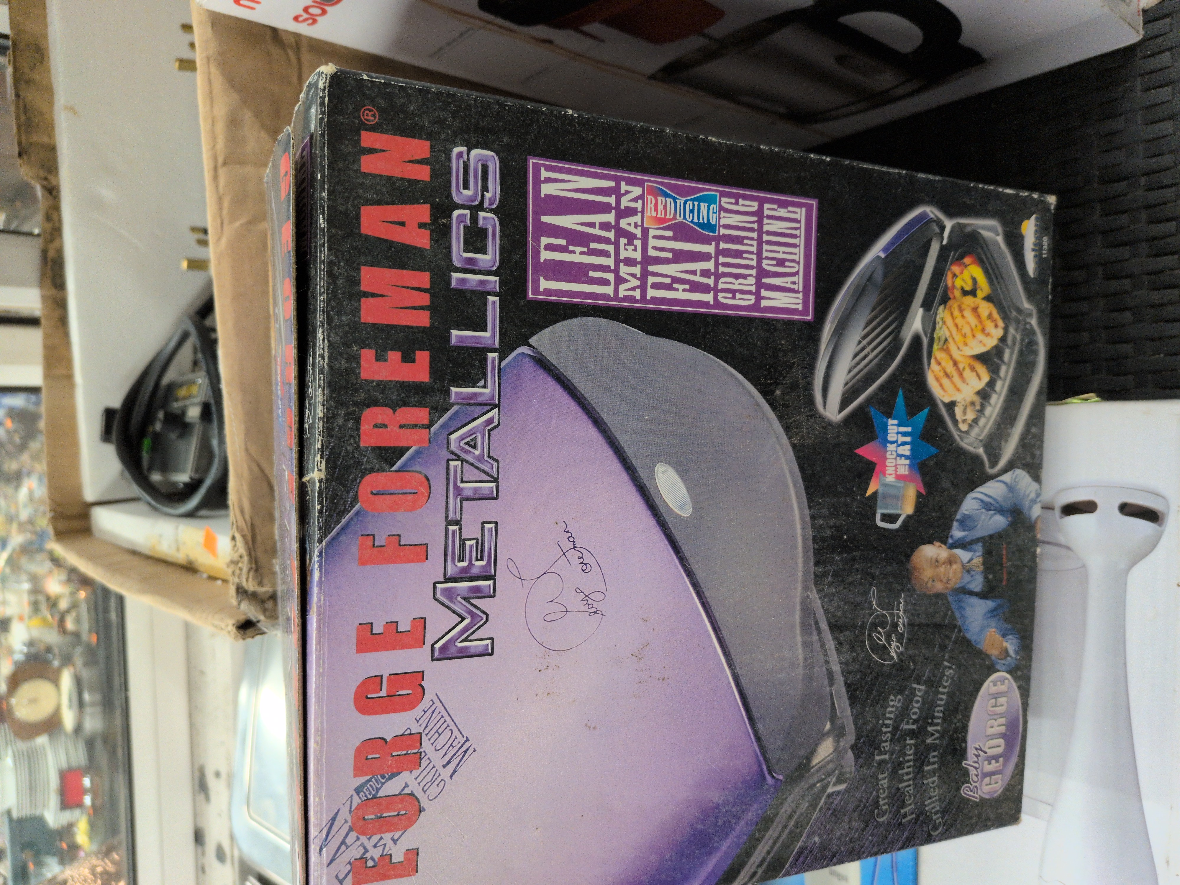 A George Foreman Baby George Lean Mean Fat Reducing Grilling Machine from the Metallics series. The electric grill is housed within its original retail packaging, which depicts the appliance with a purple-coloured finish. The box displays branding for the Metallics collection, a photographic portrait of George Foreman, and a facsimile signature. The packaging includes various marketing slogans such as Knock out the fat! and Great Tasting Healthier Food Grilled In Minutes!. This item is a compact electric countertop grill.