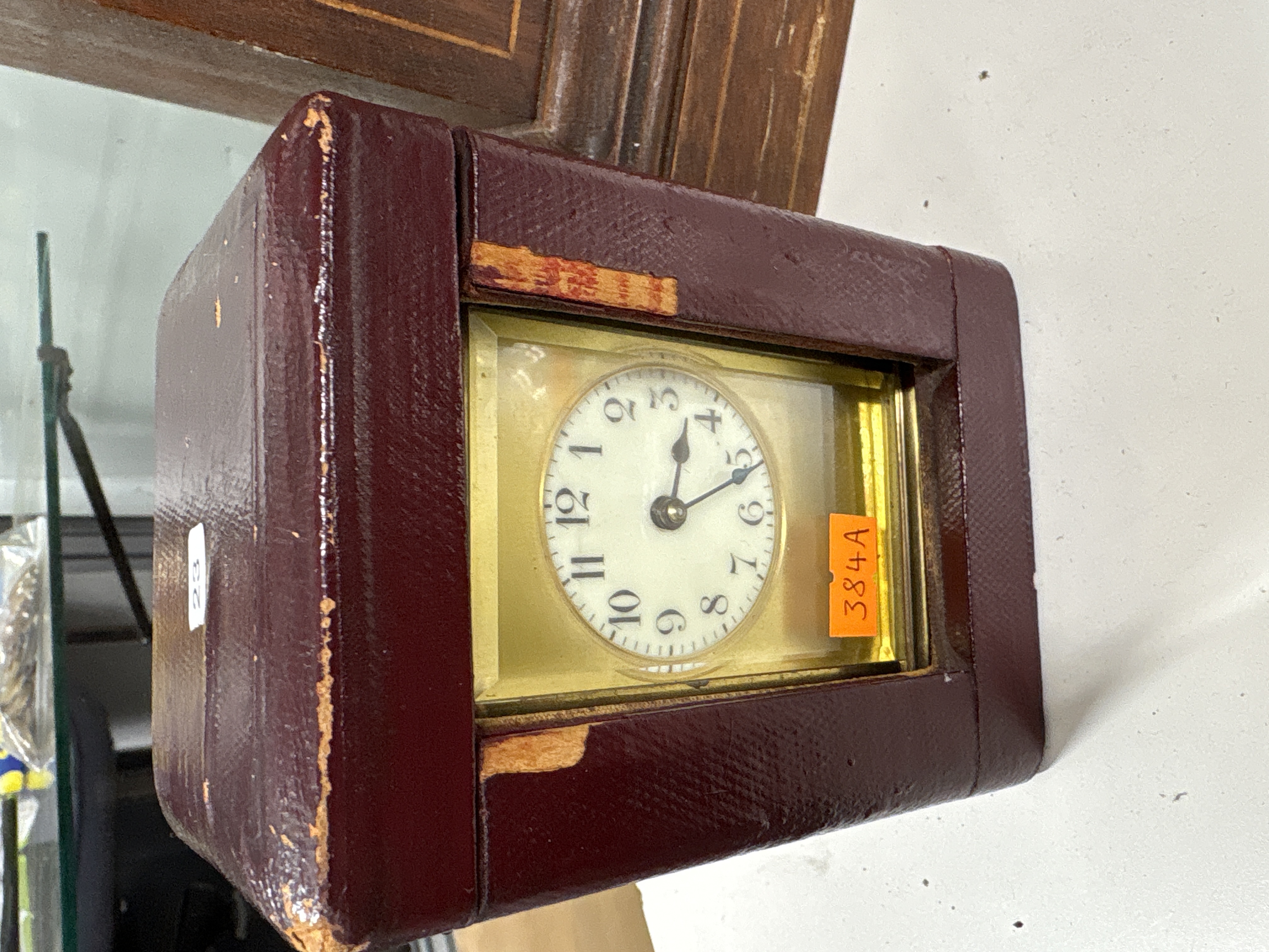 A vintage carriage clock housed in a rectangular burgundy-coloured leather-wrapped protective case. The timepiece features a white dial with black Arabic numerals and matching hands, set within a brass-tone rectangular inner frame protected by a glass panel. The exterior case is constructed from a rigid base material covered in textured leather. An orange inventory sticker marked 384A is affixed to the glass, and a small white label with the number 23 is present on the side of the case.