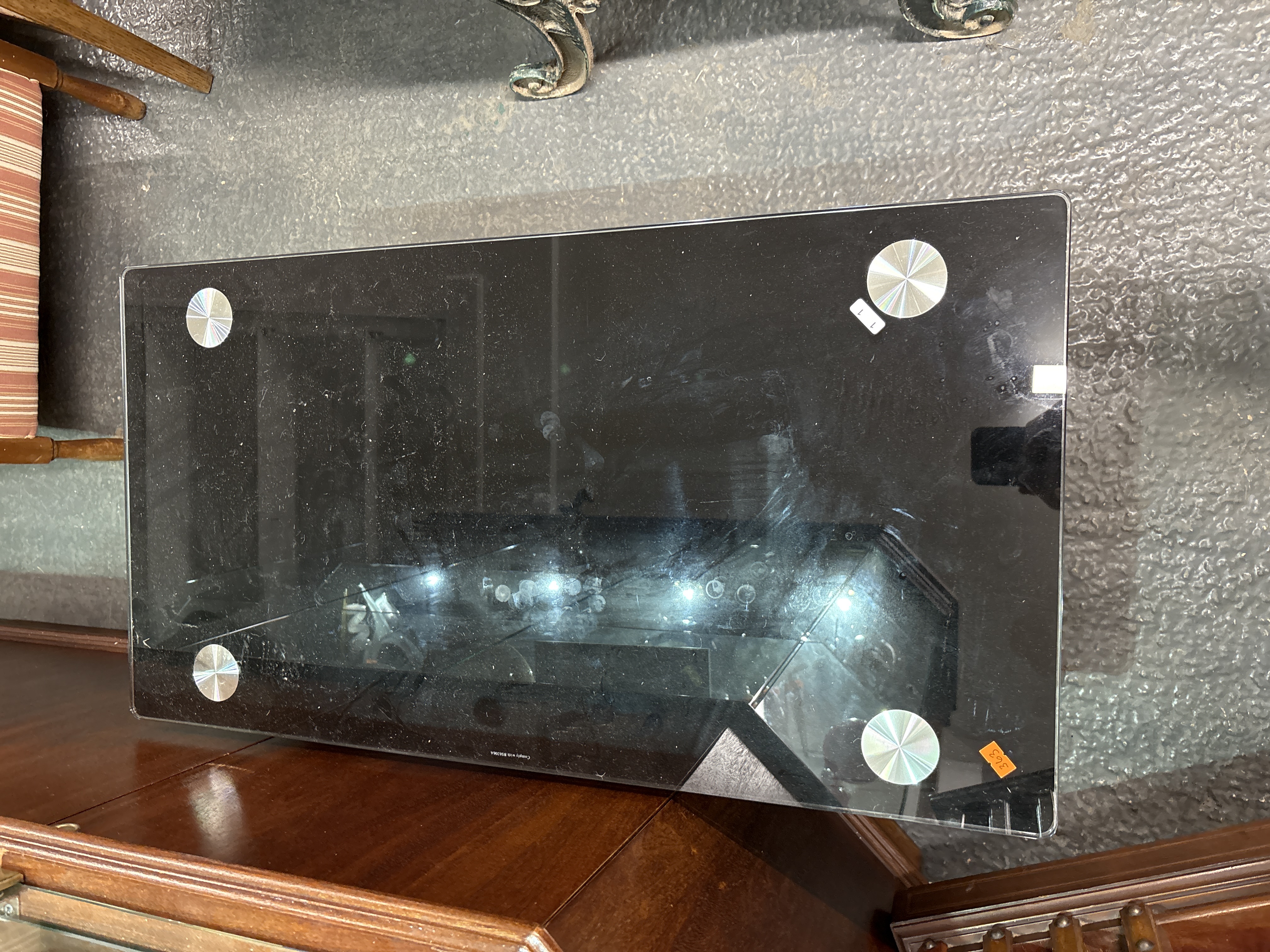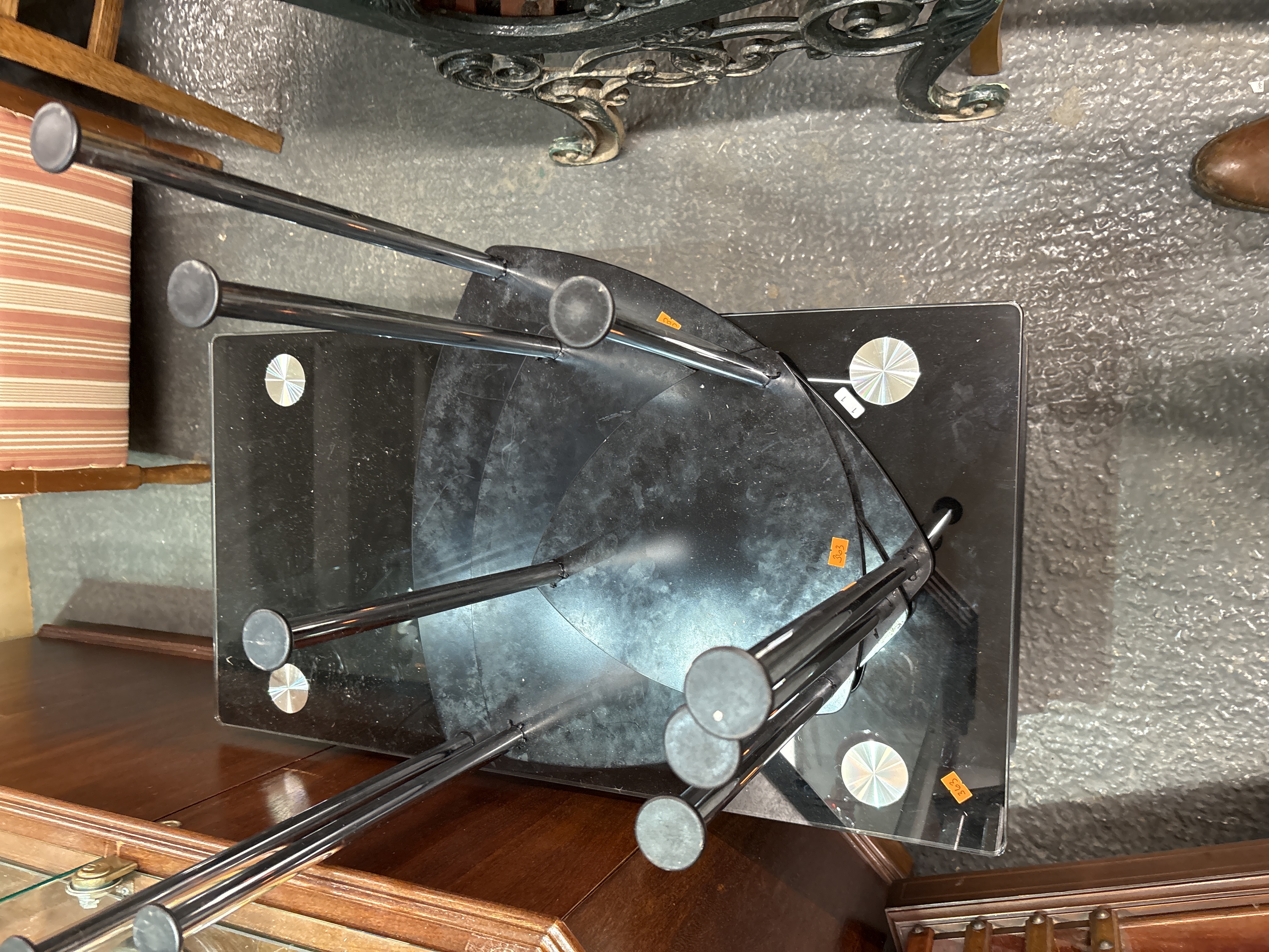The table is in used condition. Visible surface dust, smudges, and light scratches are present across the glass top. An orange lot sticker numbered 363 is adhered to the surface.