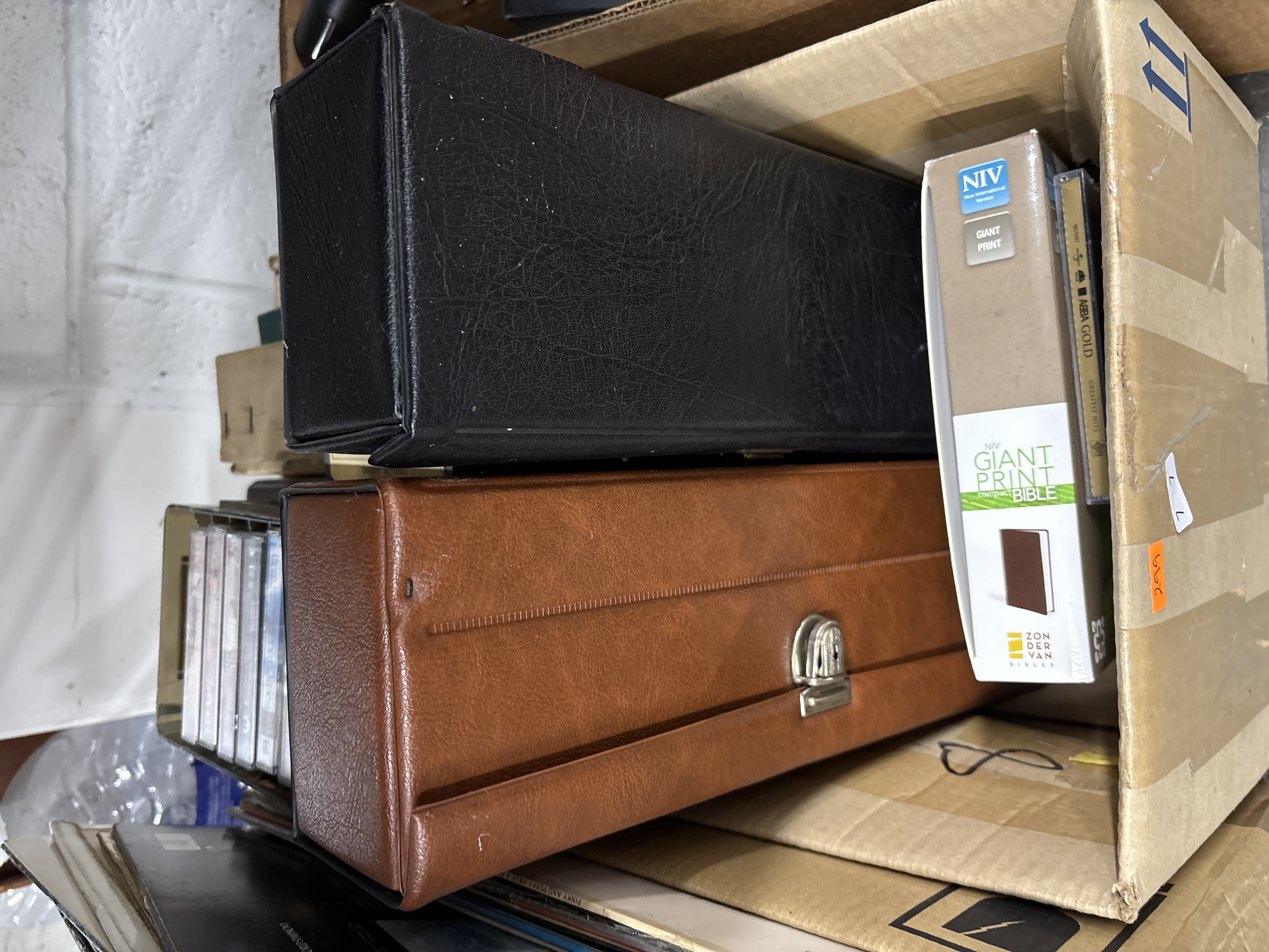 A collection of media storage and religious items. The lot includes two rectangular storage cases constructed from textured faux leather in black and brown, with the brown example featuring a metal flip-latch. Also included is an assortment of cassette tapes in a clear plastic storage rack, an ABBA Gold Greatest Hits compact disc, and a boxed Zondervan NIV Giant Print Compact Bible. The items are housed within a cardboard shipping box.