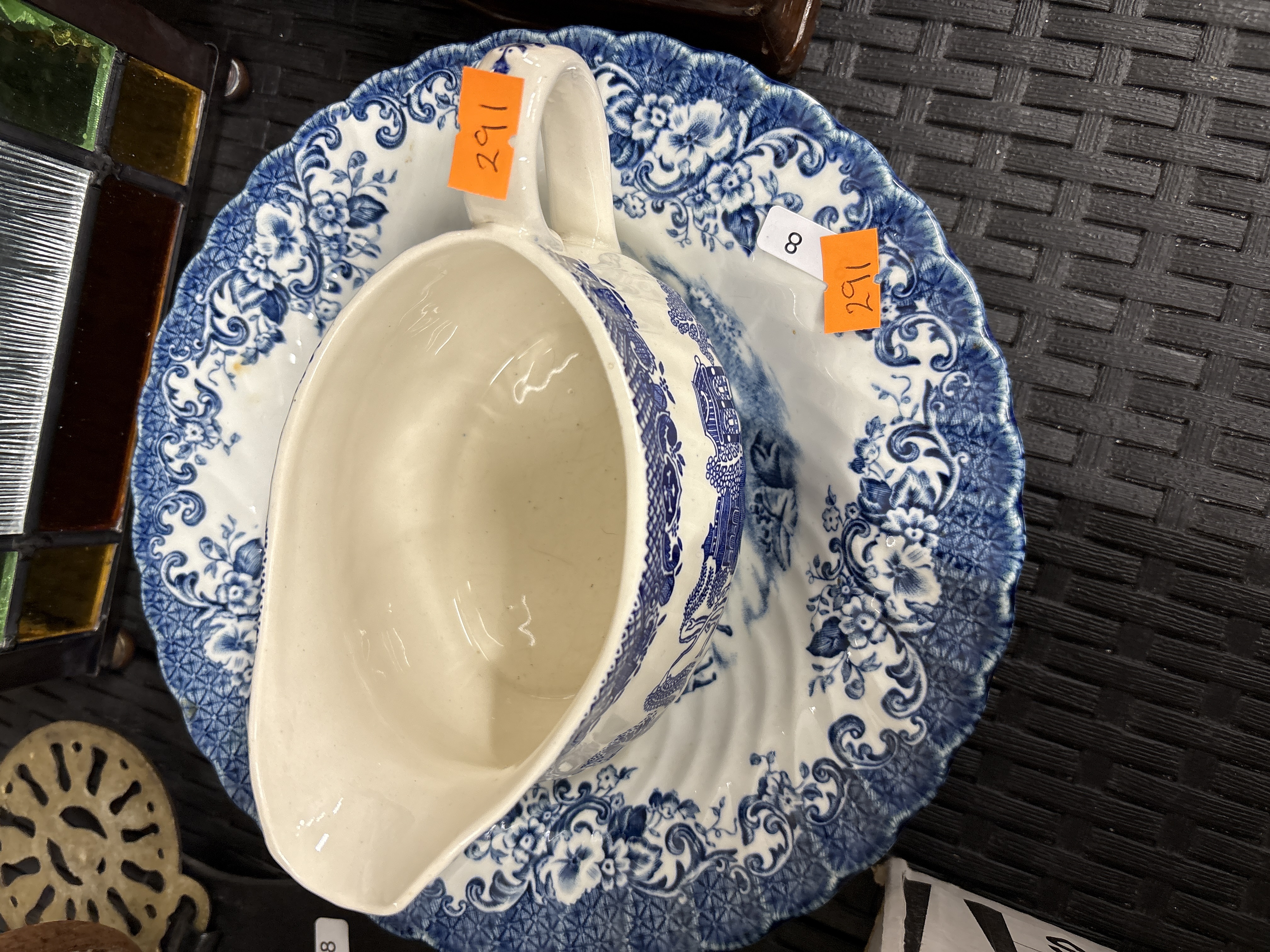 A Johnson Bros Coaching Scenes blue and white transferware ceramic gravy boat and matching underplate. The set is decorated with a traditional landscape scene featuring a coach and architectural elements, surrounded by intricate scrolled floral borders. The gravy boat is constructed with a prominent pouring lip and a loop handle, while the underplate features a scalloped and moulded rim. Multiple orange auction lot stickers marked 291 and a small white sticker marked 8 are affixed to the surfaces.