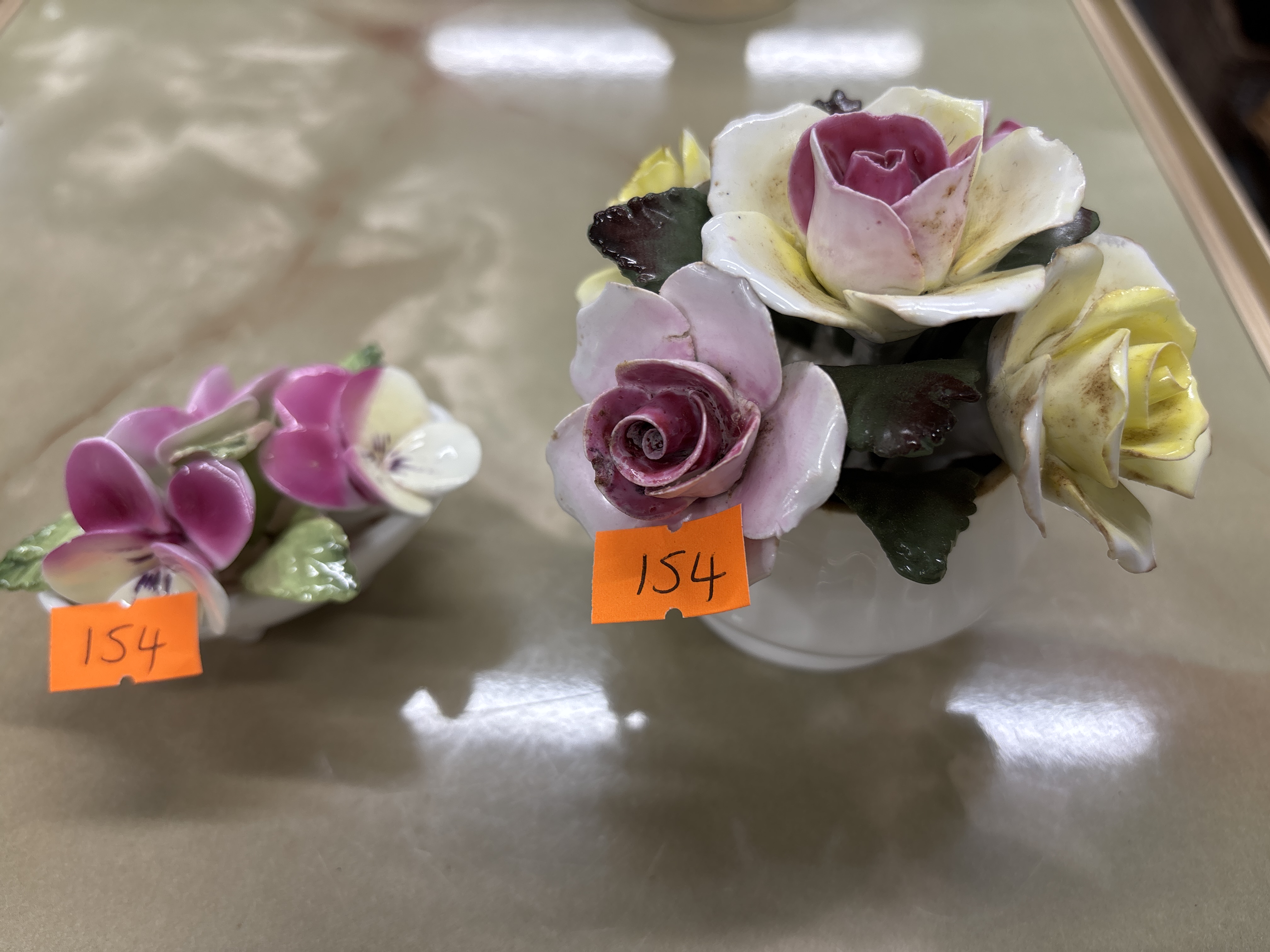 Two Aynsley fine bone china floral ornaments. The first arrangement consists of hand-modelled pink and cream pansies with green leaves. The second arrangement features a bouquet of pink, purple, and yellow roses with dark green foliage, presented in a white glazed ceramic vessel. Both items are manufactured from glazed bone china.