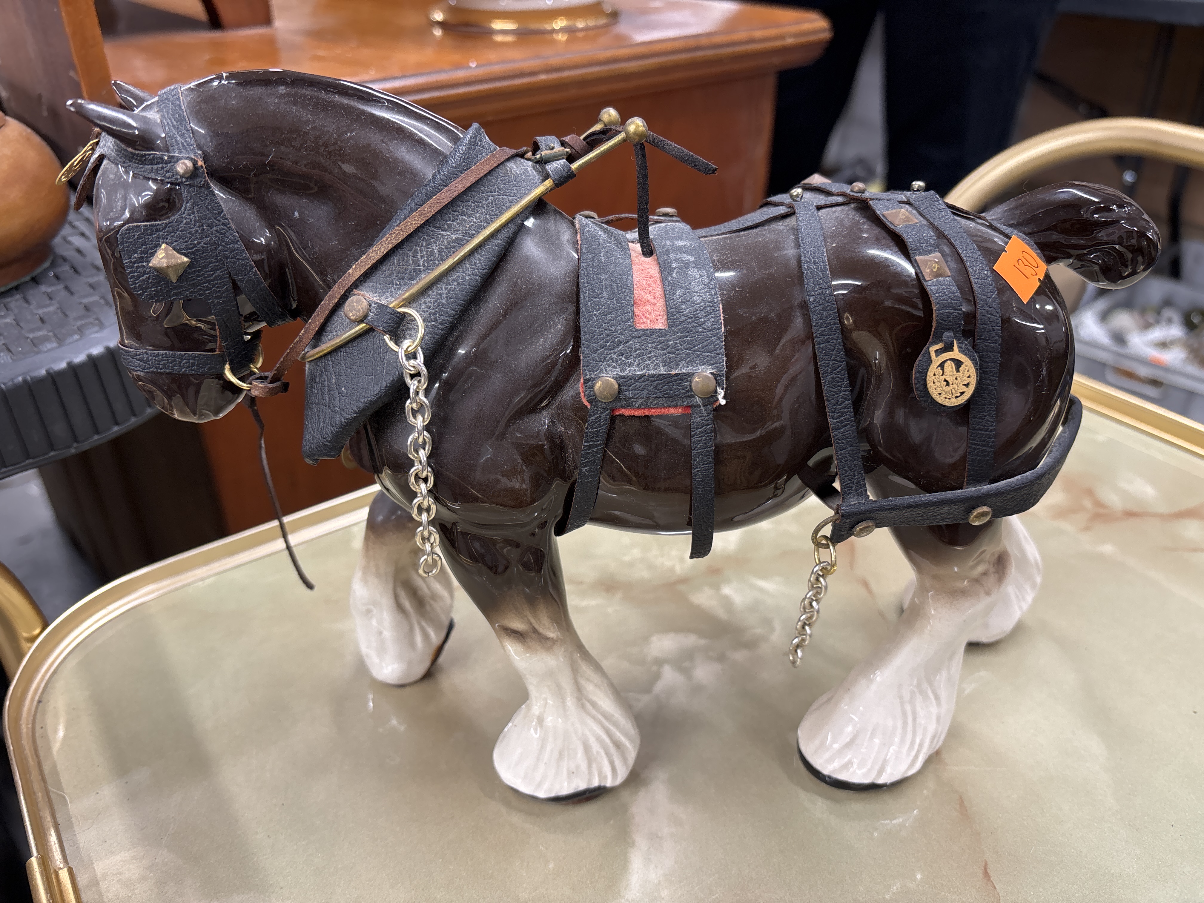 A 20th-century glazed porcelain figurine of a draught horse in the Staffordshire style. The figure is finished in a high-gloss dark brown glaze with contrasting white feathered hooves and facial markings. It is dressed in a detailed ceremonial show harness comprising black textured strapping, brass-toned studs, and metal chain accents. A circular brass-toned medallion featuring a heraldic crest is attached to the hindquarters.