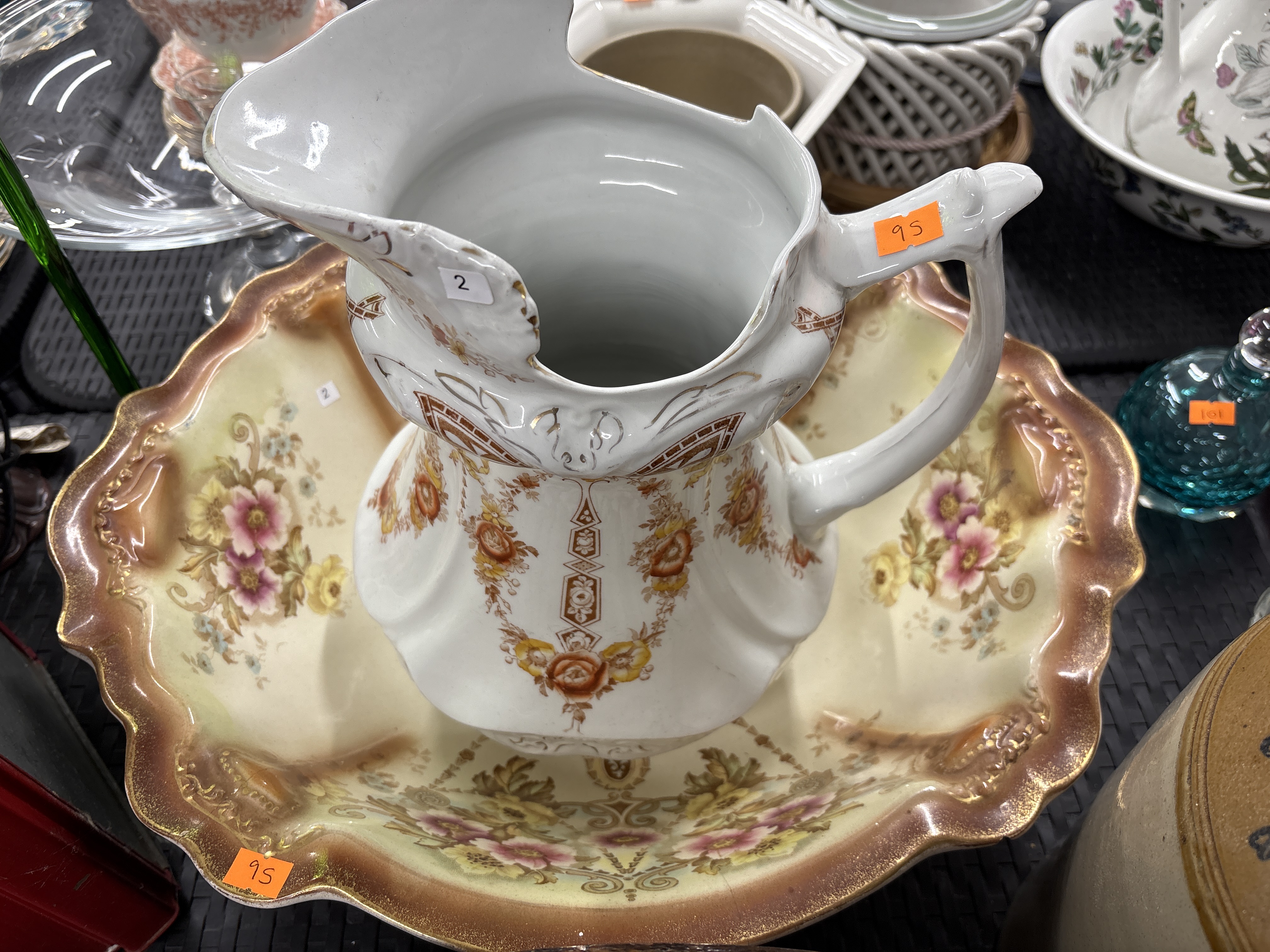 A ceramic pitcher and washbasin set featuring Victorian-style transfer-printed floral motifs in shades of pink, yellow, and orange. The decoration includes scrollwork and geometric border accents. The basin is constructed with a scalloped, moulded rim finished with a metallic-toned gradient. The pitcher is of a baluster form with a scrolled handle. Both pieces show numbered inventory stickers.
