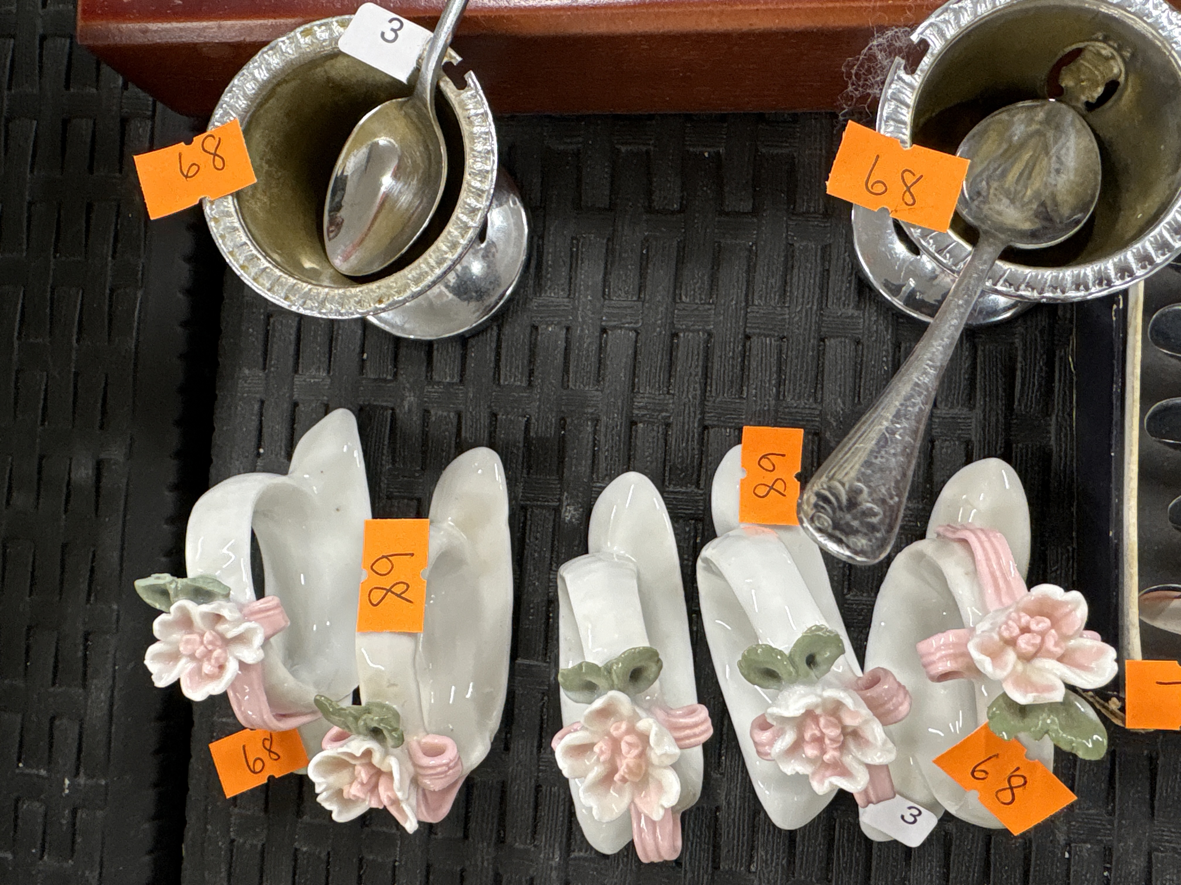 A collection of decorative tabletop items comprising several white glazed porcelain napkin rings and polished metal condiment cellars with accompanying spoons. The napkin rings feature hand-applied three-dimensional pink and white floral motifs with green leaf accents and pink ribbon-style detailing. The metal vessels are of footed form with gadrooned rims and are paired with small salt or condiment spoons. Several items bear orange and white inventory tags with the numerals 68 and 3.