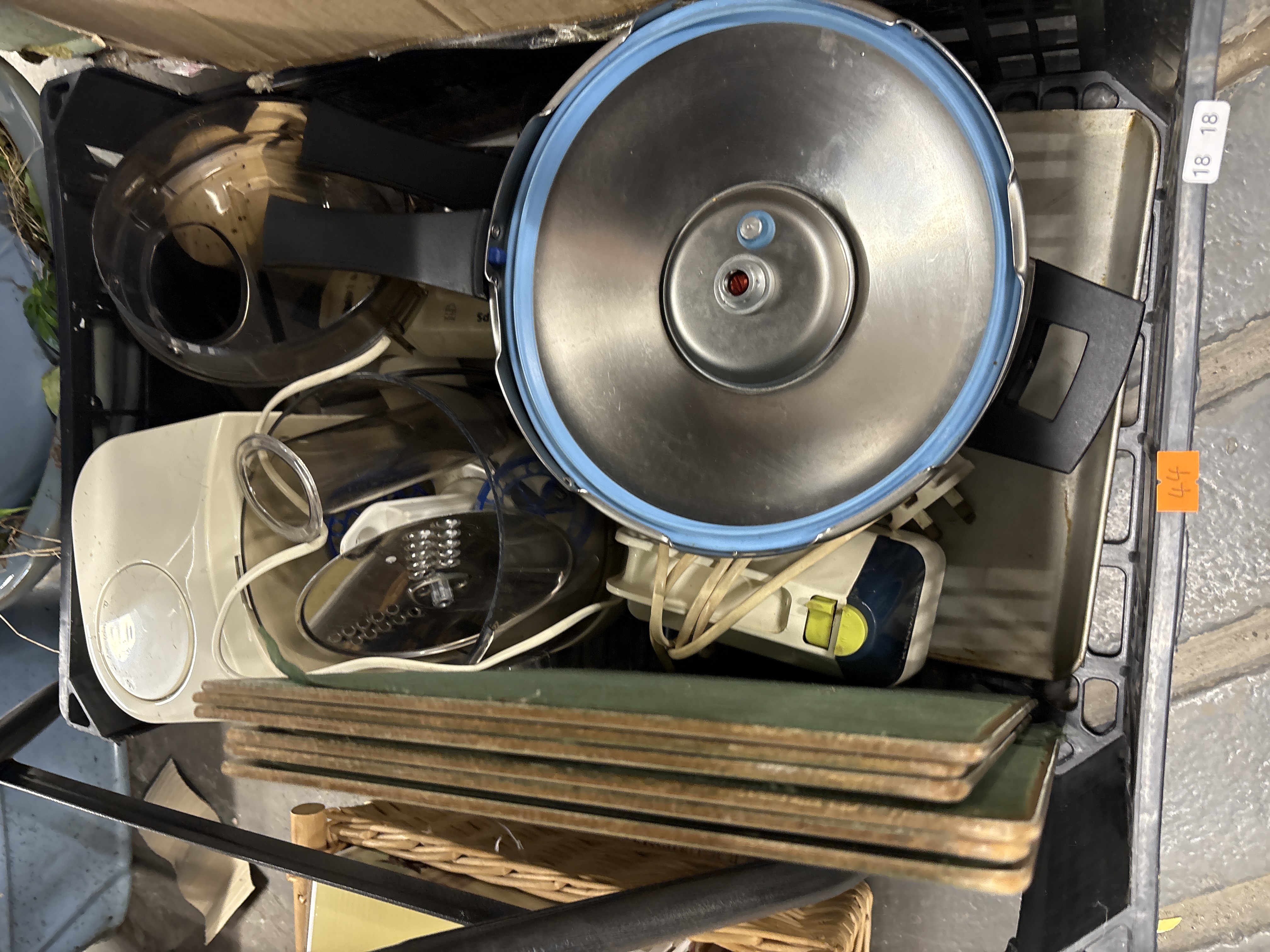An assortment of kitchen appliances and household items. The lot includes a stainless steel pressure cooker lid fitted with a blue rubber gasket and black composite handles. Featured electric food preparation equipment includes a Philips food processor with an off-white plastic base, clear mixing bowl, and a stainless steel grating disc, as well as a handheld electric mixer. The collection also contains several green rectangular placemats with cork backing. Items are presented within a black plastic transport crate.