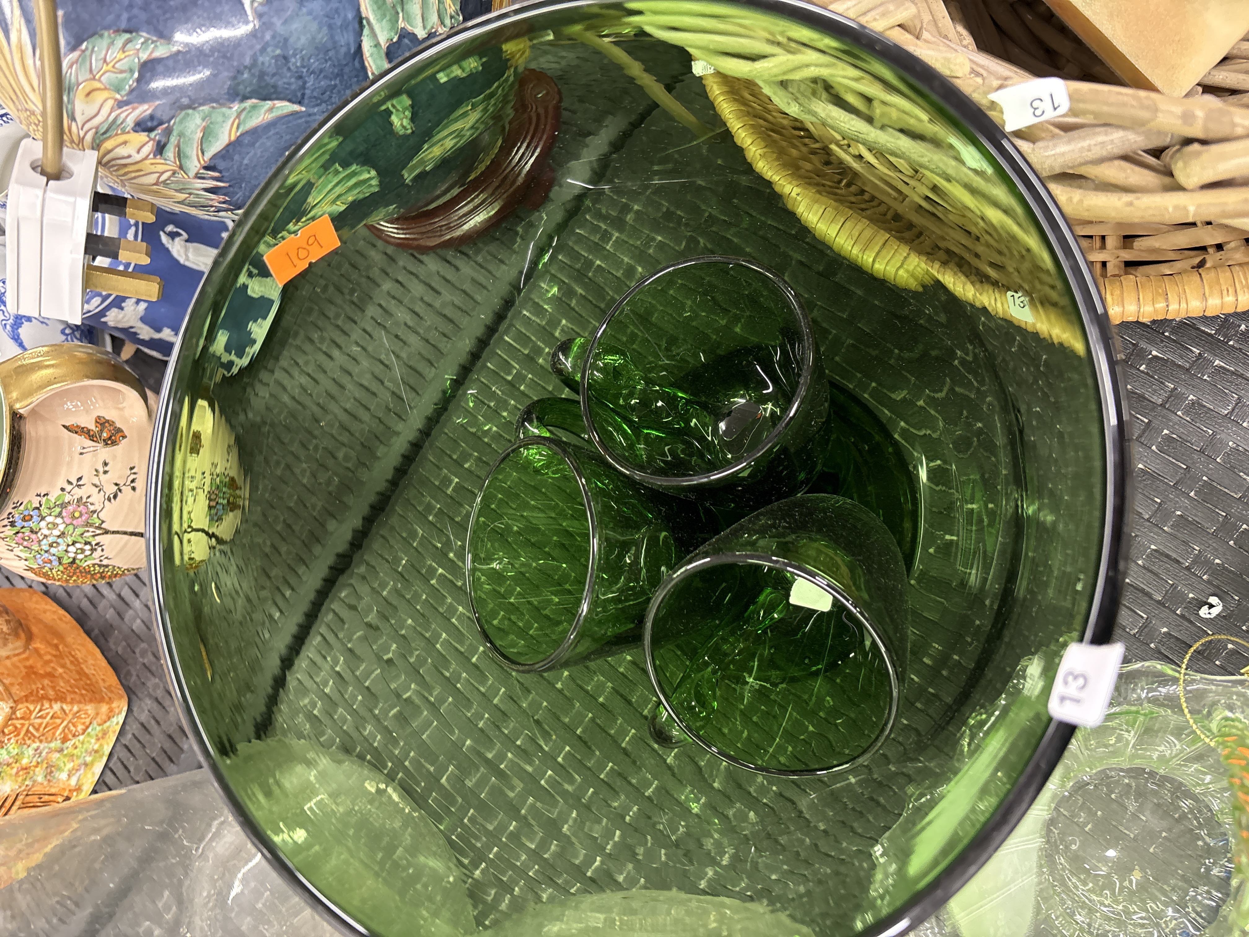 A set of mid-20th-century emerald green transparent glassware, identified as Anchor Hocking in the Forest Green pattern. The collection consists of a large, deep circular bowl and matching handled cups. The bowl features a moulded basketweave or cross-hatched textured pattern to the interior base, while the exterior walls and the accompanying cups are finished with a smooth surface. No maker’s marks are visible on the bodies of the items. The lot includes adhesive auction labels with handwritten numbers 13 and 109.