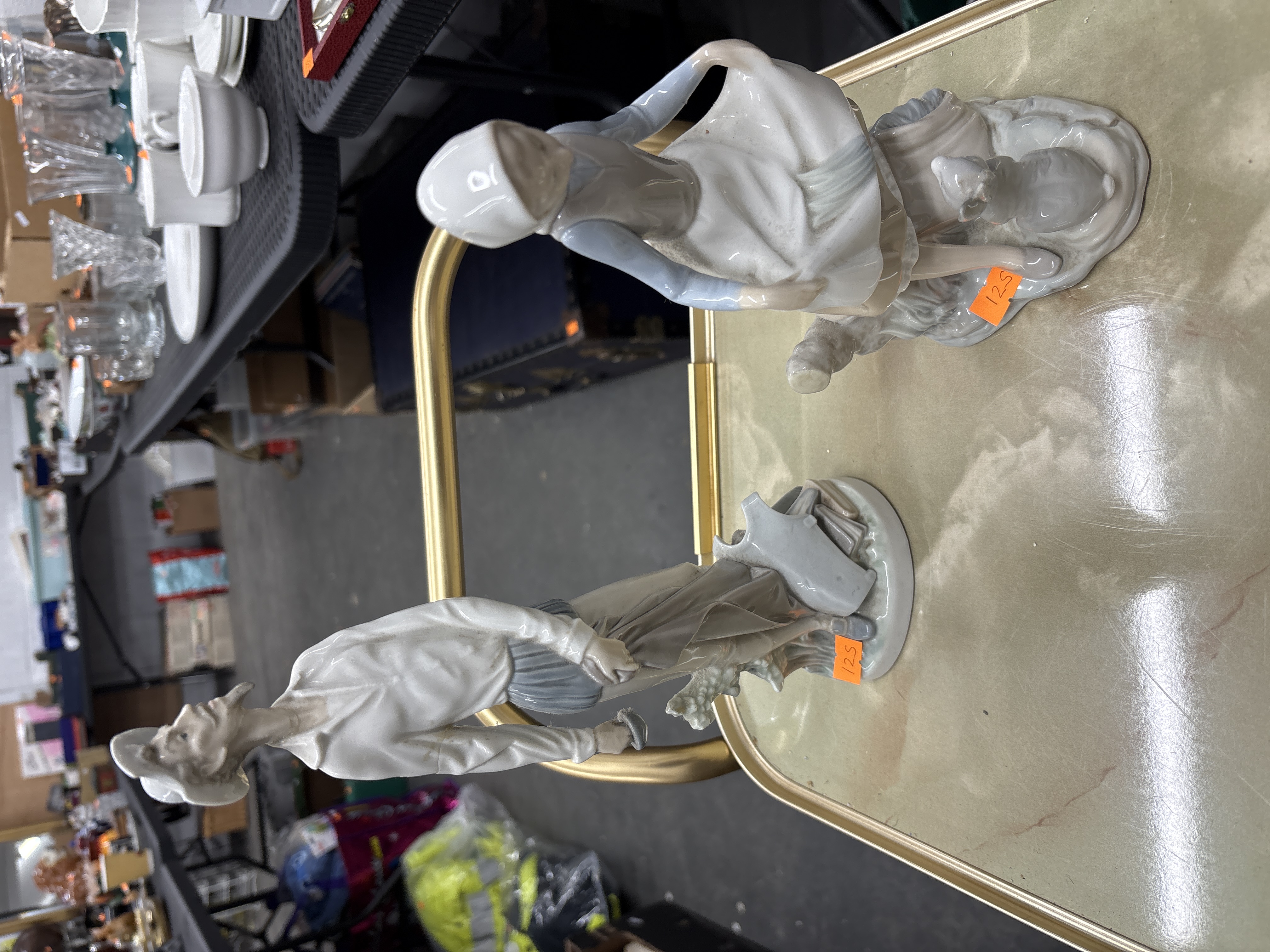 The figurines are in good overall condition with no visible chips, cracks, or evidence of restoration. Small orange adhesive labels are present on the bases.