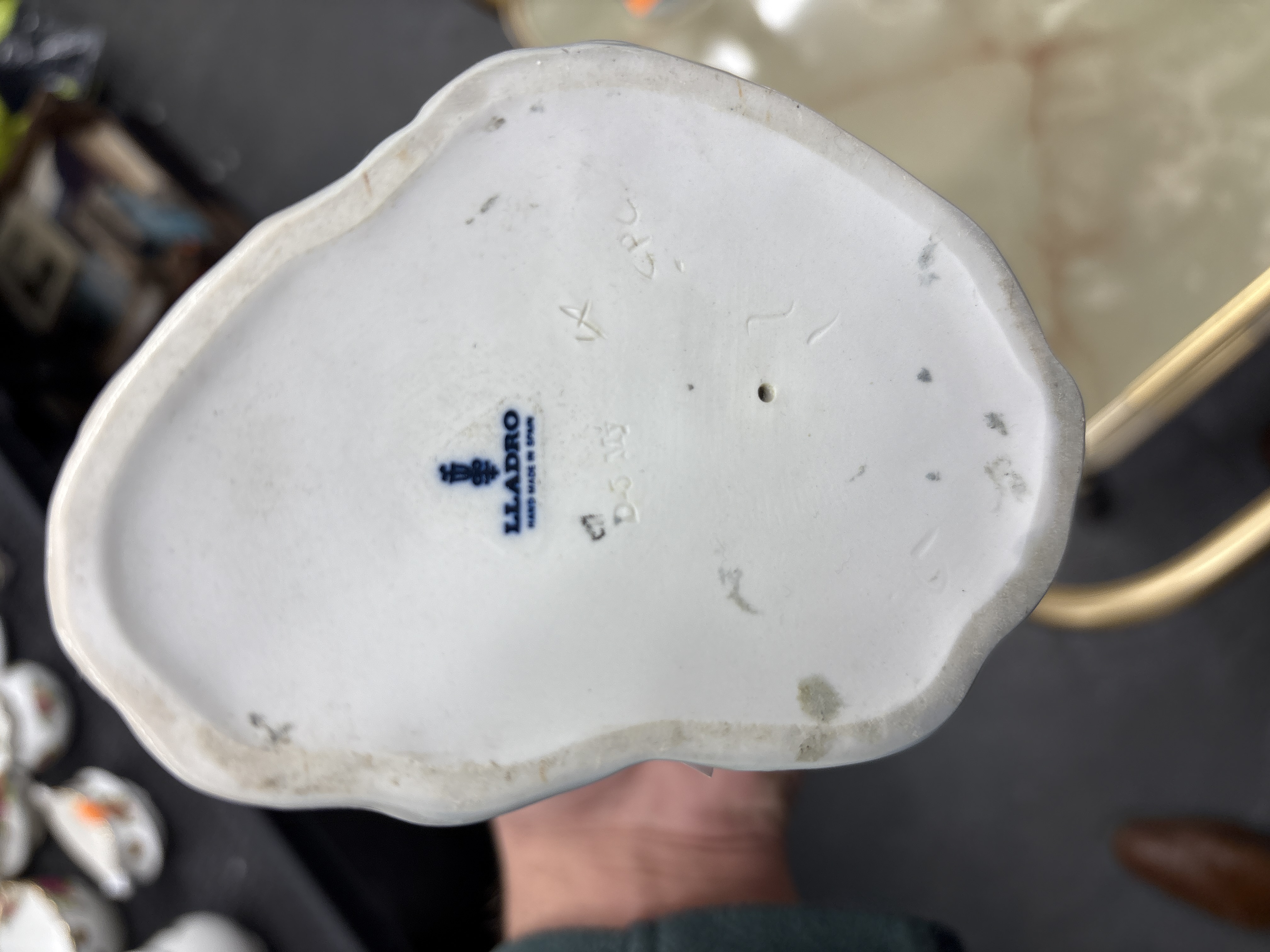 A pair of Lladró glazed porcelain figurines depicting pastoral scenes. The first figurine features a seated girl wearing a headscarf and dress, accompanied by a small goat on a rocky base. The second figurine depicts a standing boy wearing a wide-brimmed hat, holding a bunch of grapes and leaning against a tree stump. Both pieces are executed in a characteristic elongated style with a muted colour palette of grey, blue, and white glazes. The base of the figurine displays a blue printed factory mark with a stylized bell icon above the text LLADRÓ and HAND MADE IN SPAIN. Several incised and impressed marks are also present, including D-5 My, X, CP, and a letter E within a small square.