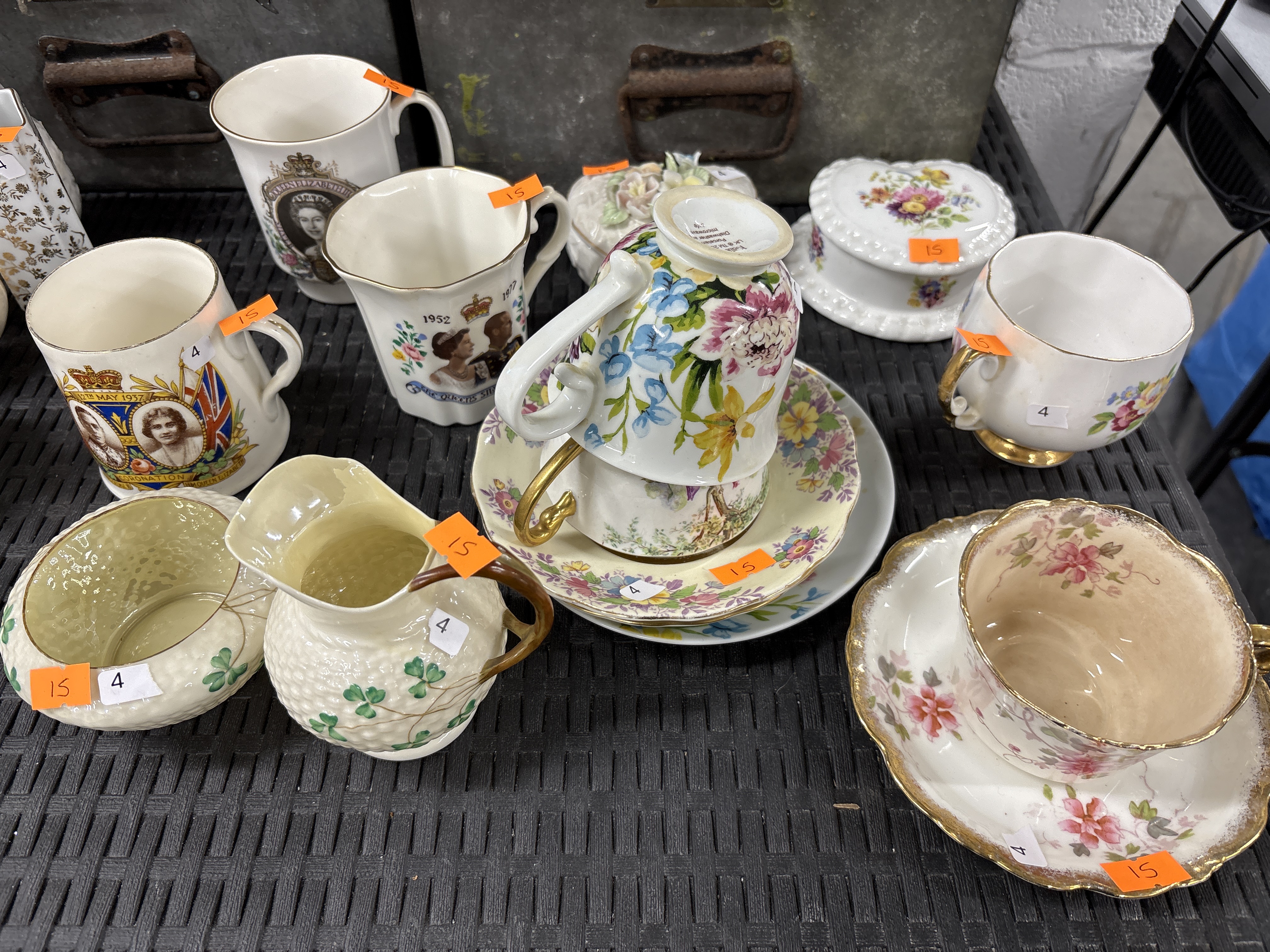 A collection of ceramic wares comprising commemorative mugs, teacups, saucers, and decorative items. The lot includes three commemorative mugs: one porcelain example for the Coronation of King George VI and Queen Elizabeth dated 12th May 1937 featuring transfer-printed portraits and heraldic motifs; one fine bone china mug for the 1977 Silver Jubilee of Queen Elizabeth II with portraits of the Queen and the Duke of Edinburgh; and one porcelain mug with a portrait of Queen Elizabeth II within a decorative cartouche.