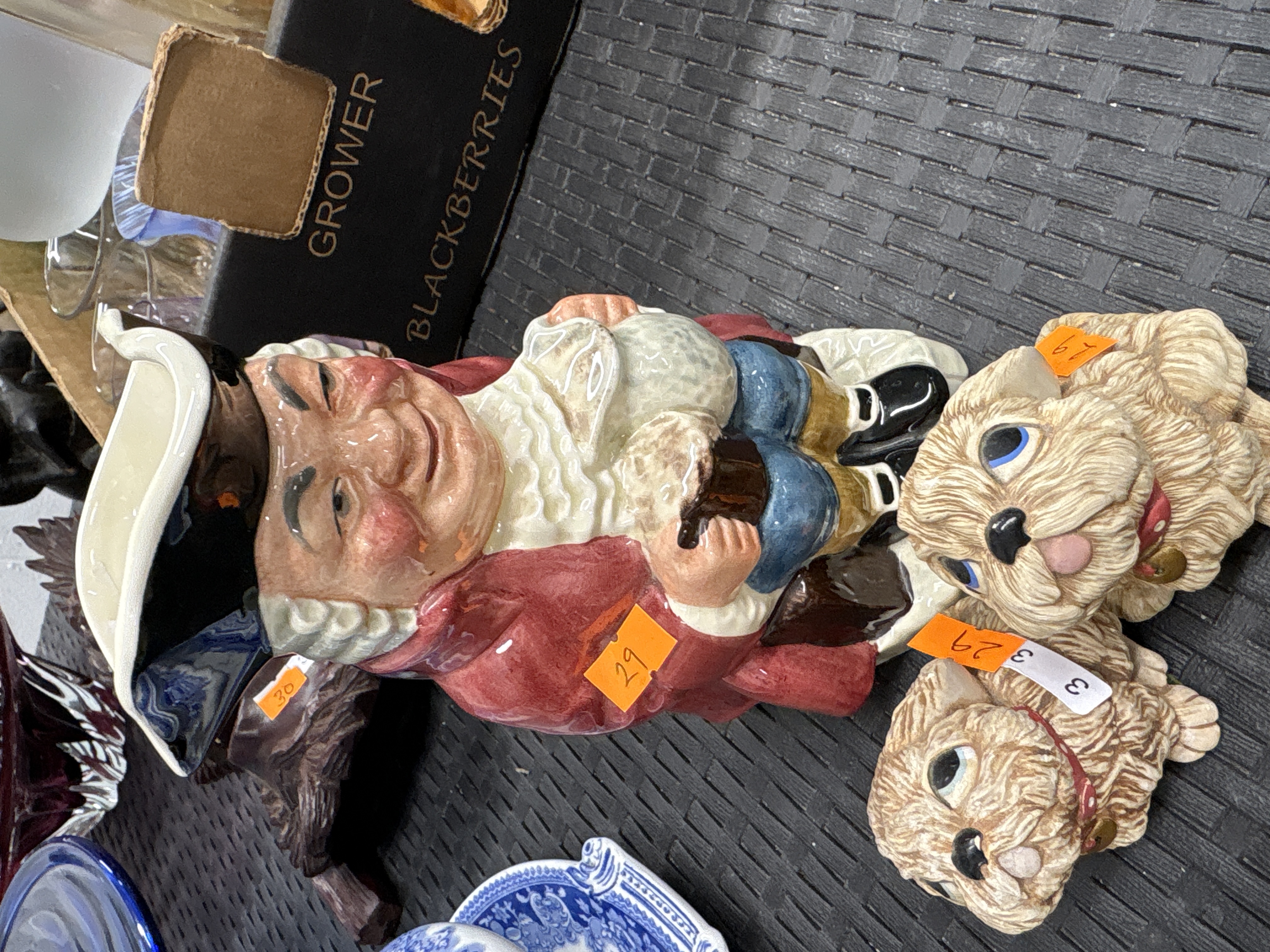 A collection of three glazed ceramic figurines. The group includes a Toby-style figure of a seated man dressed in 18th-century attire, featuring a black tricorn hat with white trim, a red frock coat, white cravat, blue breeches, and yellow stockings. The figure is depicted with a jovial expression and holds a brown tankard with a frothy white head. Also included is a pair of dog figurines, possibly representing Yorkshire Terriers, with textured tan-coloured fur, blue eyes, and red collars with gold-coloured bells. No maker’s marks or backstamps are visible on the exterior or visible bases of the items.