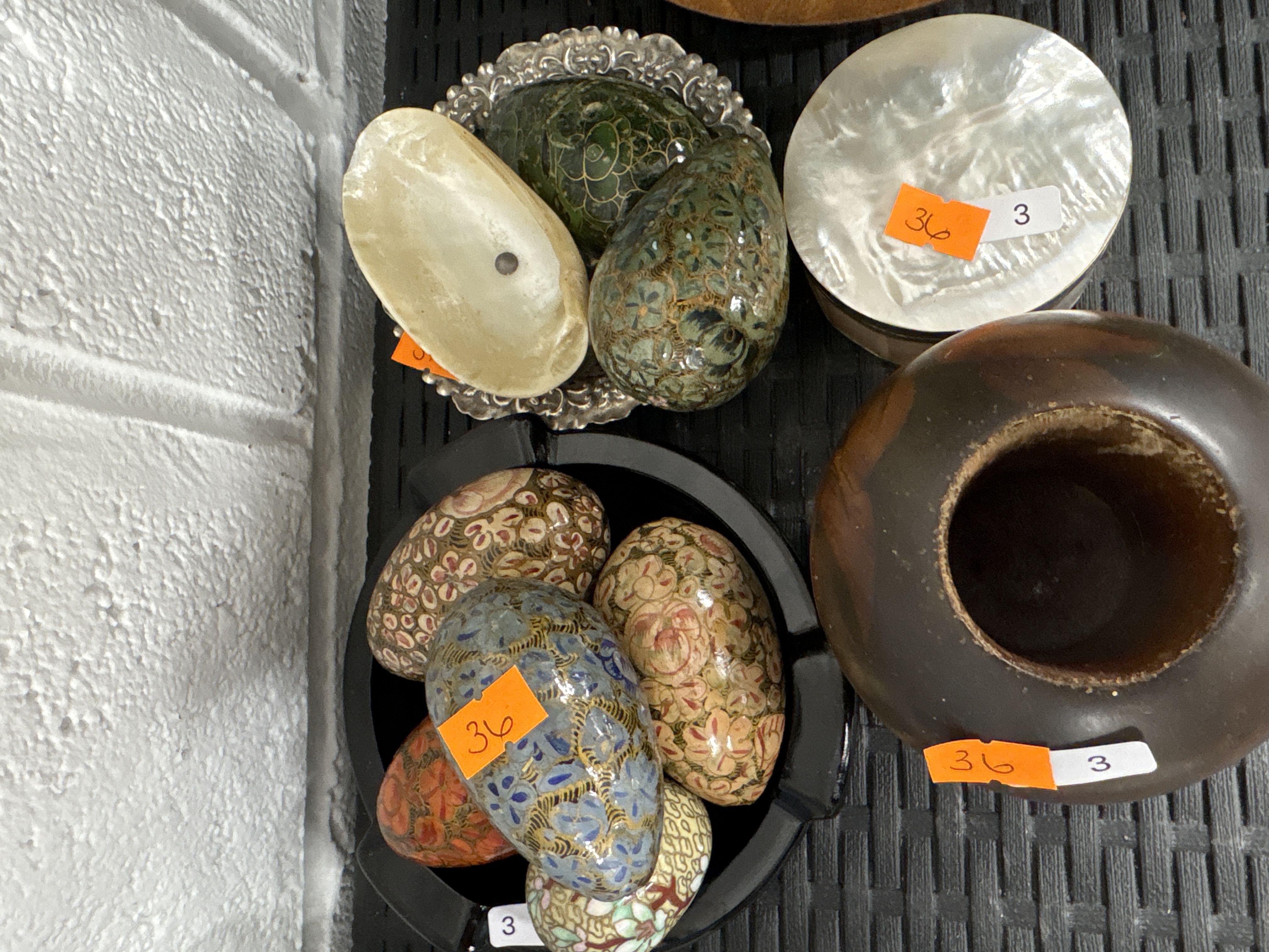 A collection of decorative objects comprising several hand-painted eggs, featuring dense floral and scrollwork motifs in various colours including blue, cream, and red, in the style of Kashmiri papier-mâché. The group also includes polished stone eggs with mottled green and brown surfaces, and a single pale, hollowed shell-form object. Accompanying these is a circular lidded box, the top decorated with iridescent mother-of-pearl inlay in a radiating pattern. Also present is a small white-metal dish with a scalloped, foliate-moulded border and a dark, bulbous vessel with a wide aperture, featuring a matte finish and variegated brown tones, possibly turned wood or ceramic. The items bear orange and white auction lot labels with the numbers 36 and 3. No maker marks or signatures are visible on the exterior surfaces.