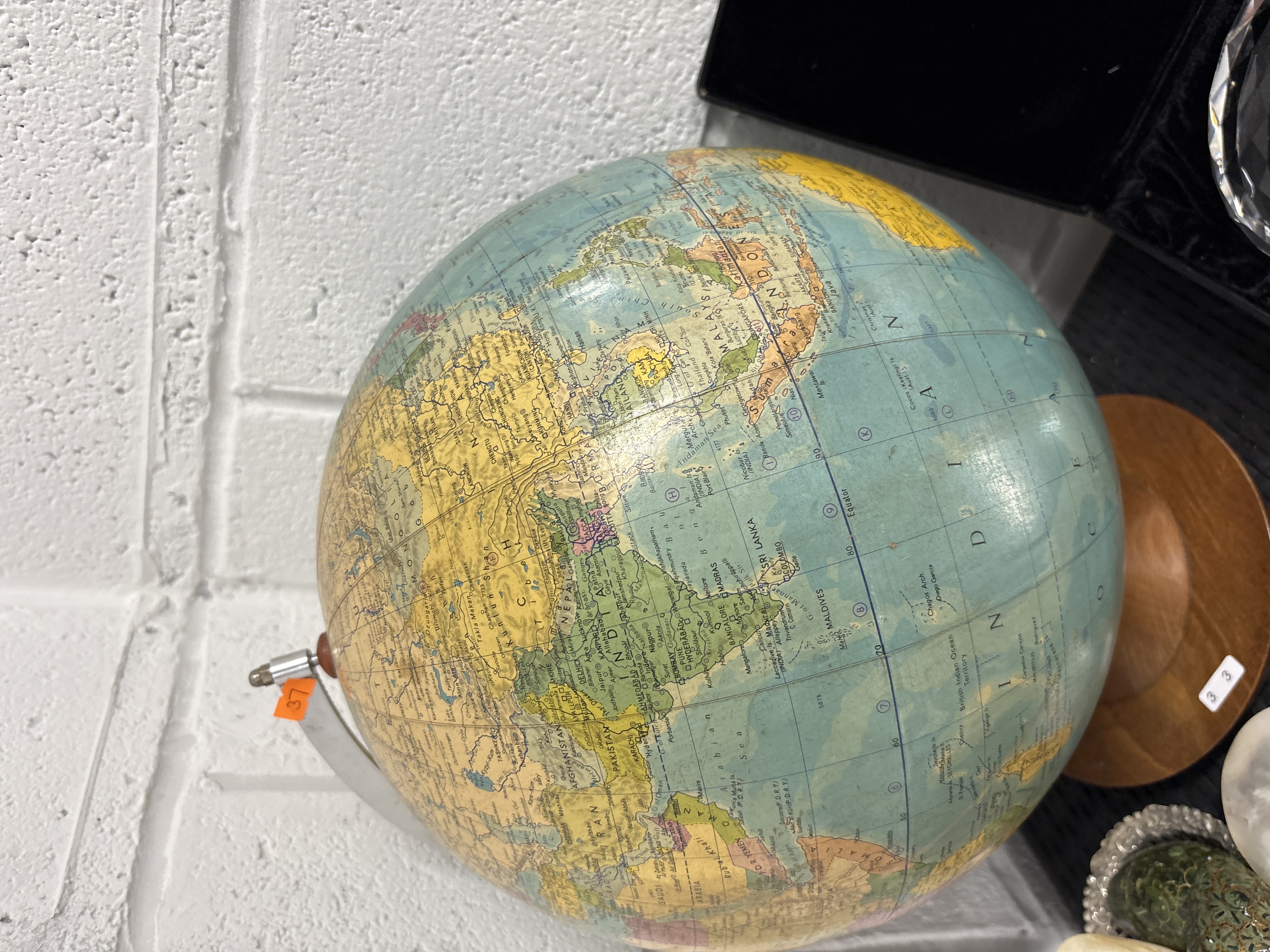 A terrestrial desk globe featuring a printed map surface, in the style of manufacturers such as Replogle or George F. Cram. The globe is mounted on a brushed metal semi-meridian and supported by a turned circular wooden base. The cartography is printed in English and includes geopolitical labels such as Sri Lanka, Bangladesh, and the Union of Soviet Socialist Republics, suggesting a production date between 1972 and 1991. The Indian Ocean is identified with prominent vertical lettering. No maker’s mark is clearly legible. The piece is fitted with a small orange auction tag marked 37 and a white lot sticker on the base marked 3 3.