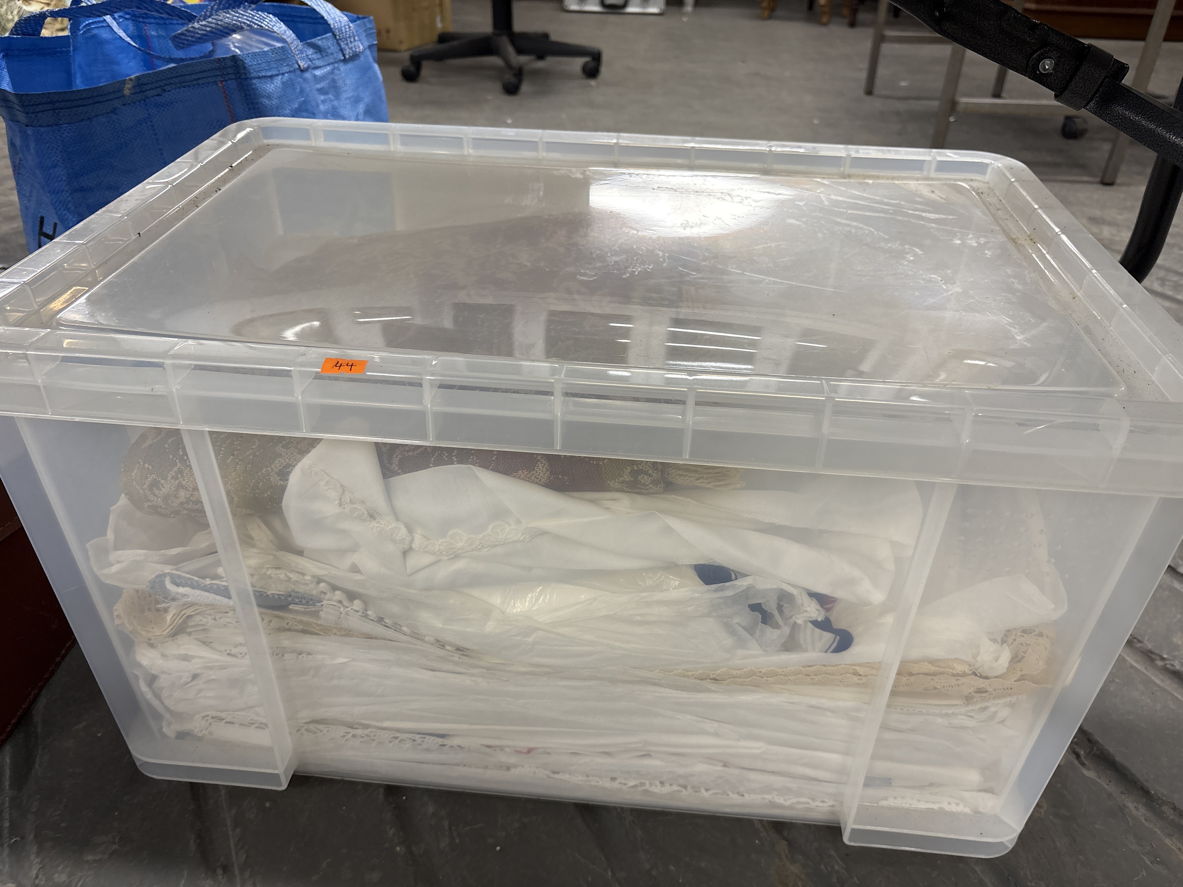 This lot comprises a collection of assorted vintage household textiles and linens, presented within a clear plastic storage container. The collection predominantly features white cotton and linen fabrics, including items such as tablecloths, table runners, and various decorative linens. Many pieces incorporate decorative lace, openwork, and crocheted borders with floral and geometric patterns. Also included is a heavier, machine-woven textile displaying a classical foliate or damask-style pattern in deep red and ochre tones. No manufacturer labels or maker marks are visible on the textiles through the container. A small orange sticker on the lid denotes the lot number 44.