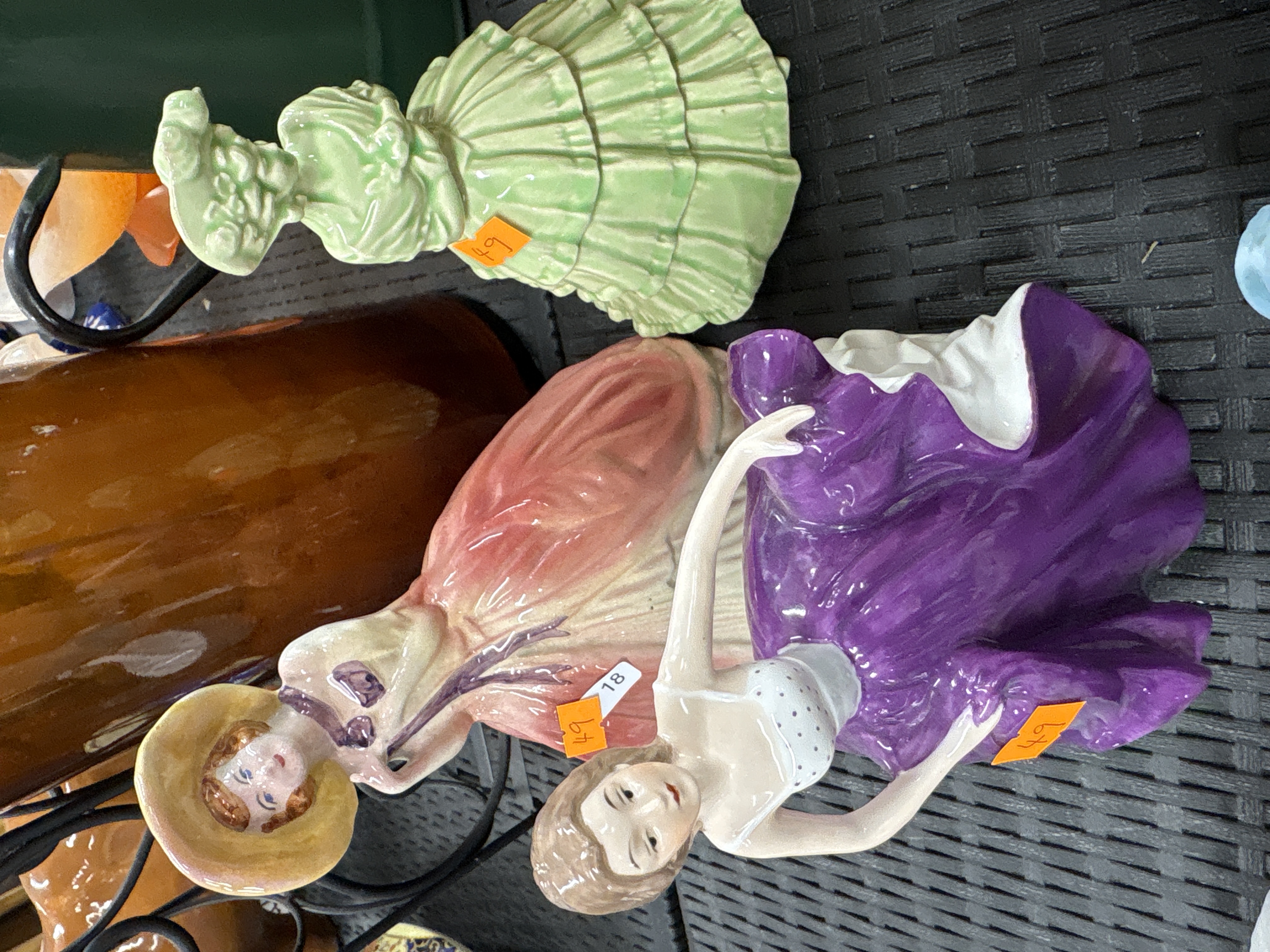 A collection of three glazed ceramic figurines attributed to Royal Doulton, depicting women in mid-20th-century attire from the Pretty Ladies series. The first figure is a monochromatic study in pale lime green glaze, resembling the Special Gift (HN4744) model, featuring a lady in a tiered and ruffled crinoline-style dress with a matching hat. The second figure is a polychrome model resembling the Fair Lady pattern, wearing a wide-brimmed yellow hat and a flowing pink gown. The third figure is a polychrome model in a dancing stance resembling the Top o’ the Hill pattern, wearing a voluminous purple skirt paired with a white bodice featuring a blue polka-dot pattern. No maker marks are visible on the upper surfaces; bases were not inspected. Each figure bears an orange adhesive label, and the pink-dressed figure includes an additional white label numbered 18.