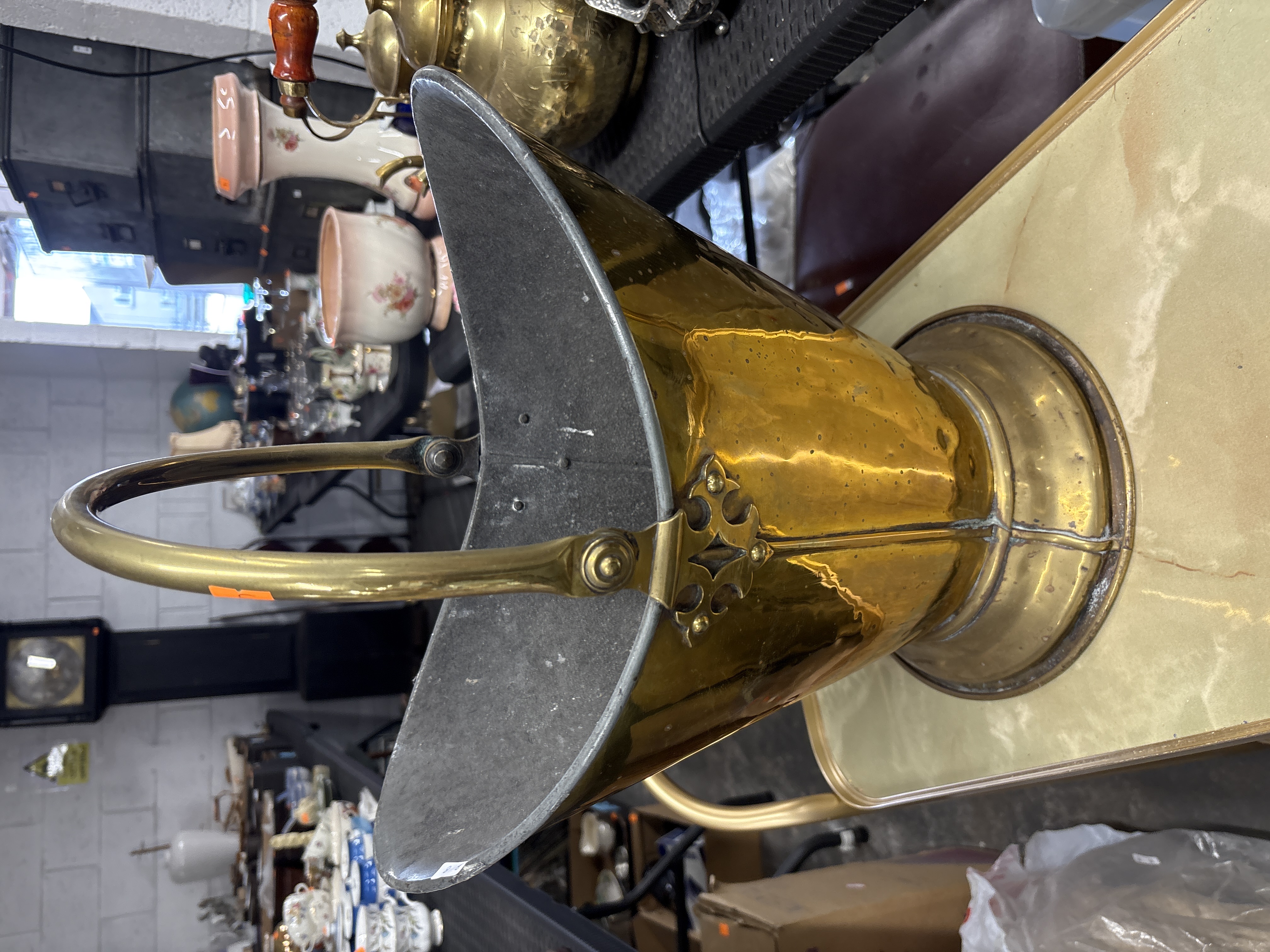 A Victorian style helmet-shaped coal scuttle constructed from sheet brass. The vessel features a visible vertical seam and a rolled rim, supported by a flared circular pedestal base. It is fitted with a substantial cast brass swing handle secured by decorative pierced mounts. The interior is finished with a grey-toned metal lining, likely zinc or galvanised steel. No maker’s marks or stamps are visible on the item.