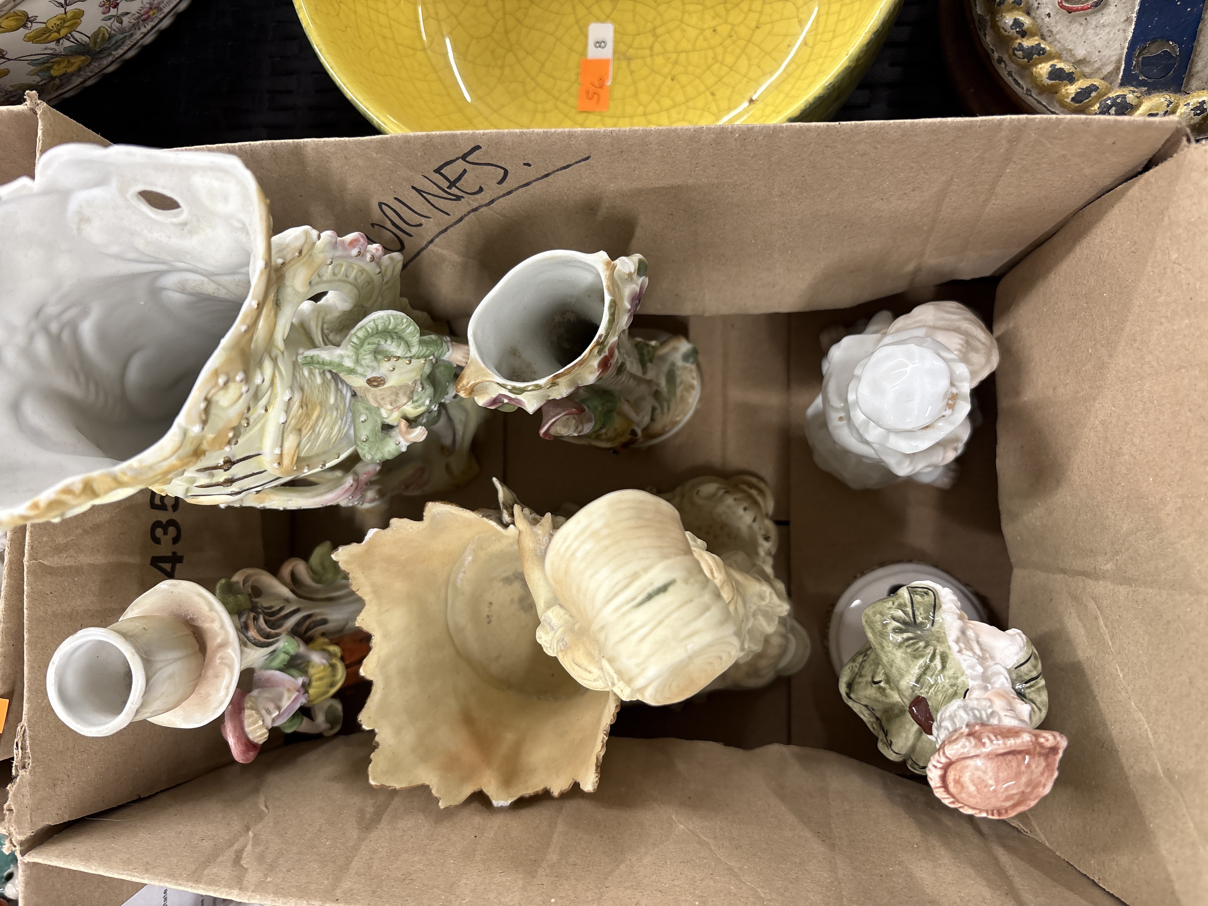A collection of six decorative ceramic and porcelain items, including figurines and spill vases in various European styles such as Rococo-revival and Art Nouveau. The lot features a large polychrome porcelain spill vase with elaborate scrollwork and a seated figure in 18th-century style dress, and a smaller companion spill vase with applied floral decoration in the style of Capodimonte. Also included is a figural candlestick holder with hand-painted floral accents, and a large cream-glazed figurine depicting a lady in a voluminous dress standing beside a flared, shell-shaped vessel, reminiscent of German Art Nouveau bisque ware from the early 20th century. The collection is further comprised of a small white glazed figurine of a seated cherub in the style of Camille Naudot and a small polychrome character figure wearing green garments and a wide-brimmed pink hat. The items are constructed from glazed porcelain and ceramic with various hand-painted and applied details. No factory or maker marks are visible from the provided perspective, though the styles are consistent with late 19th and early 20th-century German and English manufacturers.