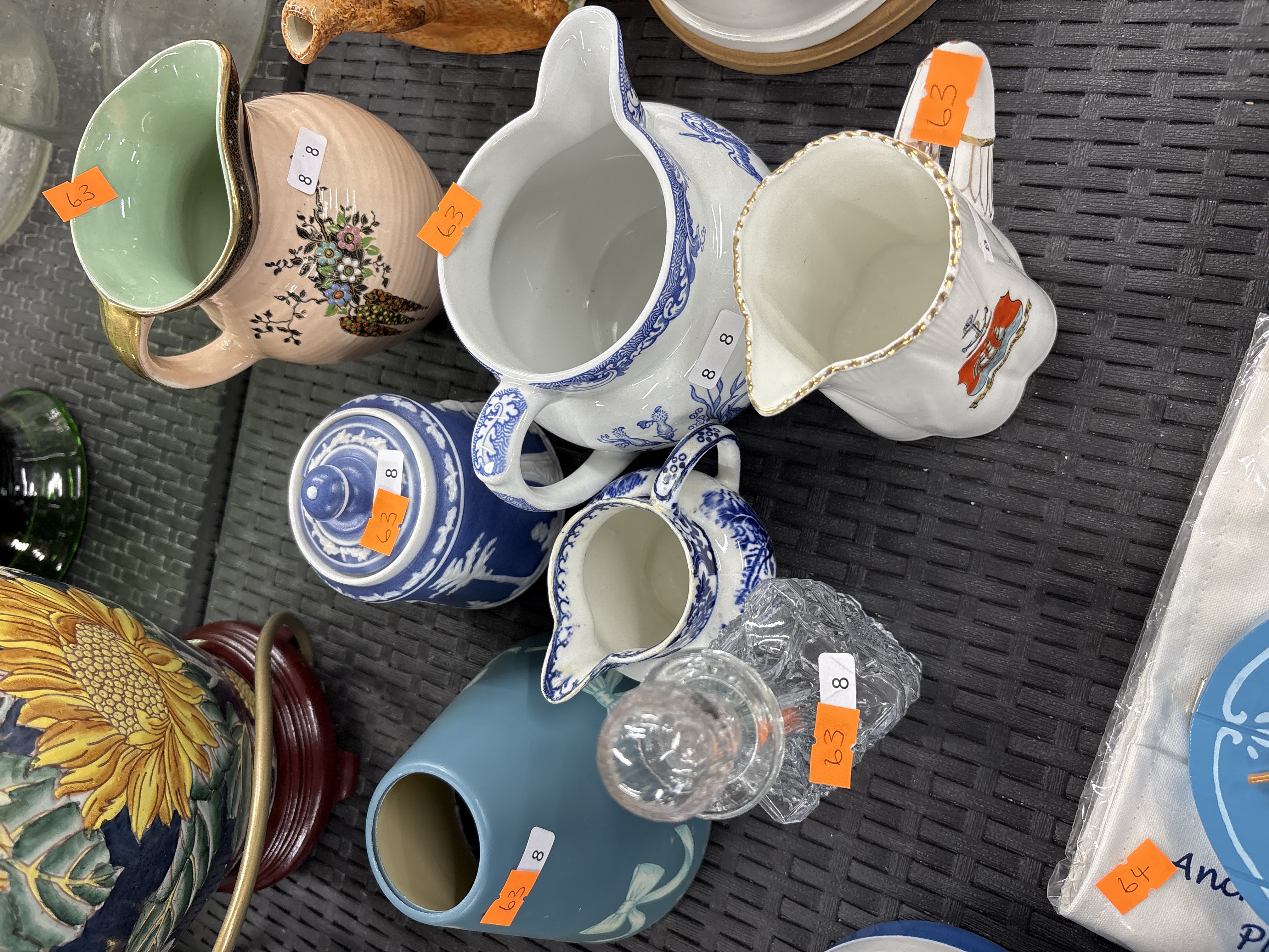 This collection consists of various decorative ceramic and glass items. A primary piece is a large earthenware jug decorated in the Blue Italian transfer-printed pattern, attributed to Spode, featuring a scrolled handle and a scenic landscape. The lot includes a peach-glazed bulbous jug with a polychrome floral spray and pheasant design, a gilded handle, and a mint green glazed interior. Also present is a small porcelain cream jug with a fluted body and a transfer-printed heraldic crest featuring a red shield and a ship. A cylindrical blue stoneware lidded pot in the Jasperware style displays white sprigged relief decoration of classical motifs. The collection further includes a small blue and white transfer-printed creamer with floral motifs, a contemporary matte blue glazed vase with a white relief-moulded ribbon motif, and a rectangular pressed glass decanter with a faceted stopper. A large earthenware planter in the Majolica style with high-relief sunflower decoration is partially visible.
